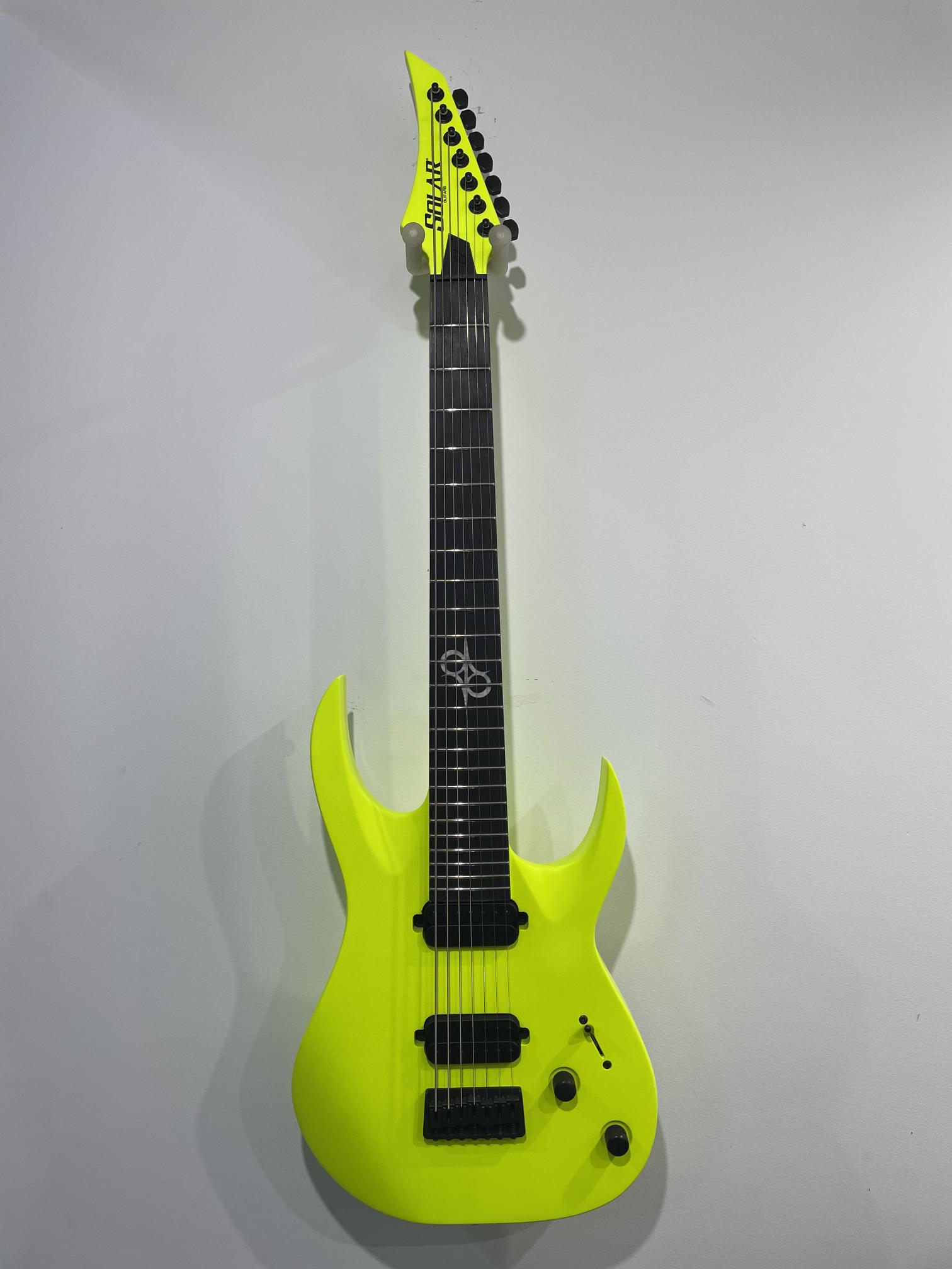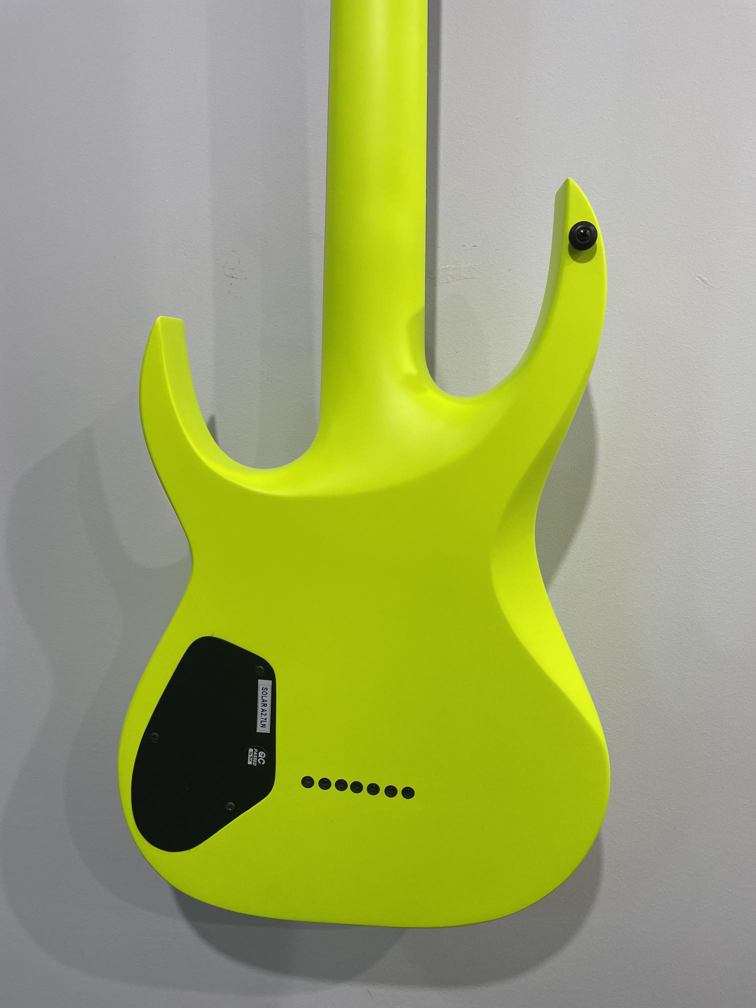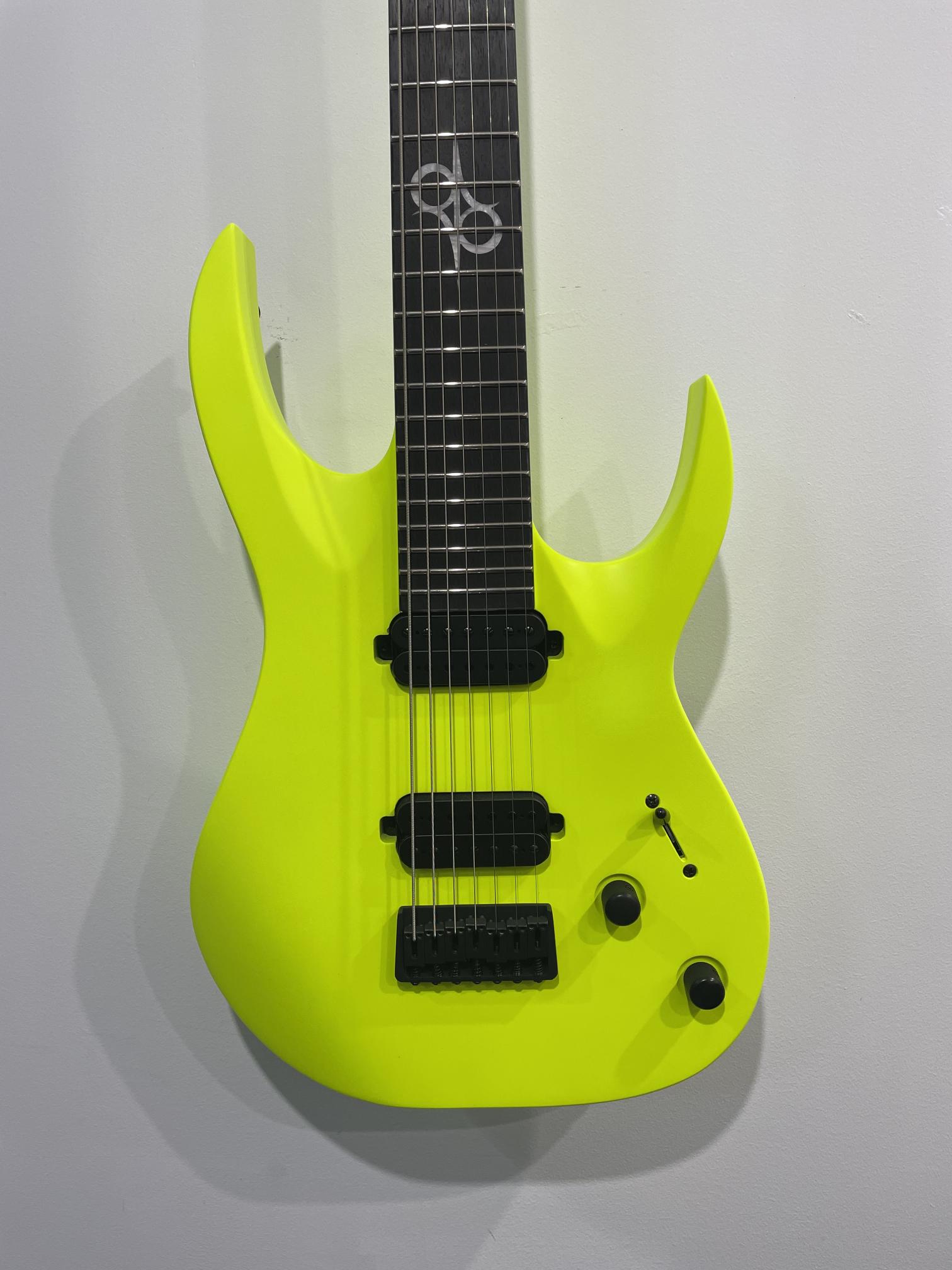 This Type A2.7 - lemon neon matte is a seven-string guitar boasts stealth looks, a distinctive cutaway scoop and a remarkable feature set, making it a precise, professional instrument suitable for both stage and studio work. It comes loaded with a reliable string-through-body hardtail bridge and Duncan Solar pickups that provide a full spectrum of tonal options, from organic clean to heavily overdriven, all with fluid sustain and maximum clarity. The Type A2.7 features a set-thru neck/body joint design with 26.5” scale, a mahogany body, a fast, thin, comfortable maple neck and a rosewood fingerboard with 24 super-jumbo frets. This guitar includes Solar 18:1 tuners, PPS nut, black matte hardware, five-way blade pickup switching and full access neck. Available in lemon neon matte finish.