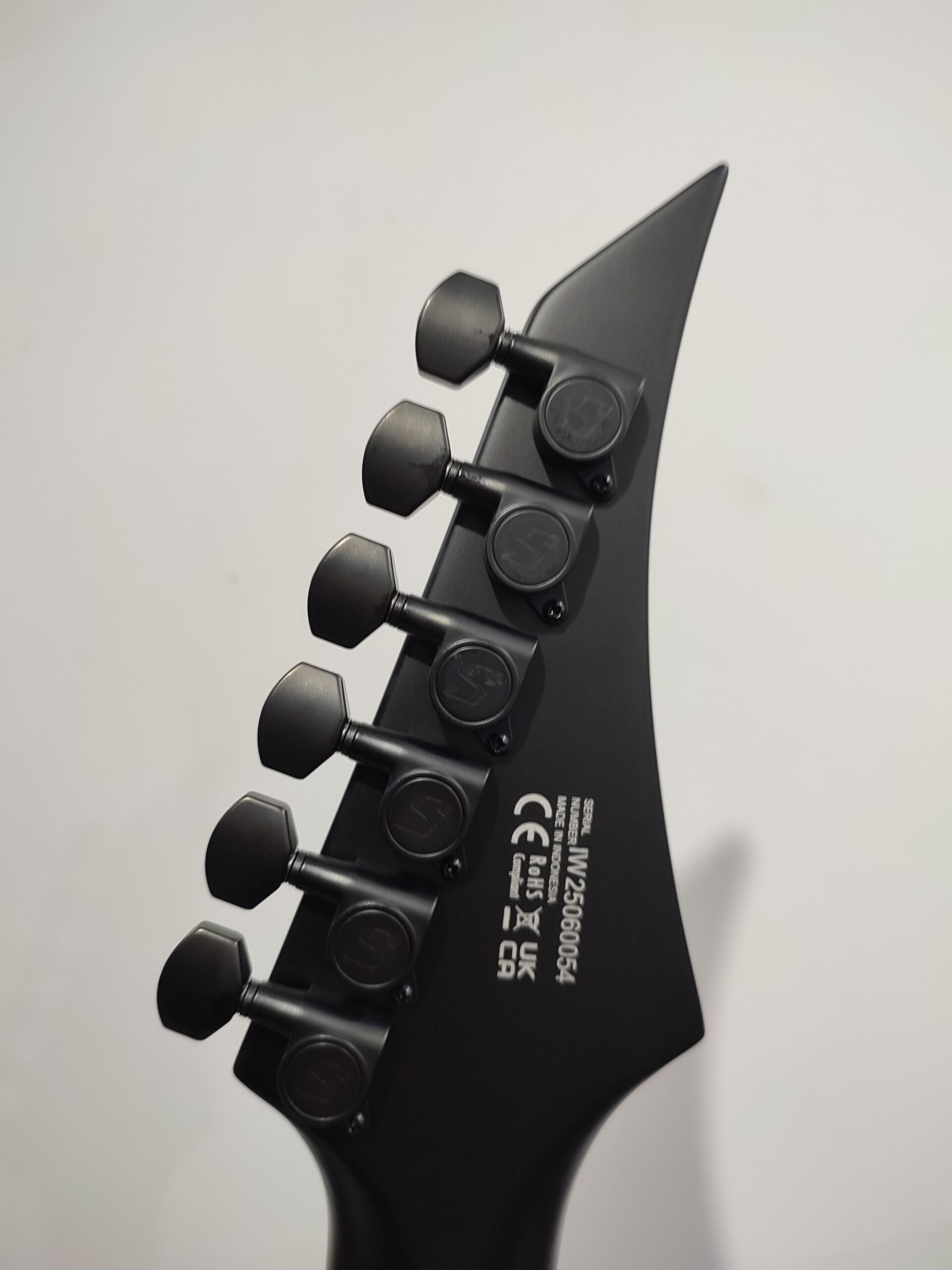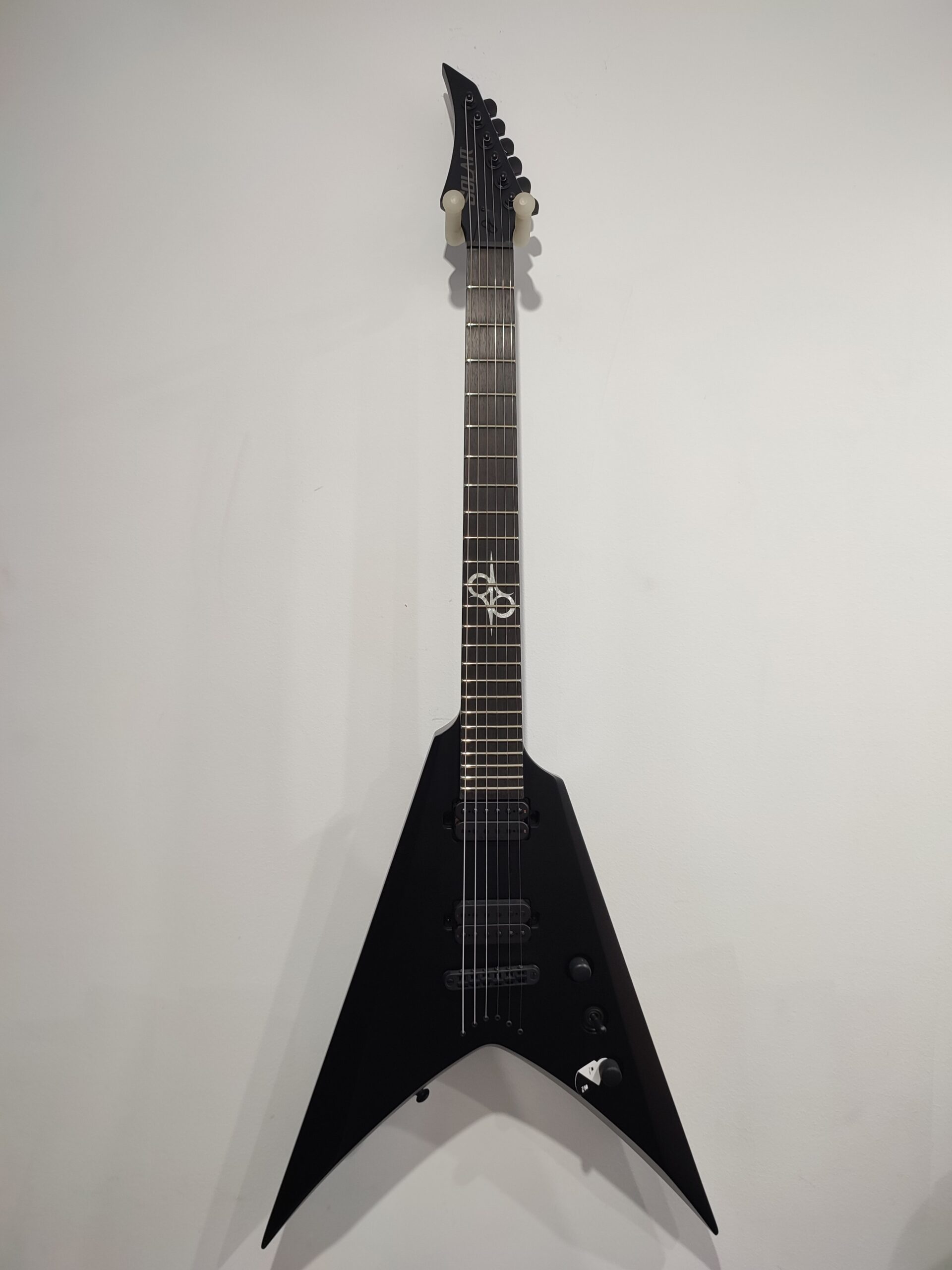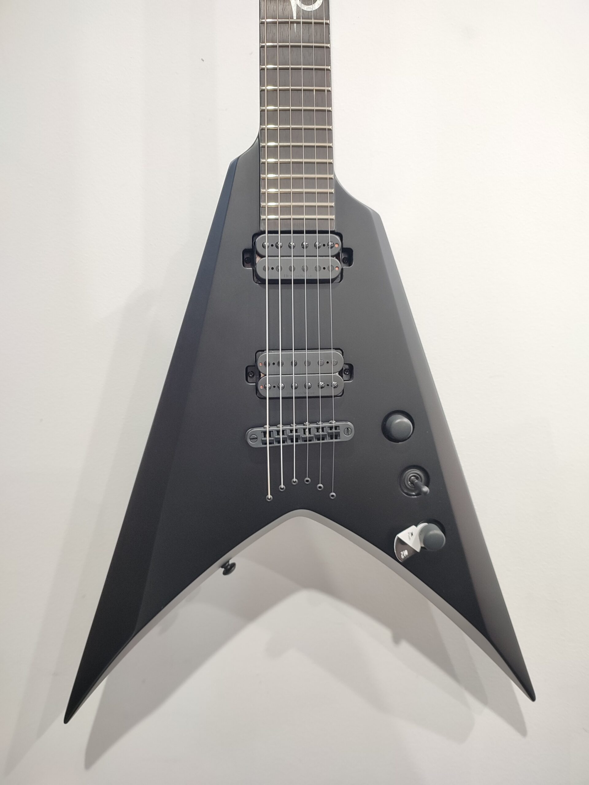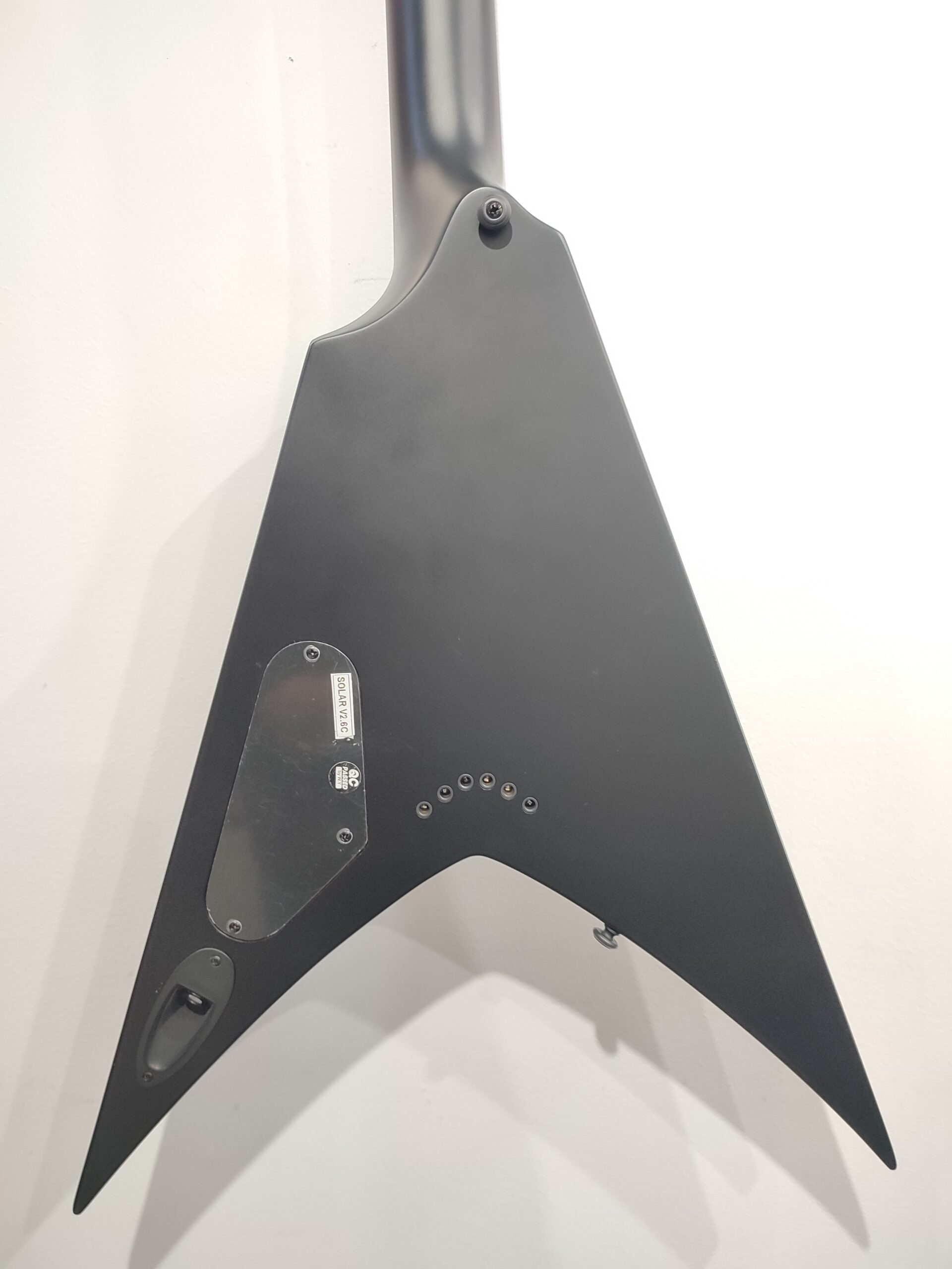 This Type V2.6 guitar will set you apart from everyone else. With its distinctive, stealth looks and feature set, this guitar is a precise, professional instrument suitable for both stage and studio work. Loaded with a reliable string-through-body hardtail bridge and Duncan Solar pickups that provide a full spectrum of tonal options, from organic clean to heavily overdriven, all with fluid sustain and maximum clarity. The Type V2.6 guitar features a set-thru neck/body joint design with 25.5” scale, a mahogany body, a fast, thin, comfortable maple neck, and a rosewood fingerboard with 24 super-jumbo frets. It also includes Solar 18:1 ltuners, PPS nut, black matte hardware, 3-way toggle pickup switching with push-pull and a full access neck. This guitar is available in carbon black matte finish.