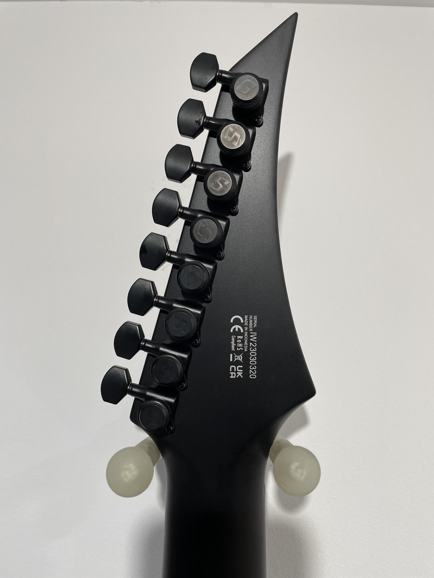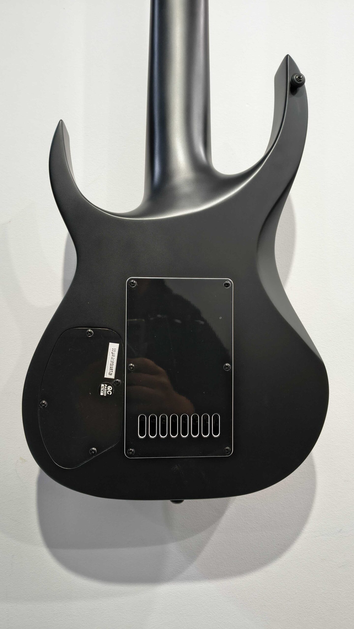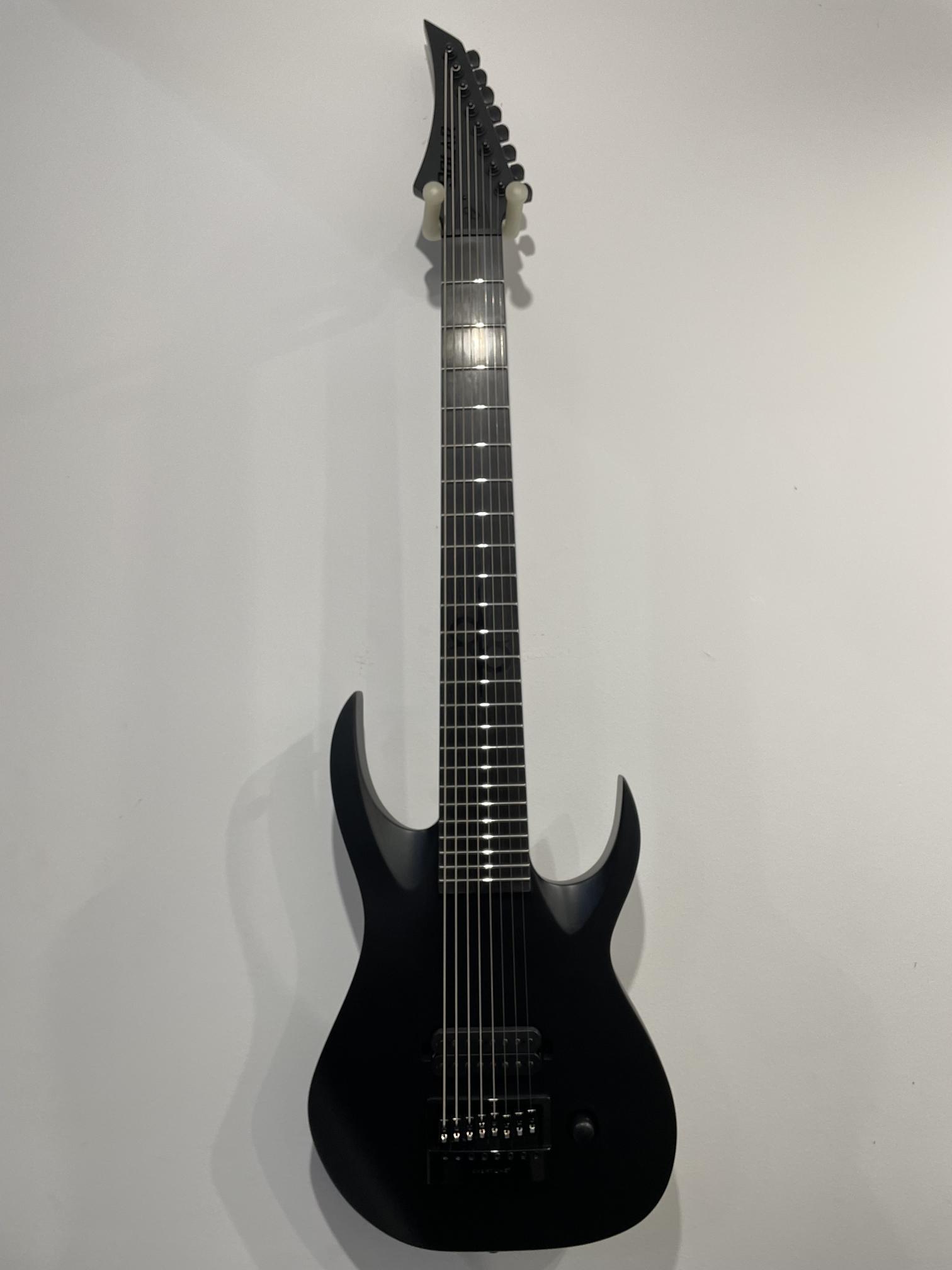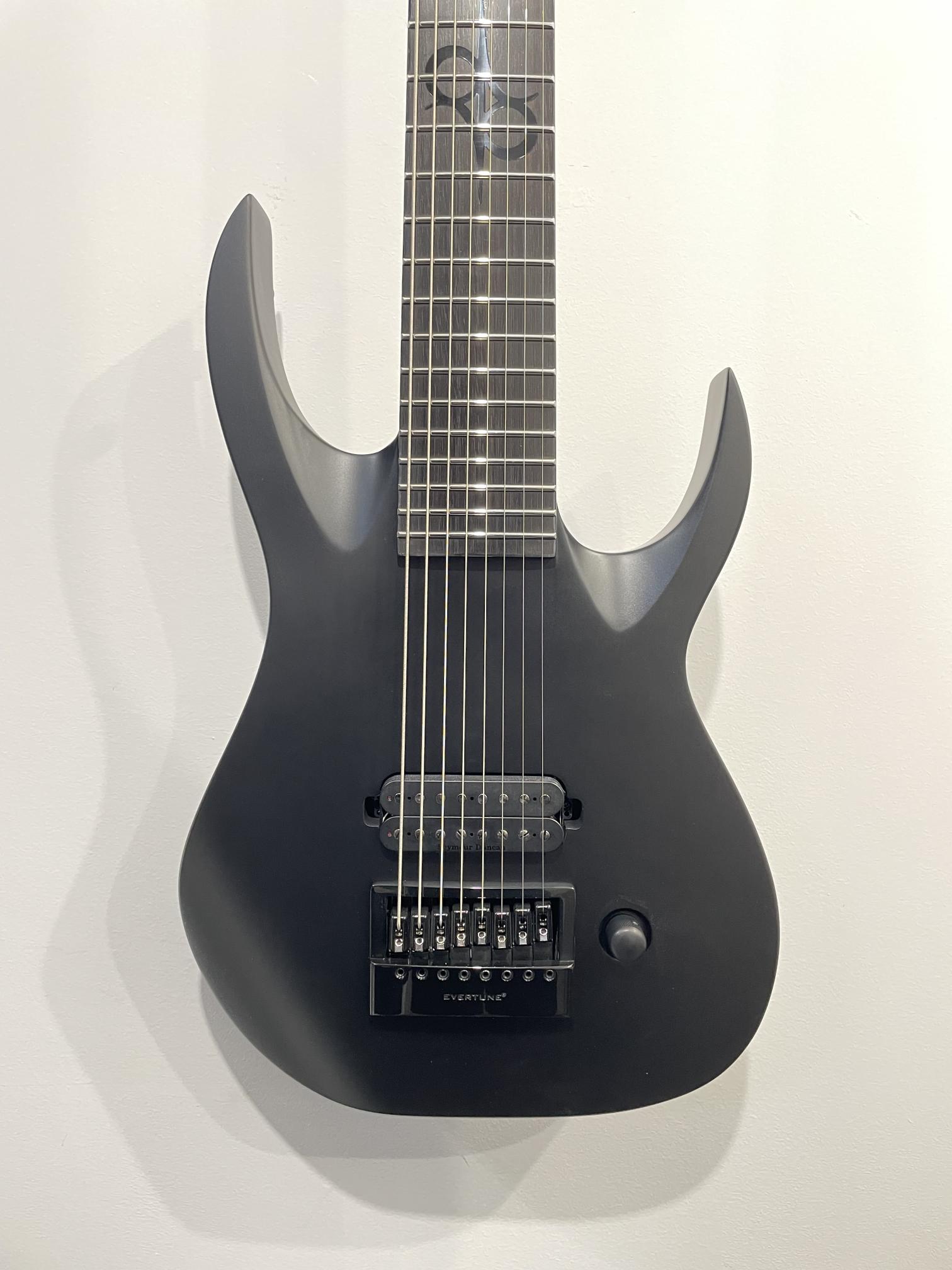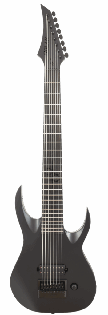 This Type A1.81Svart-29 eight-string guitar boasts stealth looks, a distinctive cutaway scoop and a remarkable feature set, making it the ultimate, precise and professional instrument suitable for both stage and studio work. This guitar features the Evertune® constant-tension bridge—a reliable, fully-mechanical system that keeps the guitar in tune under any circumstances. It also features a single Seymour Duncan USA Nazgul in the bridge. The Type A1.81Svart-29 features a set-thru neck/body joint design with 29” scale, an alder body, a fast, thin, comfortable maple neck, an ebony fingerboard with 24 stainless steel super-jumbo frets and ‘glow in the dark’ side dots for easy stage use. This 8-string guitar is loaded with Solar 18:1 locking tuners, PPS nut and full access neck. Available in carbon black matte finish.