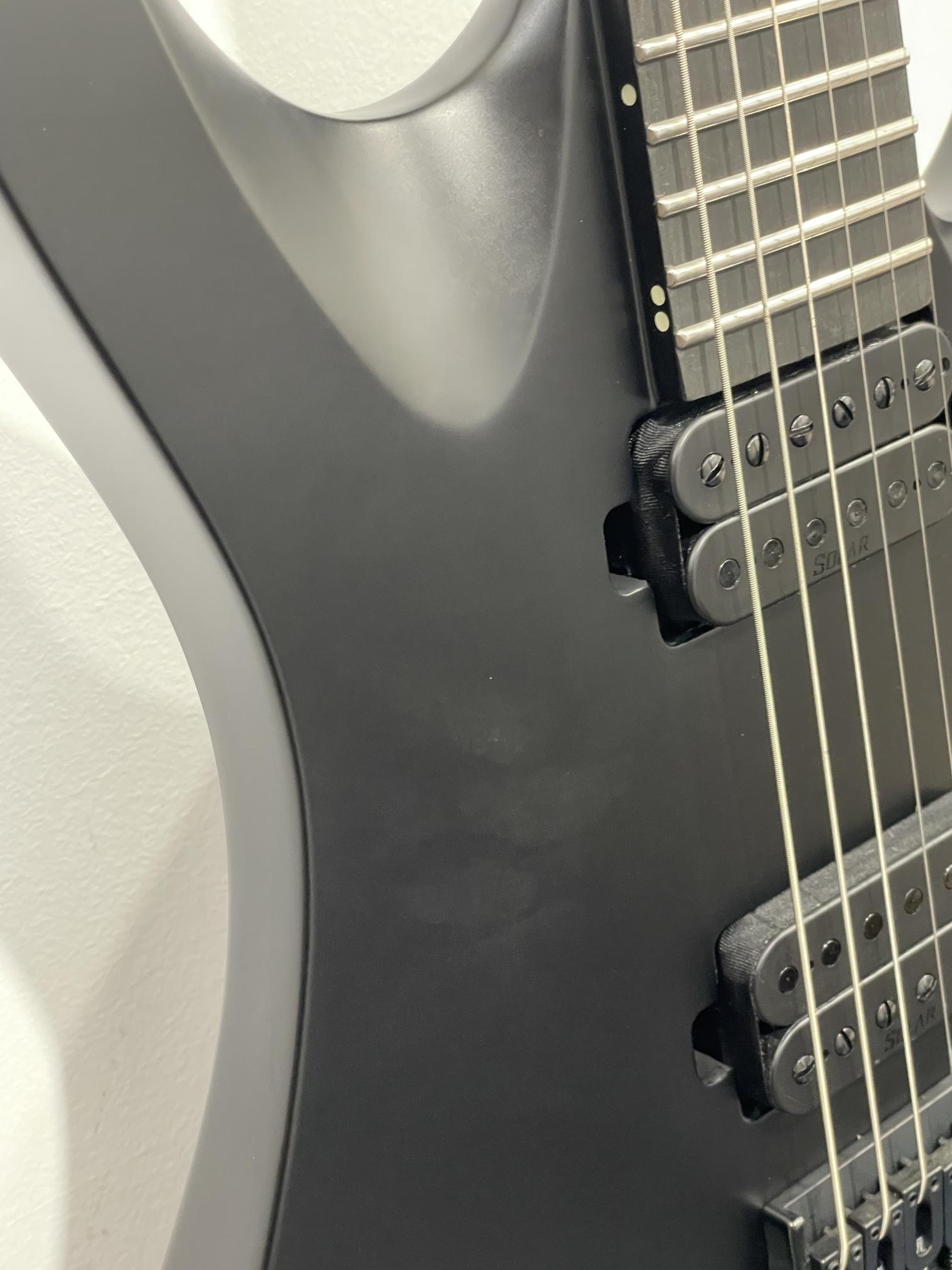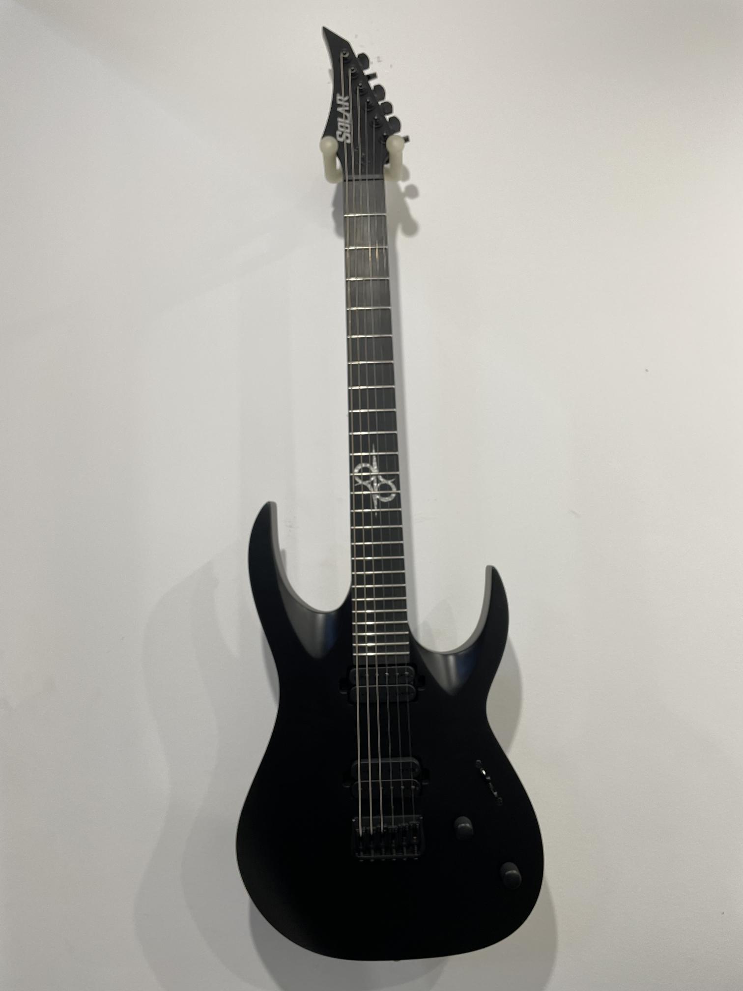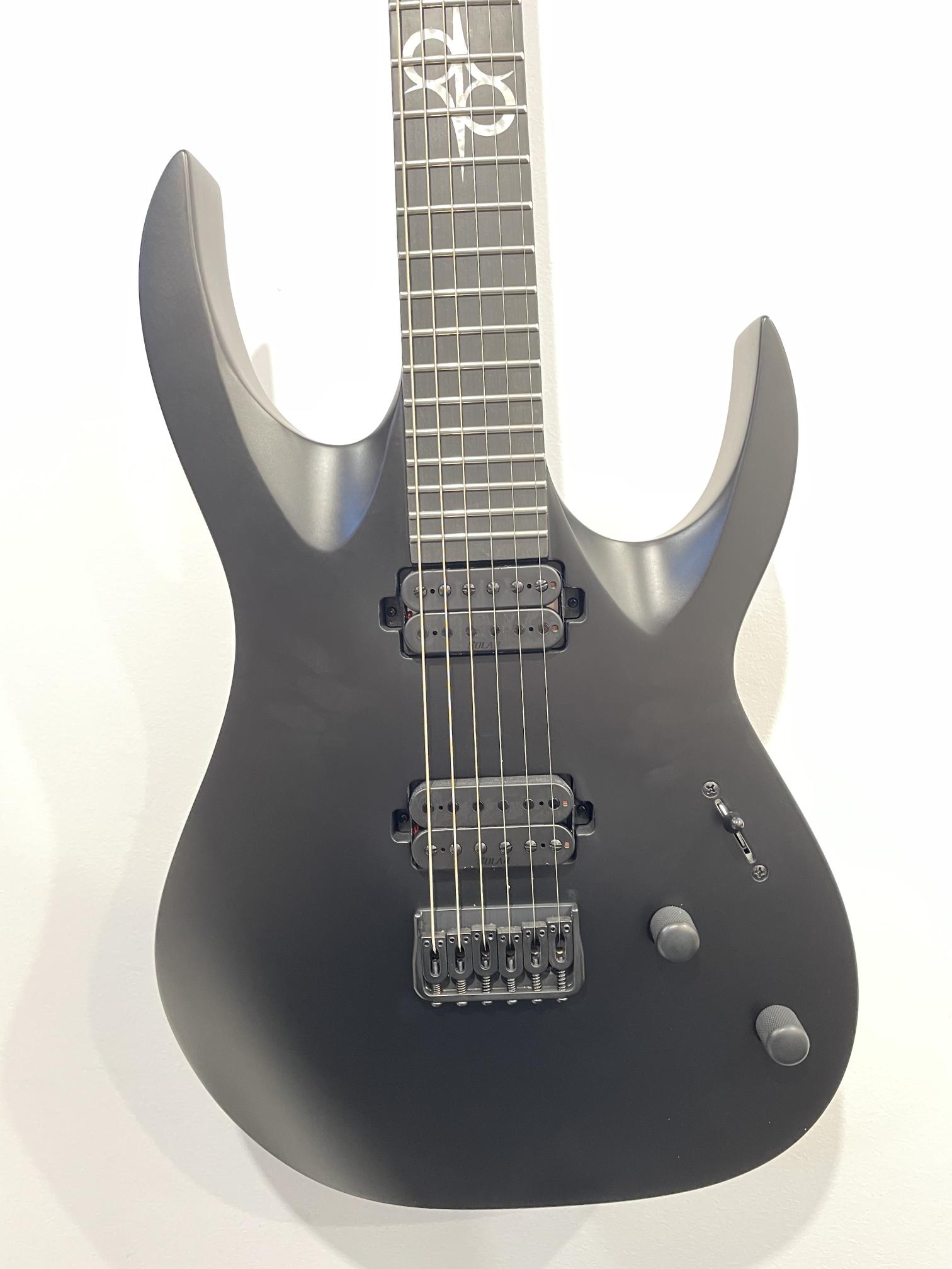 This Type A1.6RHC six string guitar boasts stealth looks, a distinctive cutaway scoop and a remarkable feature set, making it the ultimate, precise and professional instrument suitable for both stage and studio work. This guitar features a brass fixed bridge with one piece brass string ferrule block for optimal tone transfer and additional definition. It features a set of Solar Standard pickups provide classic Alnico tone. The Type A1.6RHC features a set-thru neck/body joint design with 25.5” scale, an alder body, a fast, thin, comfortable maple neck, a richlite fingerboard with 24 stainless steel super-jumbo frets and ‘glow in the dark’ side dots for easy stage use. Loaded with Solar 18:1 locking tuners, graphite nut, five-way blade pickup switching and full access neck. Available in carbon black matte finish.