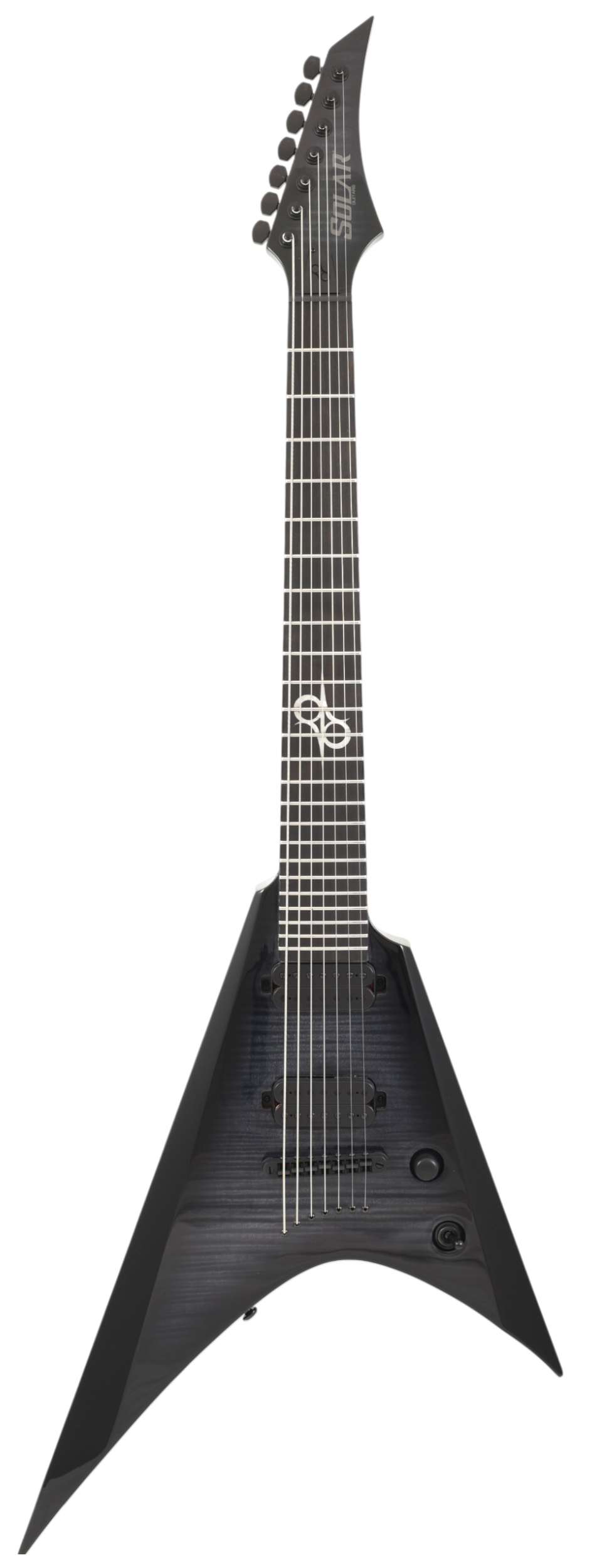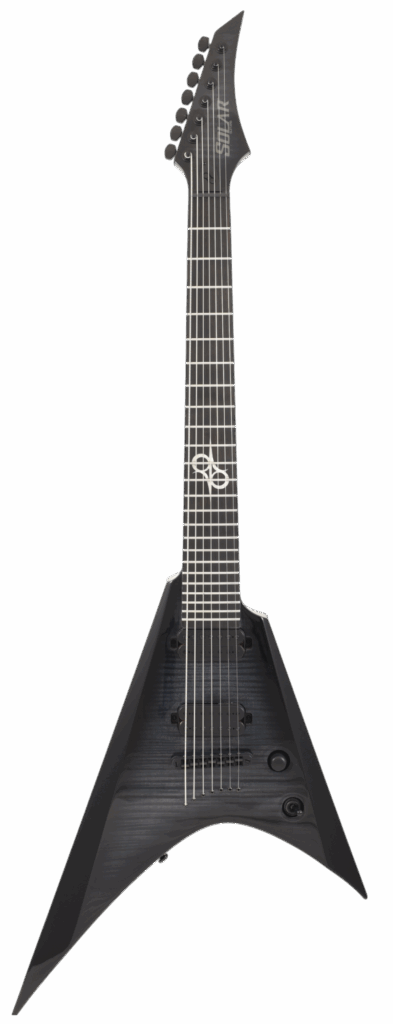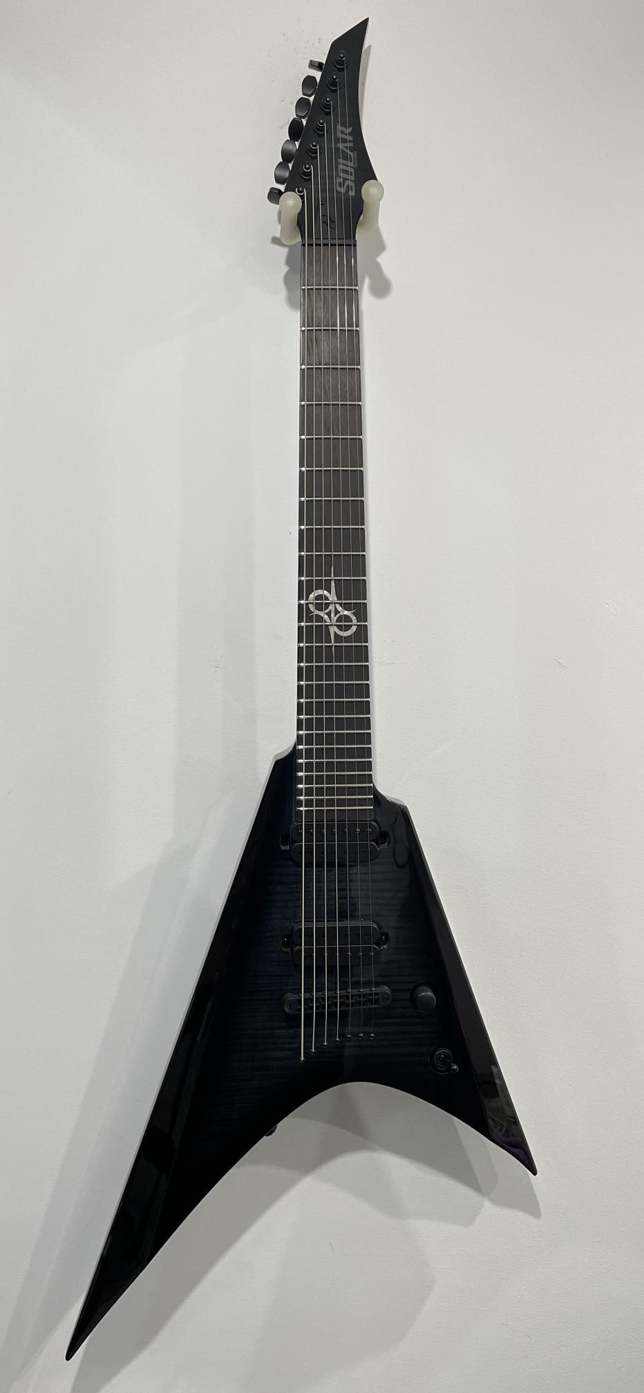 This Type VAR1.7TFBB+ seven-string guitar will set you apart from everyone else. With its distinctive, stealth looks and feature set, this guitar is a precise, professional instrument suitable for both stage and studio work. This guitar has a Tonepros locking TOM bridge and string thru body . It also features a set of newly designed Duncan Solar+ (Plus) high gain pickups, featuring Alnico VIII magnets, for maximum impact, grind and aggression.The Type VAR1.7TFBB+ features a set-thru neck/body joint design with 25.5” scale, mahogany body with flame maple veneer, a fast, thin, comfortable maple neck, an ebony fingerboard with 24 super-jumbo stainless steel frets and Luminlay ‘glow in the dark’ side dots for stage use. Loaded with Solar 18:1 locking tuners, PPS nut, 3-way toggle pickup switching , single volume pot, and full access neck. Available in flame trans black burst gloss finish, it also includes a Solar Type VAR hardcase.
