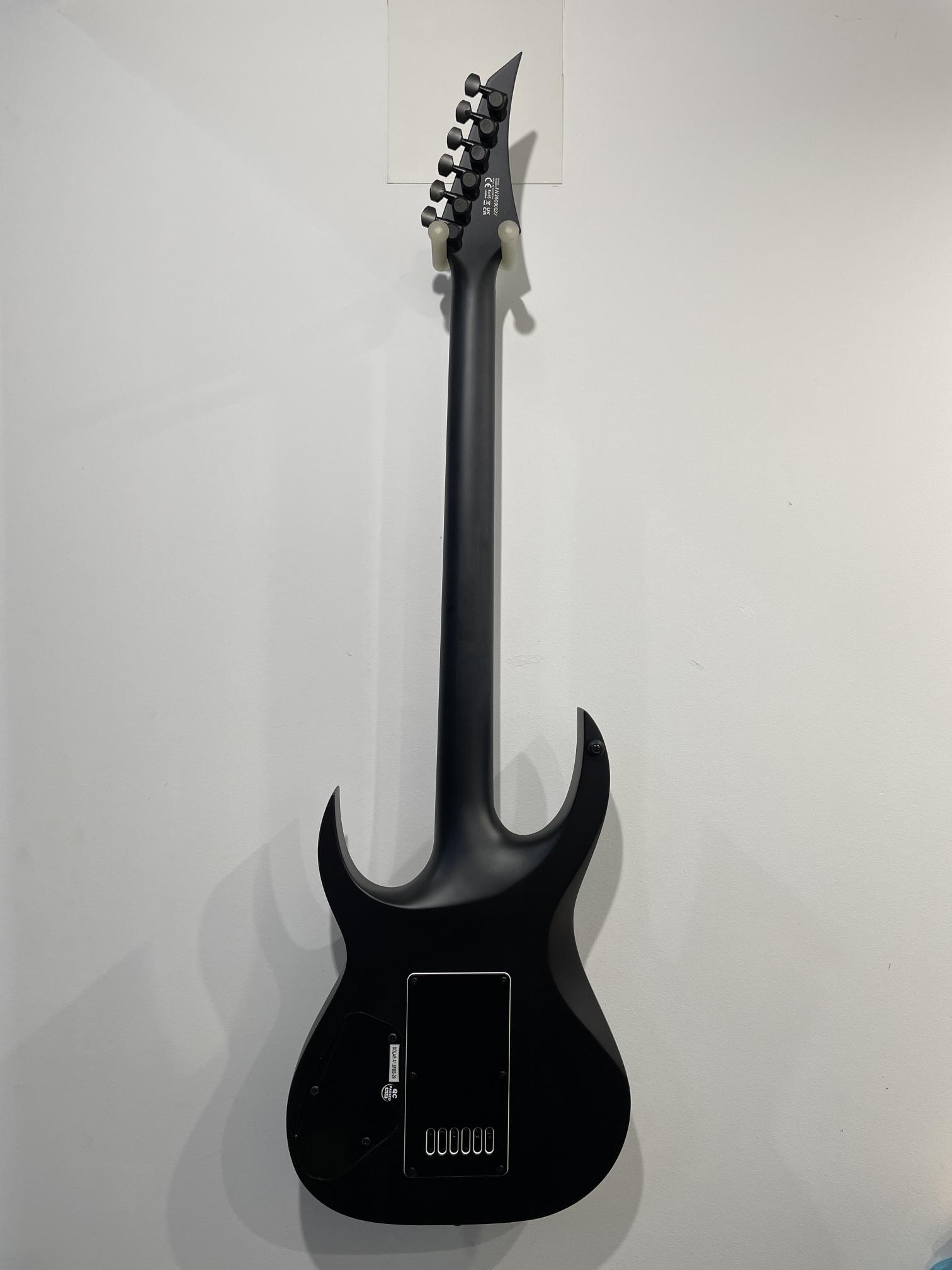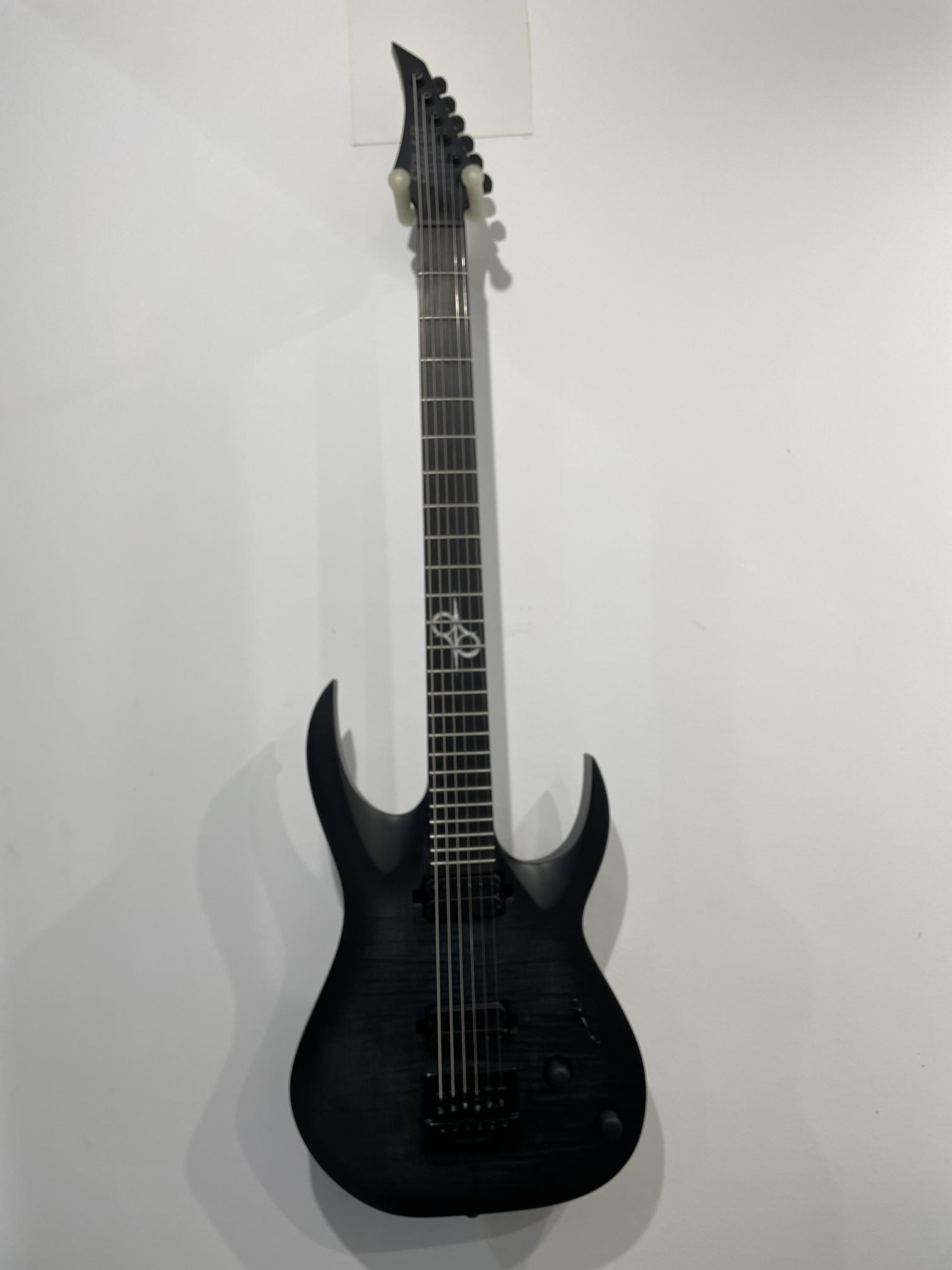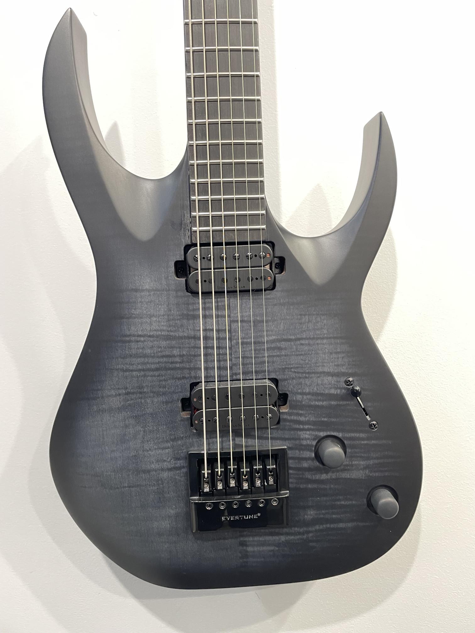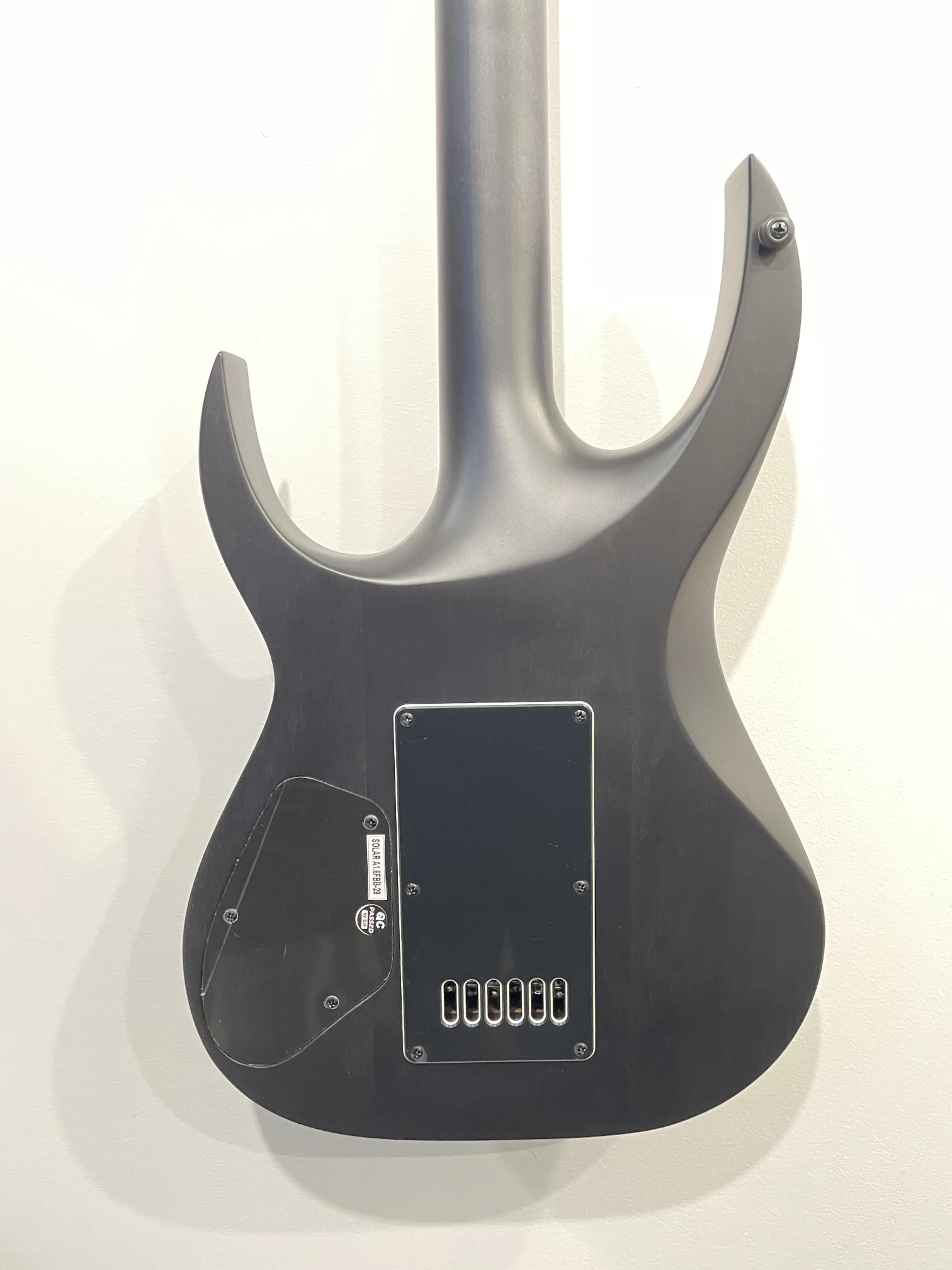 This Type A1.6FBB-29 six-string baritone guitar boasts stealth looks, a distinctive cutaway scoop and a remarkable feature set, making it the ultimate, precise and professional instrument suitable for both stage and studio work. This guitar features the Evertune® constant-tension bridge—a reliable, fully-mechanical system that keeps the guitar in tune under any circumstances. It also features Duncan Solar pickups that provide a full spectrum of tonal options, from organic clean to heavily overdriven, all with fluid sustain and maximum clarity.The Type A1.6 features a set-thru neck/body joint design with 29” scale, flame maple veneer on alder body, a fast, thin, comfortable maple neck, an ebony fingerboard with 24 super-jumbo stainless steel frets and Luminlay ‘glow in the dark’ side dots for easy stage use. Loaded with Solar 18:1 locking tuners, PPS nut, five-way blade pickup switching and full access neck. Available in flame black matte finish.