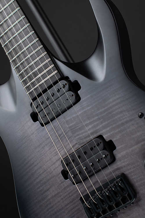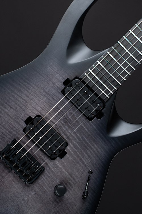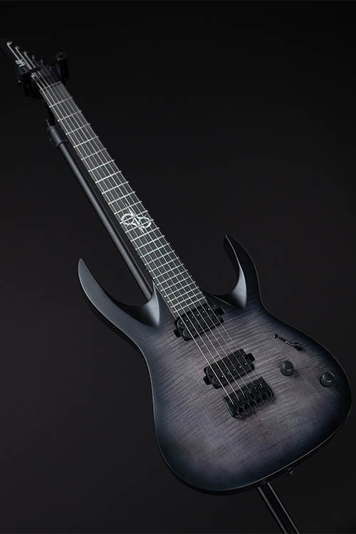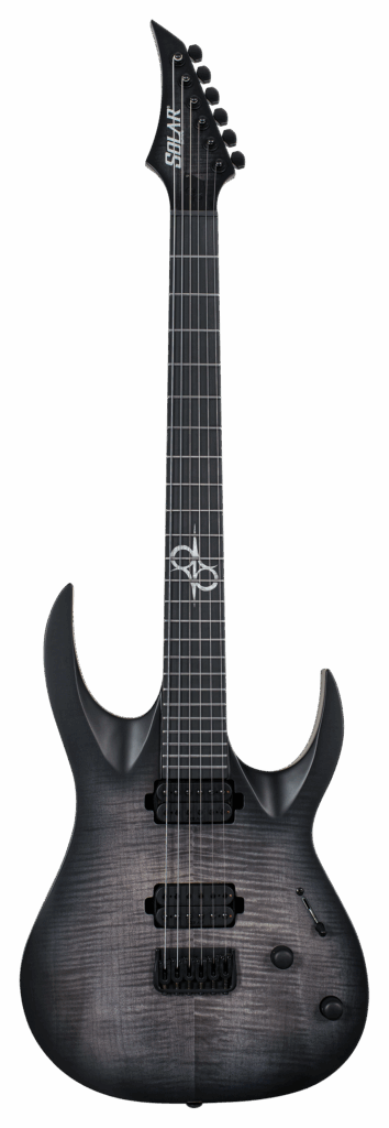 This Type A1.6RHFBB six string guitar boasts stealth looks, a distinctive cutaway scoop and a remarkable feature set, making it the ultimate, precise and professional instrument suitable for both stage and studio work. This guitar features a brass fixed bridge with one piece brass string ferrule block for optimal tone transfer and additional definition. It features a set of Solar Modern pickups with Alnico V in the neck and an aggressive ceramic in the bridge position. The Type A1.6RHFBB features a set-thru neck/body joint design with 25.5” scale, an alder body with flame maple veneer, a fast, thin, comfortable maple neck, a richlite fingerboard with 24 stainless steel super-jumbo frets and ‘glow in the dark’ side dots for easy stage use. Loaded with Solar 18:1 locking tuners, graphite nut, five-way blade pickup switching and full access neck. Available in flame black burst matte finish.