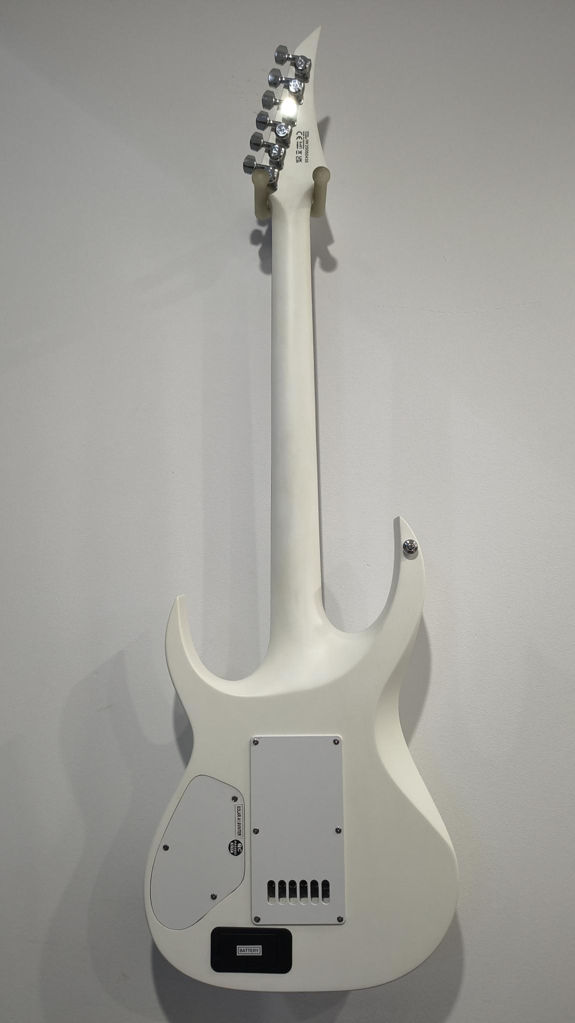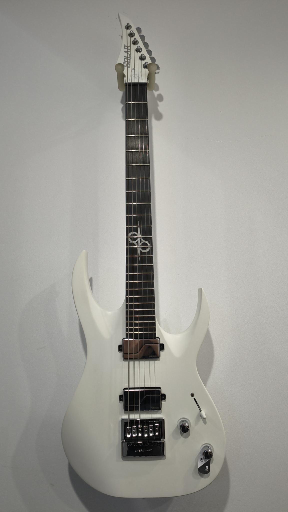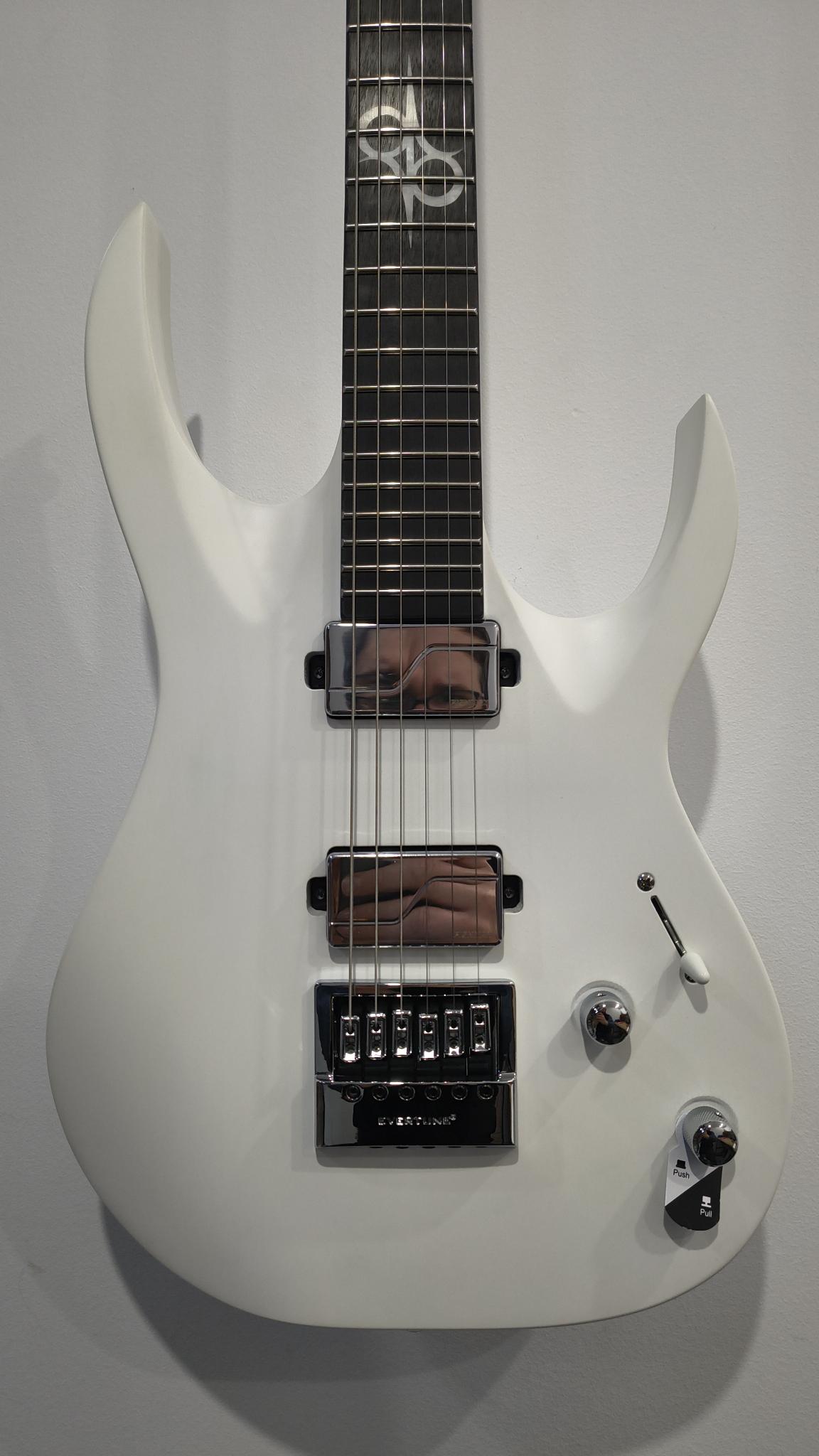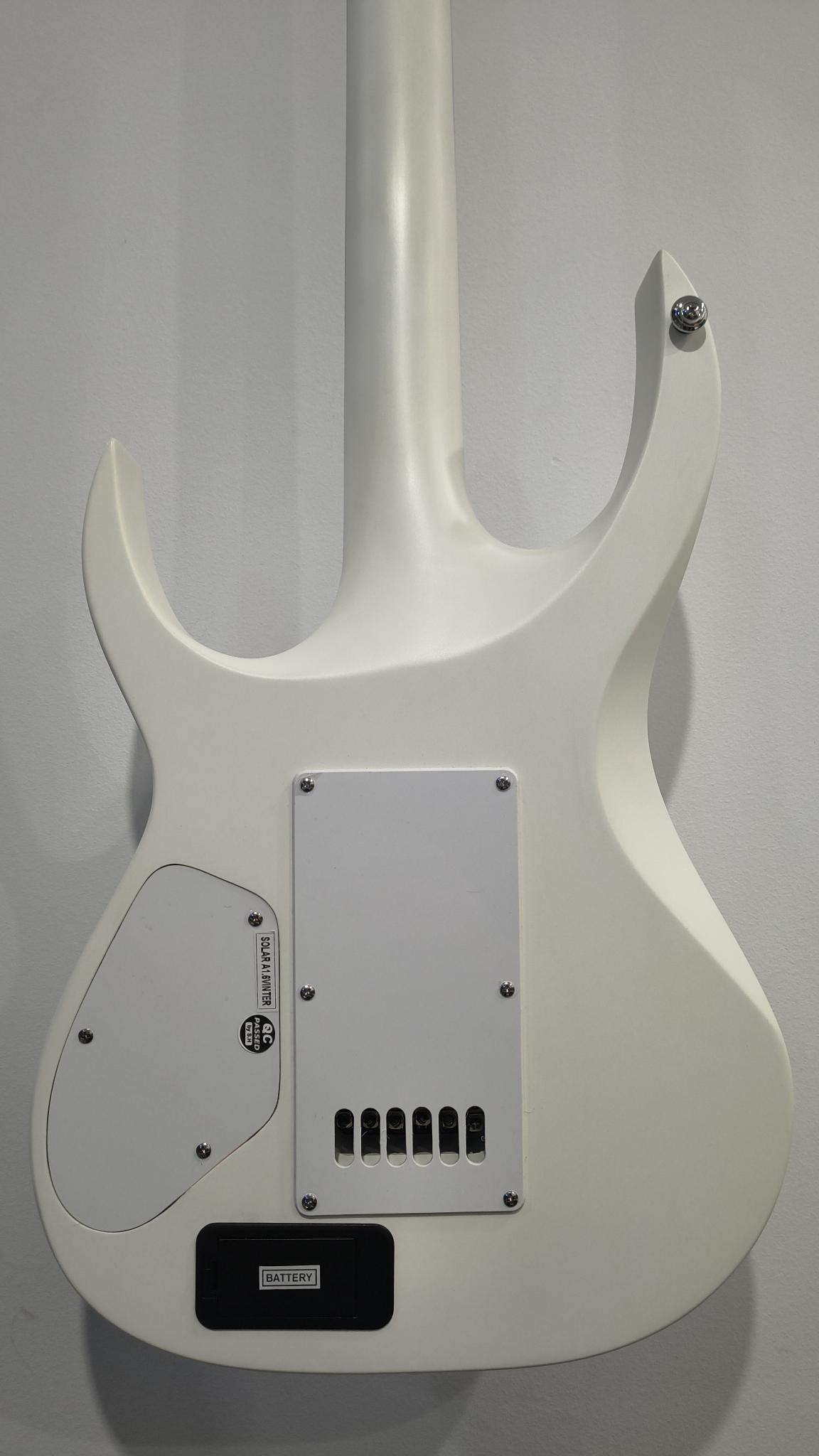 This Type A1.6Vinter six-string guitar boasts stealth looks, a distinctive cutaway scoop and a remarkable feature set, making it the ultimate, precise and professional instrument suitable for both stage and studio work. This guitar features the Evertune® constant-tension bridge—a reliable, fully-mechanical system that keeps the guitar in tune under any circumstances. It also features a pair of Fishman Fluence Modern active humbucker pickups revealing pure, uncorrupted and musical tone.The Type A1.6Vinter features a set-thru neck/body joint design with 25.5” scale, an alder body, a fast, thin, comfortable maple neck, an ebony fingerboard with 24 super-jumbo stainless steel frets and Luminlay ‘glow in the dark’ side dots for easy stage use. Loaded with Solar 18:1 locking tuners, all chrome hardware and pickup covers, PPS nut, 3-way blade pickup switching and full access neck. Available in Vinter pearl white matte finish. NOTE: 9V Battery is not included.