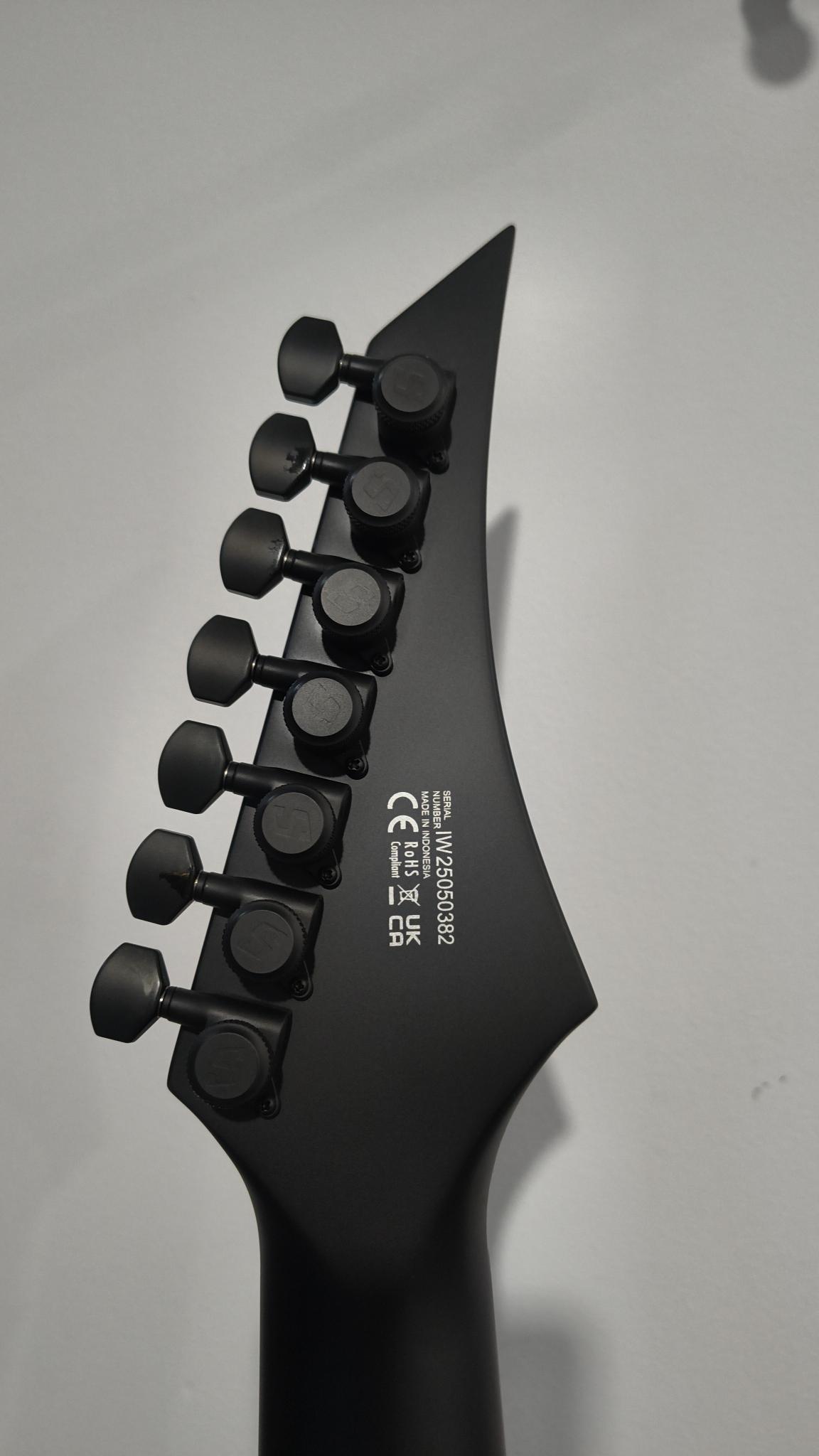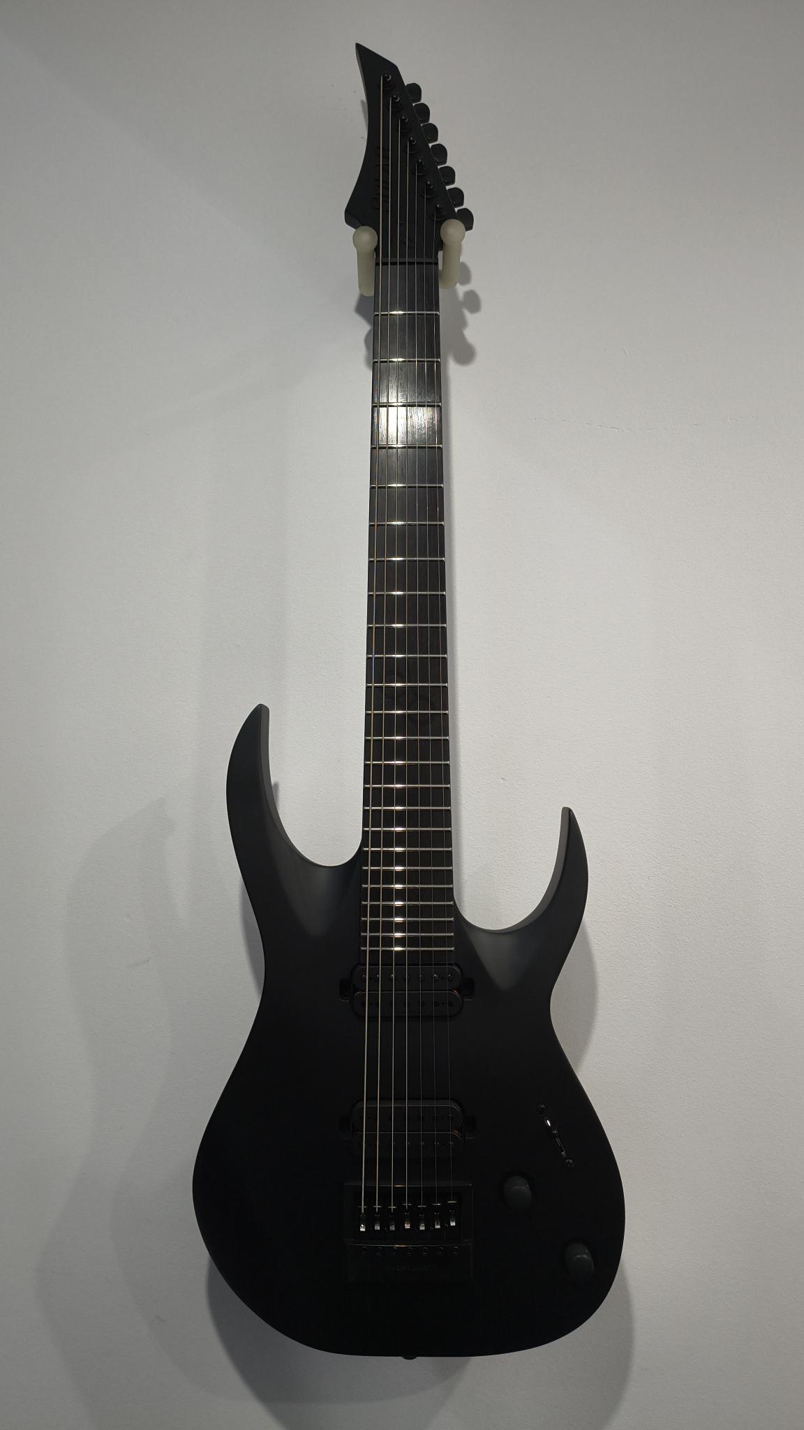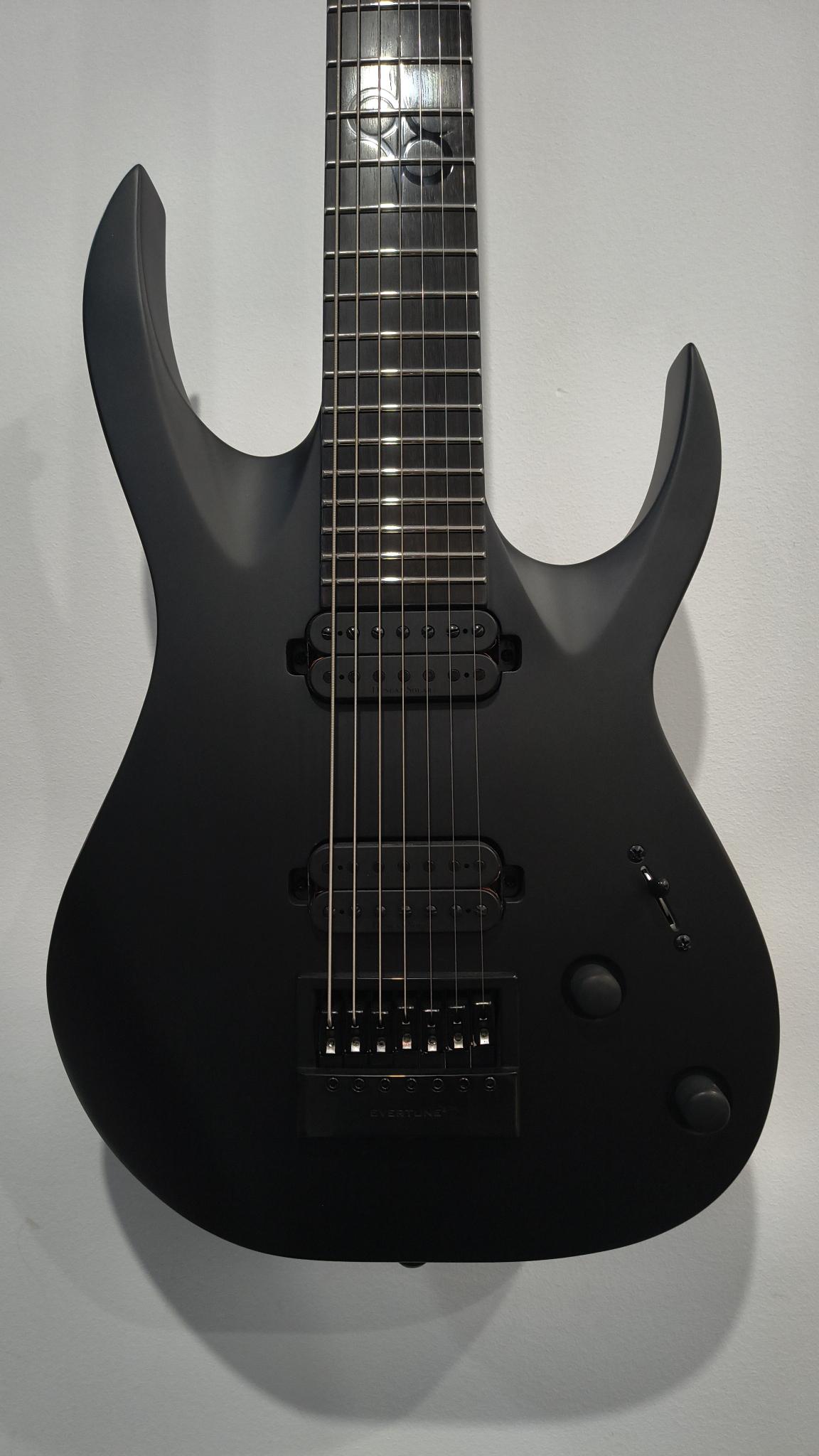 This Type A1.7Svart+ seven-string guitar boasts stealth looks, a distinctive cutaway scoop and a remarkable feature set, making it the ultimate, precise and professional instrument suitable for both stage and studio work. This guitar features the Evertune® constant-tension bridge—a reliable, fully-mechanical system that keeps the guitar in tune under any circumstances. It also features a set of newly designed Duncan Solar+ (Plus) high gain pickups, featuring Alnico VIII magnets, for maximum impact, grind and aggression. The Type A1.7Svart+ features a set-thru neck/body joint design with 26.5” scale, an alder body, a fast, thin, comfortable maple neck, an ebony fingerboard with 24 stainless steel super-jumbo frets and ‘glow in the dark’ side dots for easy stage use. Loaded with Solar 18:1 locking tuners, PPS nut, five-way blade pickup switching and full access neck. Available in carbon black matte finish.