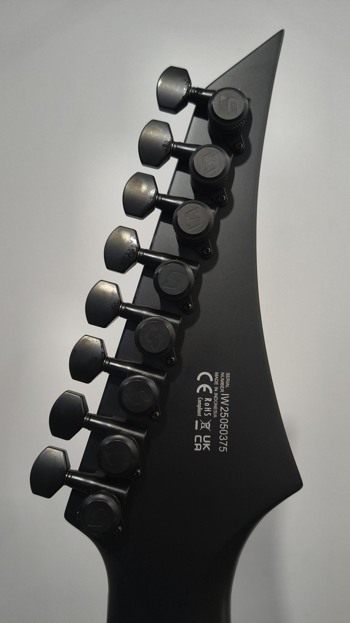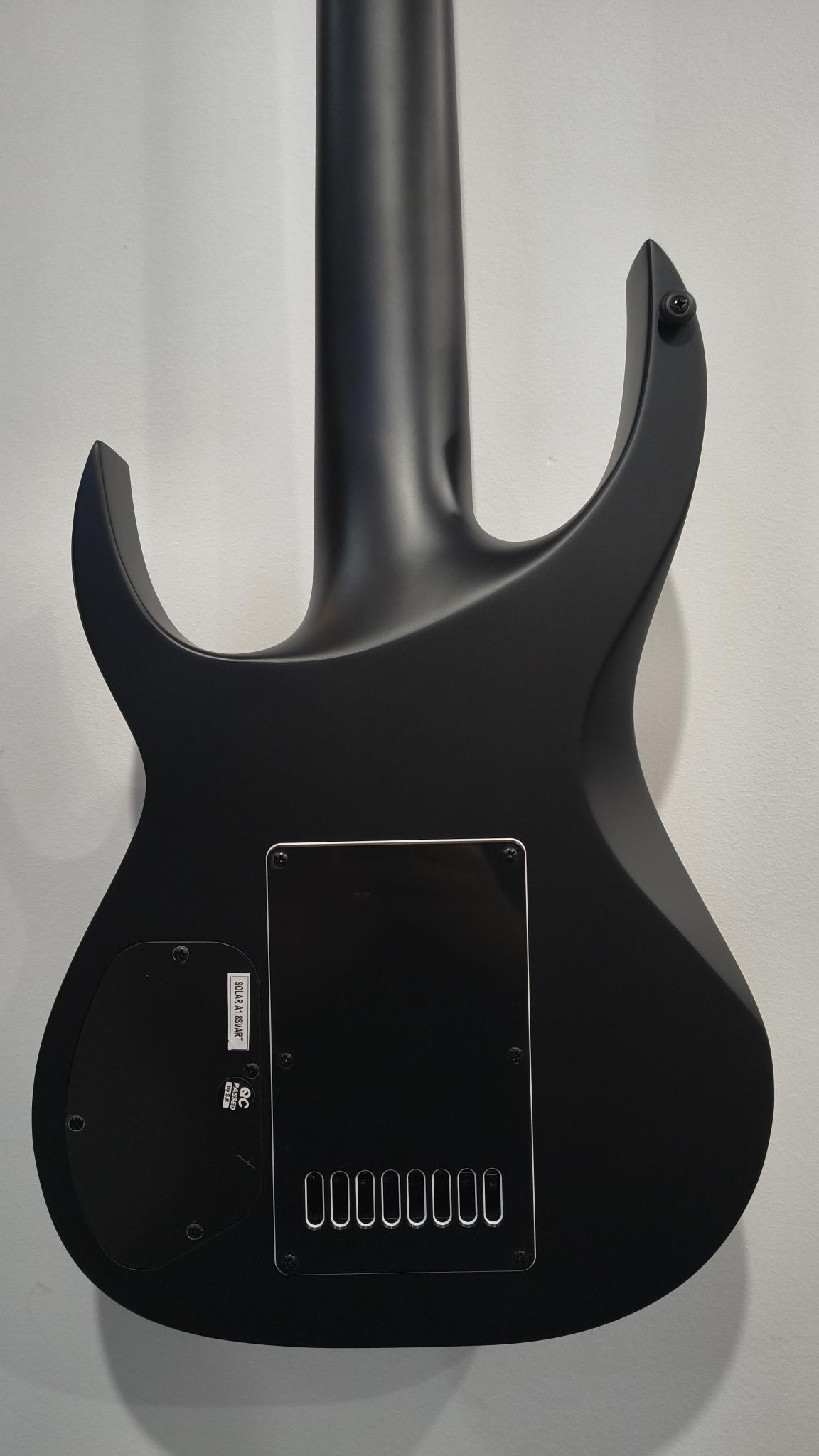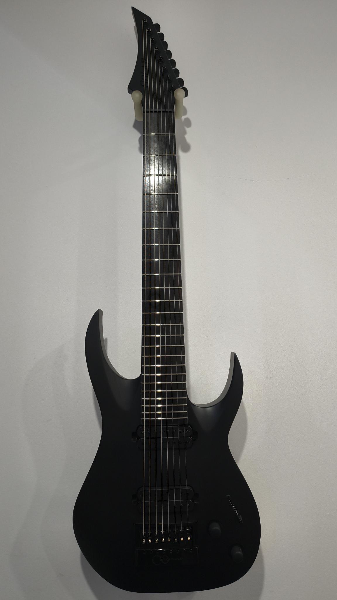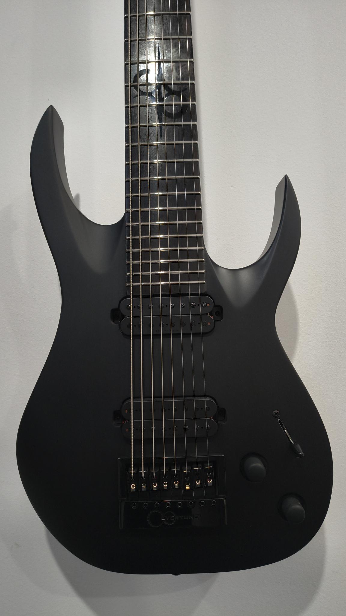 This Type A1.8Svart eight-string guitar boasts stealth looks, a distinctive cutaway scoop and a remarkable feature set, making it the ultimate, precise and professional instrument suitable for both stage and studio work. This guitar features the Evertune® constant-tension bridge—a reliable, fully-mechanical system that keeps the guitar in tune under any circumstances. It also features Duncan Solar pickups that provide a full spectrum of tonal options, from organic clean to heavily overdriven, all with fluid sustain and maximum clarity. The Type A1.8Svart features a set-thru neck/body joint design with 27” scale, an alder body, a fast, thin, comfortable maple neck, an ebony fingerboard with 24 stainless steel super-jumbo frets and ‘glow in the dark’ side dots for easy stage use. This well balanced 8-string guitar is loaded with Solar 18:1 locking tuners, PPS nut, five-way blade pickup switching and full access neck. Available in carbon black matte finish.
