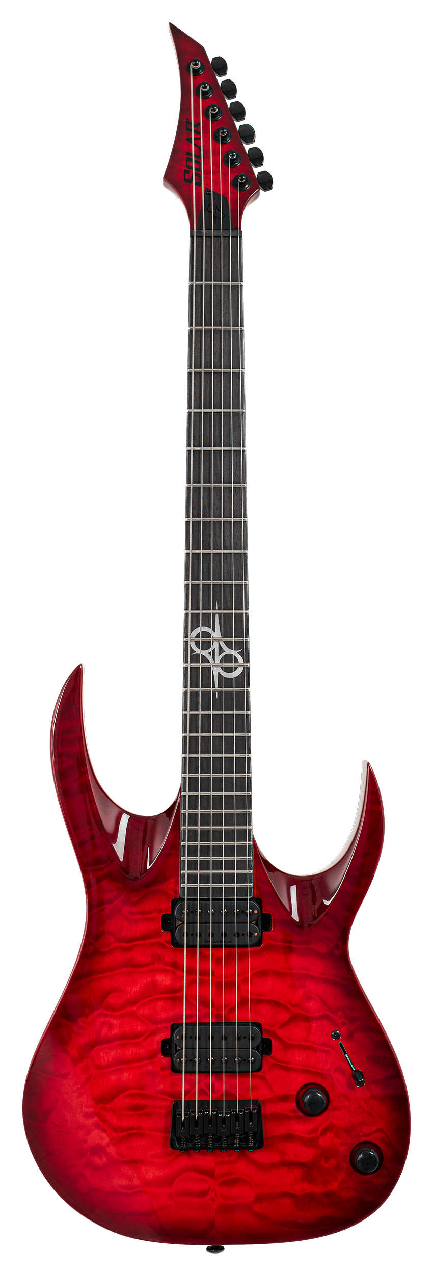 This Type A2.6QBRB-27 six-string Baritone guitar boasts stealth looks, a distinctive cutaway scoop and a remarkable feature set, making it a precise, professional instrument suitable for both stage and studio work. It comes loaded with a reliable string-through-body hardtail bridge and a set of Duncan Solar pickups that provide a full spectrum of tonal options, from organic clean to heavily overdriven, all with fluid sustain and maximum clarity. The Type A2.6QBRB-27 features a set-thru neck/body joint design with 27” scale, a mahogany body with quilted maple veneer, a fast, thin, comfortable mahogany neck and a rosewood fingerboard with 24 super-jumbo frets. It includes Solar 18:1 tuners, PPS nut, black matte hardware, five-way blade pickup switching and full access neck. Available in quilted blood red burst gloss finish.