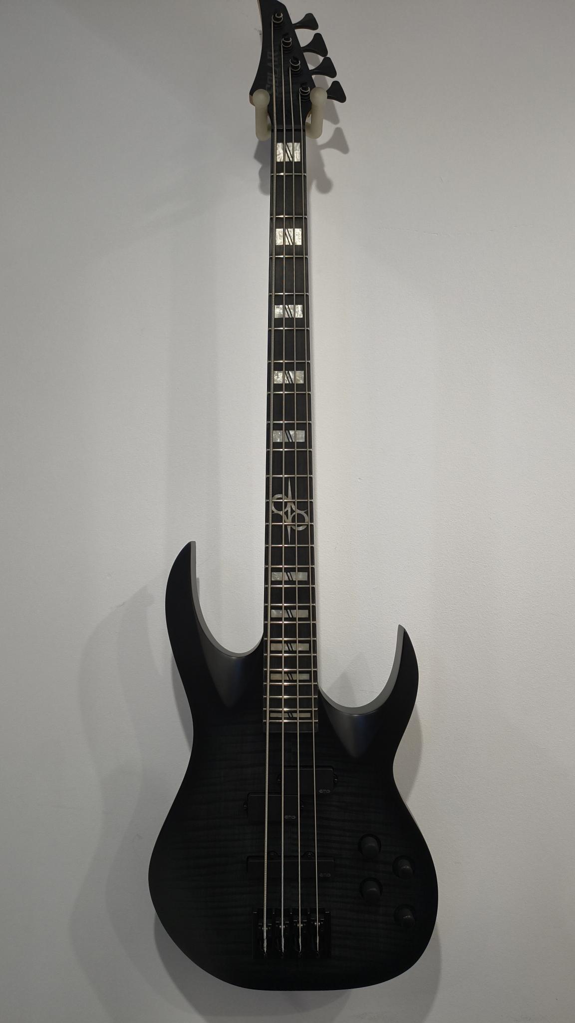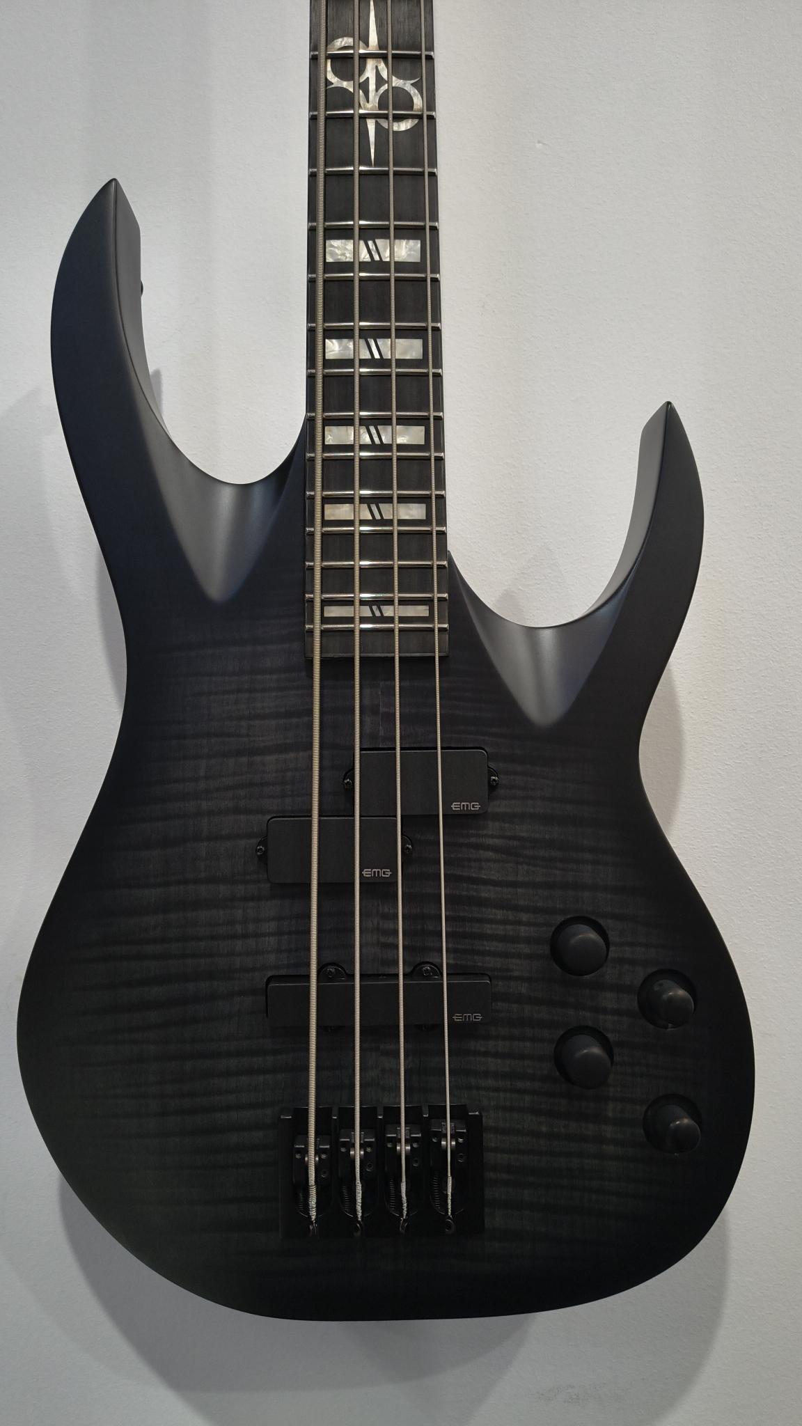 This Type AB1.4JN four-string bass guitar boasts stealth looks, a distinctive cutaway scoop and a remarkable feature set, making it a precise, professional instrument suitable for both stage and studio work. It comes loaded with a reliable high mass Hipshot brass bridge with enhanced sustain and two EMG P/J pickups and BQS preamp system with volume, balance, bass and treble control that provides deep and rich lows and punchy midrange. The AB1.4JN bass features a bolt-on neck with natural matte back finish and 34” scale length, an alder body, a fast and comfortable 5 piece maple/jatoba neck and an ebony fingerboard with 24 super jumbo frets and small position marker dots. It includes Hipshot Ultralite tuners, pps nut and black matte hardware. Available in flame black burst matte finish. Delivered with a 60-130 string gauge set for B standard tuning. NOTE: 9V Battery is not included.