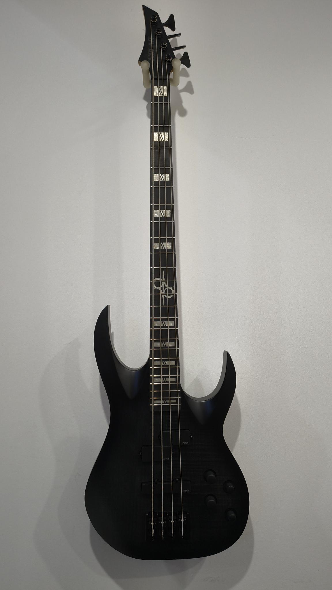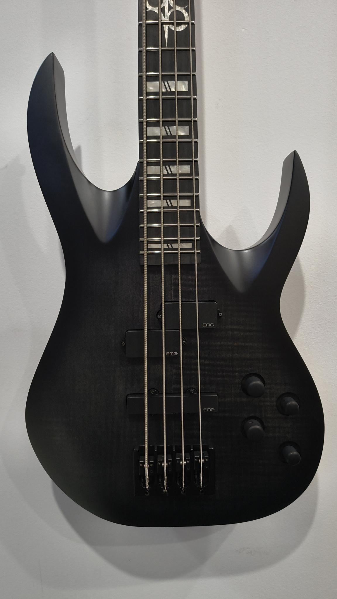 This Type AB1.4JN four-string bass guitar boasts stealth looks, a distinctive cutaway scoop and a remarkable feature set, making it a precise, professional instrument suitable for both stage and studio work. It comes loaded with a reliable high mass Hipshot brass bridge with enhanced sustain and two EMG P/J pickups and BQS preamp system with volume, balance, bass and treble control that provides deep and rich lows and punchy midrange. The AB1.4JN bass features a bolt-on neck with natural matte back finish and 34” scale length, an alder body, a fast and comfortable 5 piece maple/jatoba neck and an ebony fingerboard with 24 super jumbo frets and small position marker dots. It includes Hipshot Ultralite tuners, pps nut and black matte hardware. Available in flame black burst matte finish. Delivered with a 60-130 string gauge set for B standard tuning. NOTE: 9V Battery is not included.