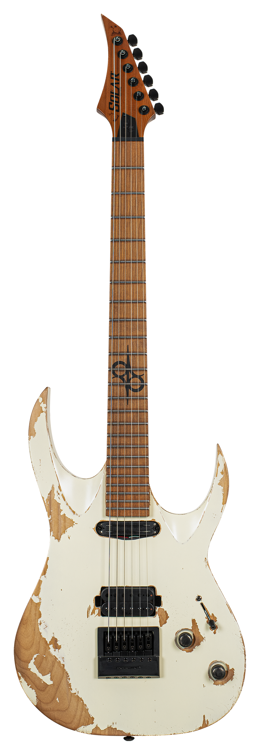 Every custom RELIK guitar starts with an Alder body and Roasted Maple neck. Then, Destruction mode!… Primer, Nitro-Lacquer, fire, flame and 1000 old school luthier tricks to create this worn and torn Relik workhorse. Once finish is complete, assembly begins with the neck fitted with *NEW VERSION* Evertune Bridge, Solar…