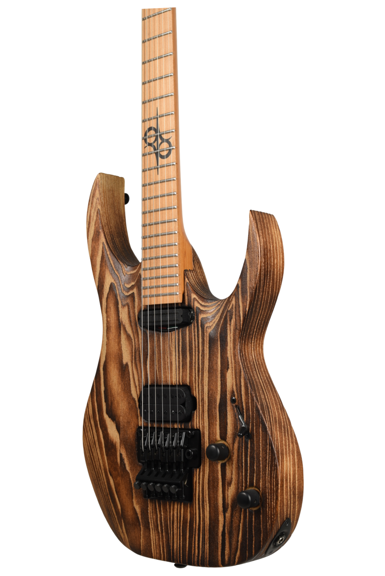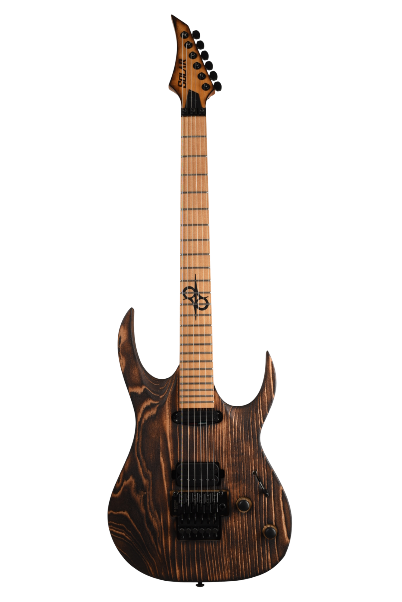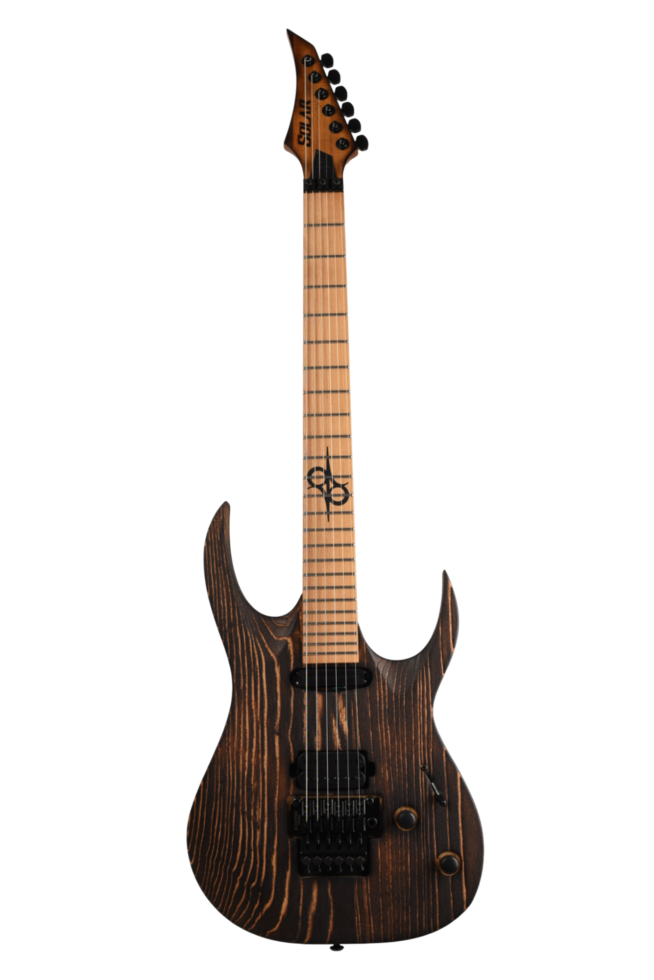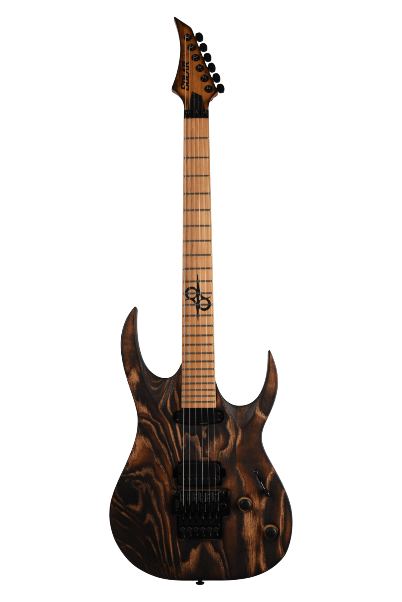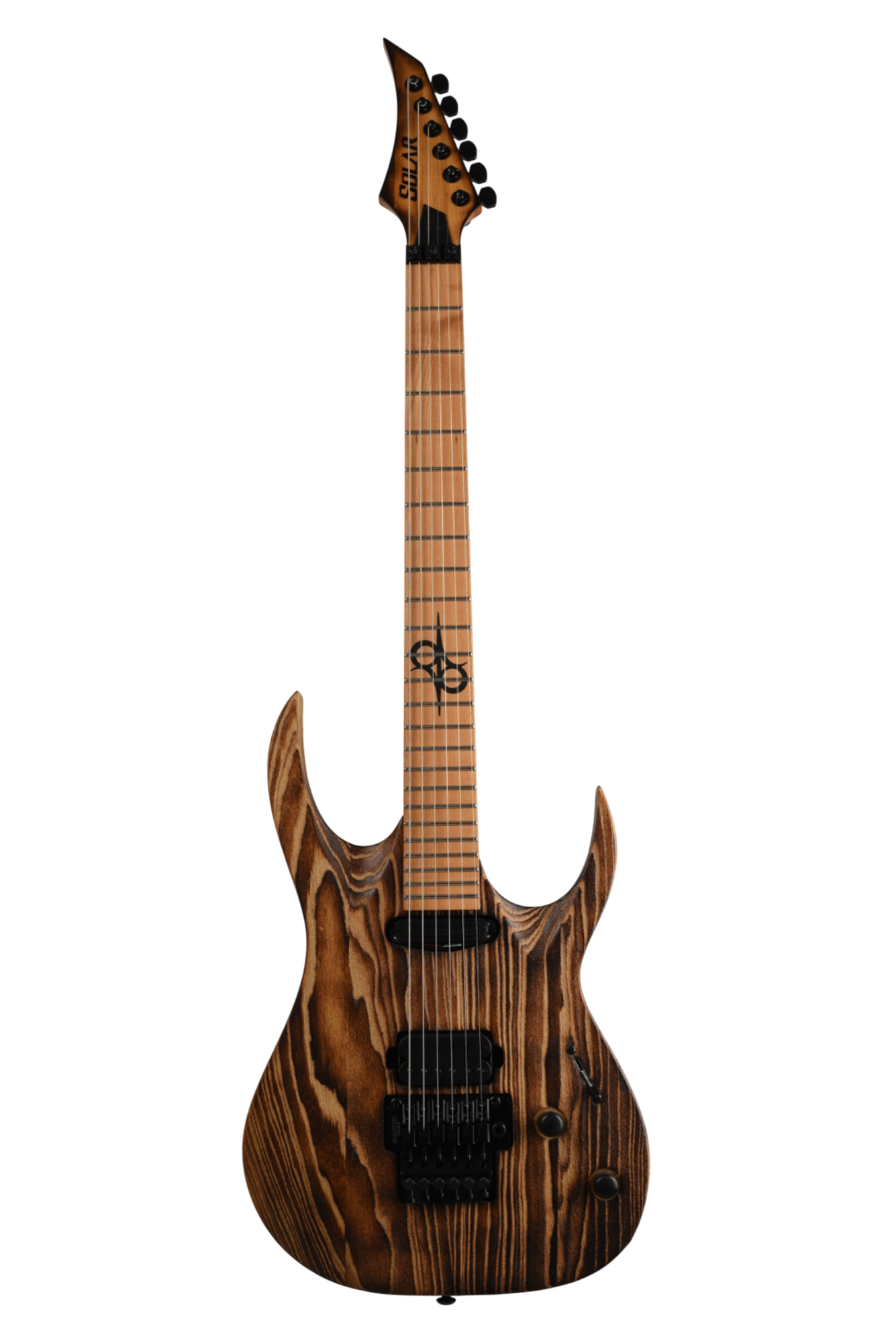 Your custom DESERT ROSE guitar starts with an AB1.6 Swamp Ash body and Roasted Maple neck. Similar like the PYRO, Torch Flame is applied so the natural heat deepens and burn into the grain lines of the body wood but with this model the body is completely burned and charred. From there it goes through a sanding step that leaves the wood with elements from the fire, but a texture that accentuates the grain and is inspired by the wind burned sand of a Desert Rose. It is a meticulous and lengthy process requiring much expertise and judgement. Sand and Fire impact grain and wood grain differently for every piece of wood, so each instrument is 100% completely unique. The headstock of the neck is then fire-branded with the Solar logo with edges burned to match the body, Afterwards the body is cleaned and poly sealer coats are applied. Once dry, assembly begins with the neck fitted with Solar locking tuners, Floyd Rose installation, pickups, electronics wiring, strings strung up and final set-up by our experienced luthiers to be ready for any level of professional stage or studio.