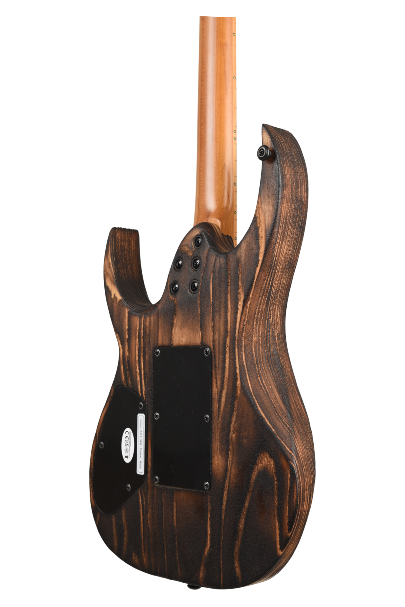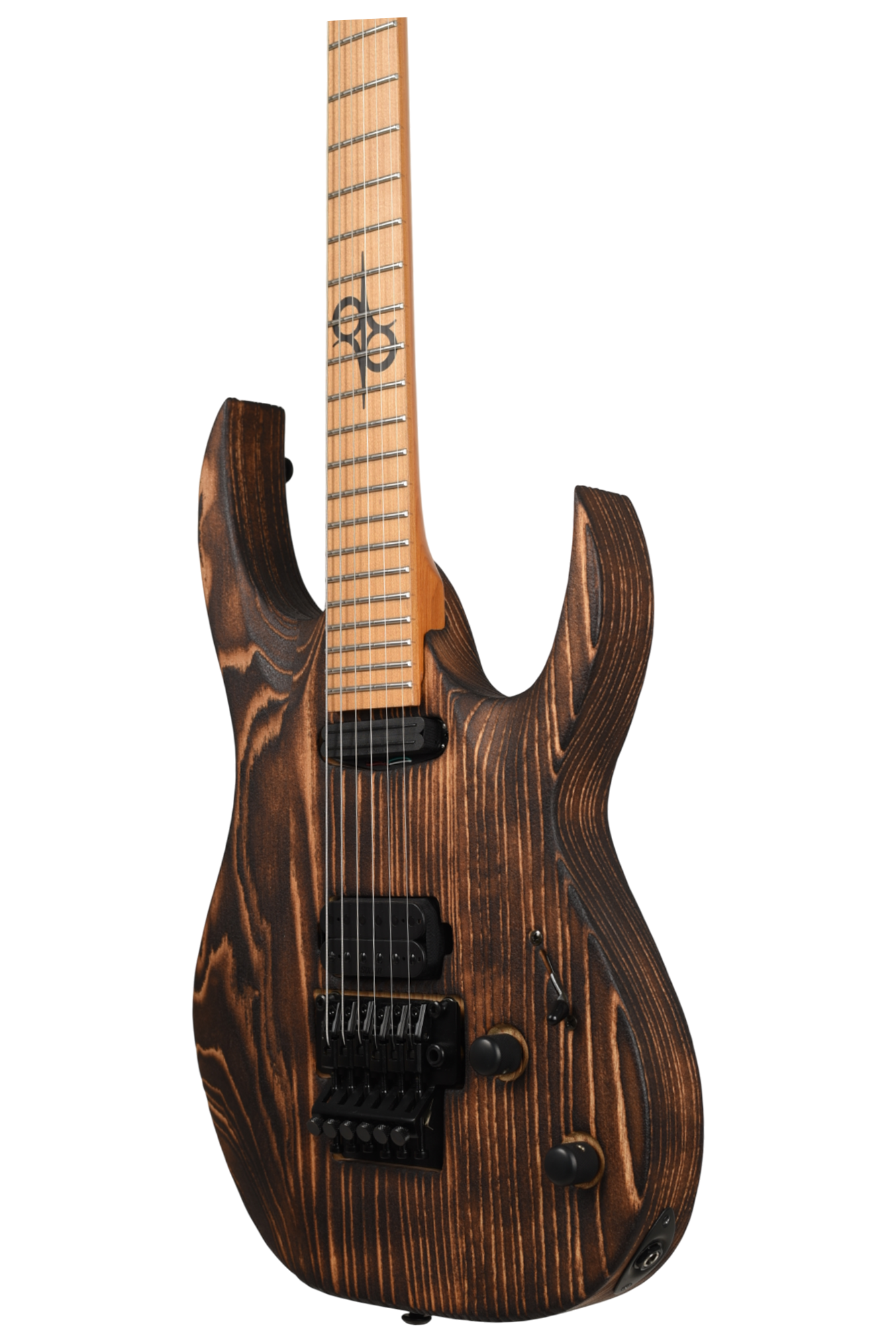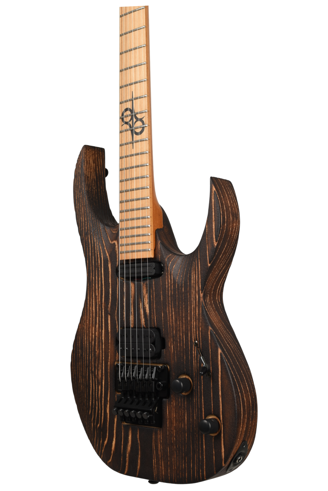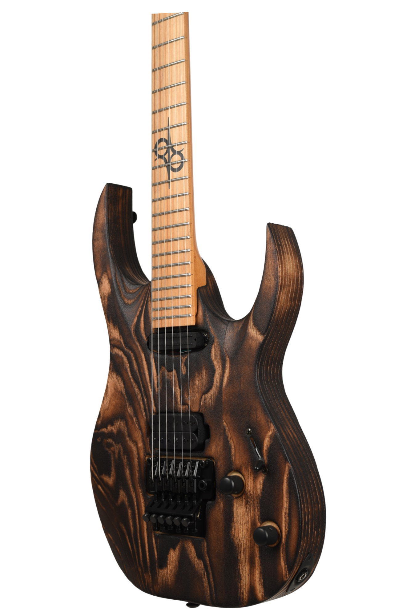 Your custom DESERT ROSE guitar starts with an AB1.6 Swamp Ash body and Roasted Maple neck. Similar like the PYRO, Torch Flame is applied so the natural heat deepens and burn into the grain lines of the body wood but with this model the body is completely burned and charred. From there it goes through a sanding step that leaves the wood with elements from the fire, but a texture that accentuates the grain and is inspired by the wind burned sand of a Desert Rose. It is a meticulous and lengthy process requiring much expertise and judgement. Sand and Fire impact grain and wood grain differently for every piece of wood, so each instrument is 100% completely unique. The headstock of the neck is then fire-branded with the Solar logo with edges burned to match the body, Afterwards the body is cleaned and poly sealer coats are applied. Once dry, assembly begins with the neck fitted with Solar locking tuners, Floyd Rose installation, pickups, electronics wiring, strings strung up and final set-up by our experienced luthiers to be ready for any level of professional stage or studio.