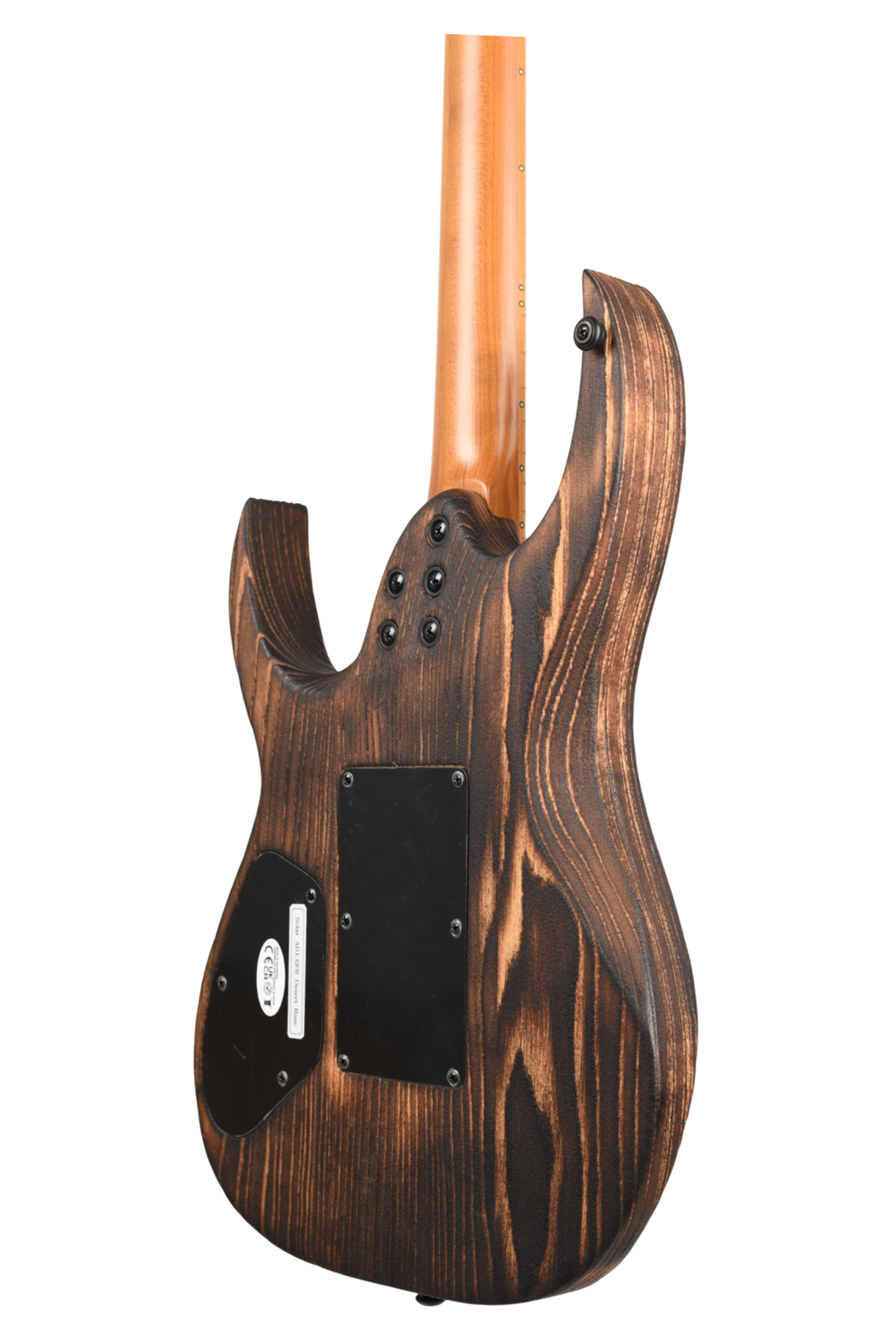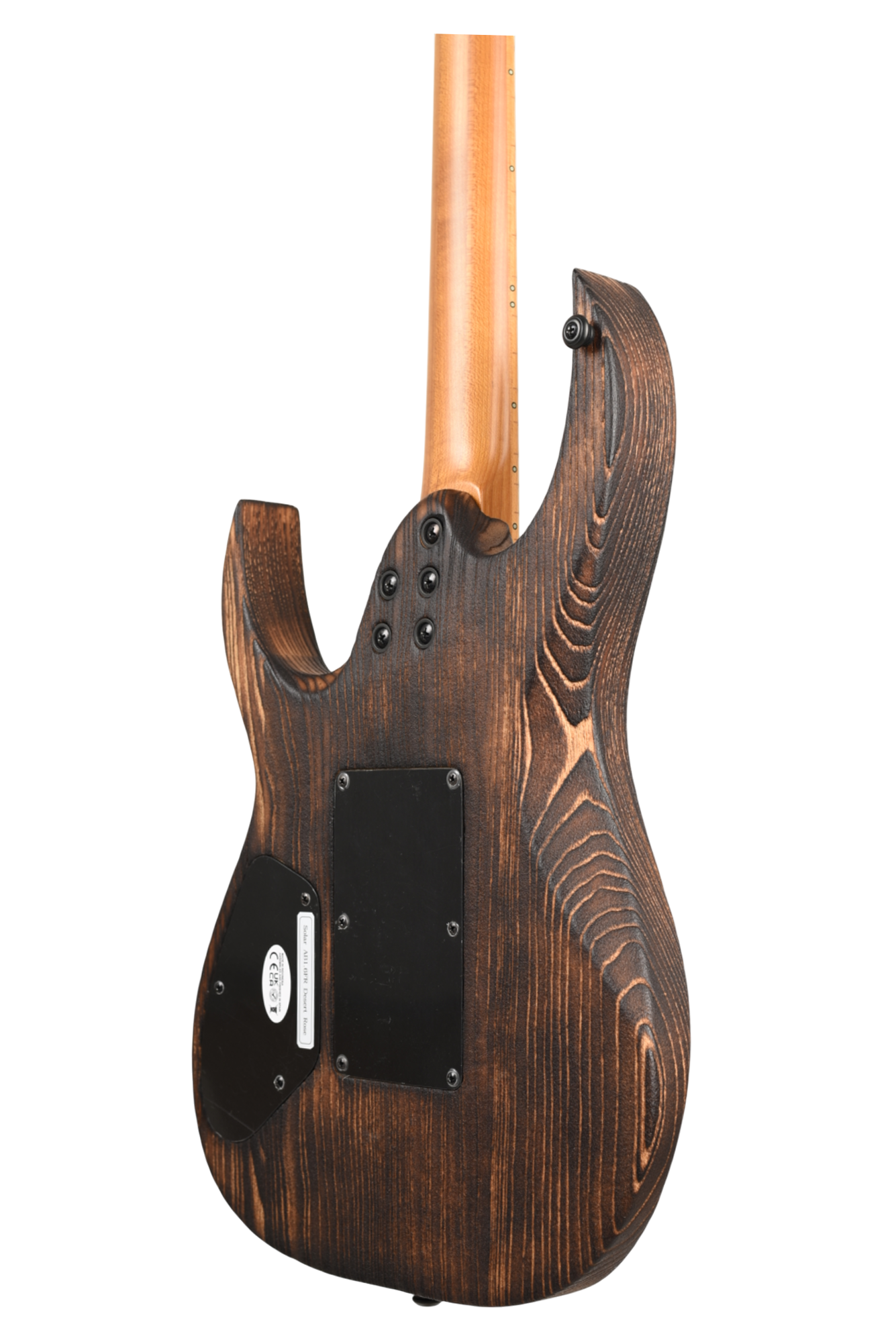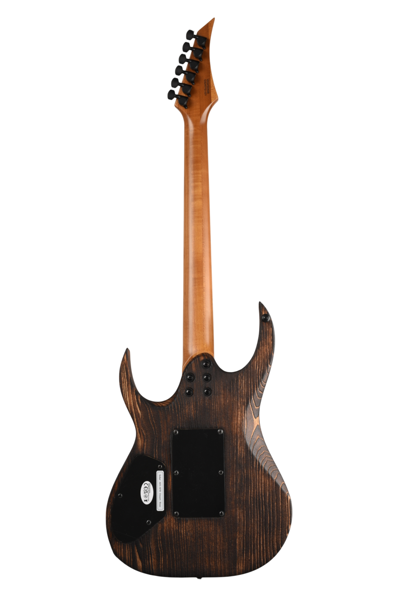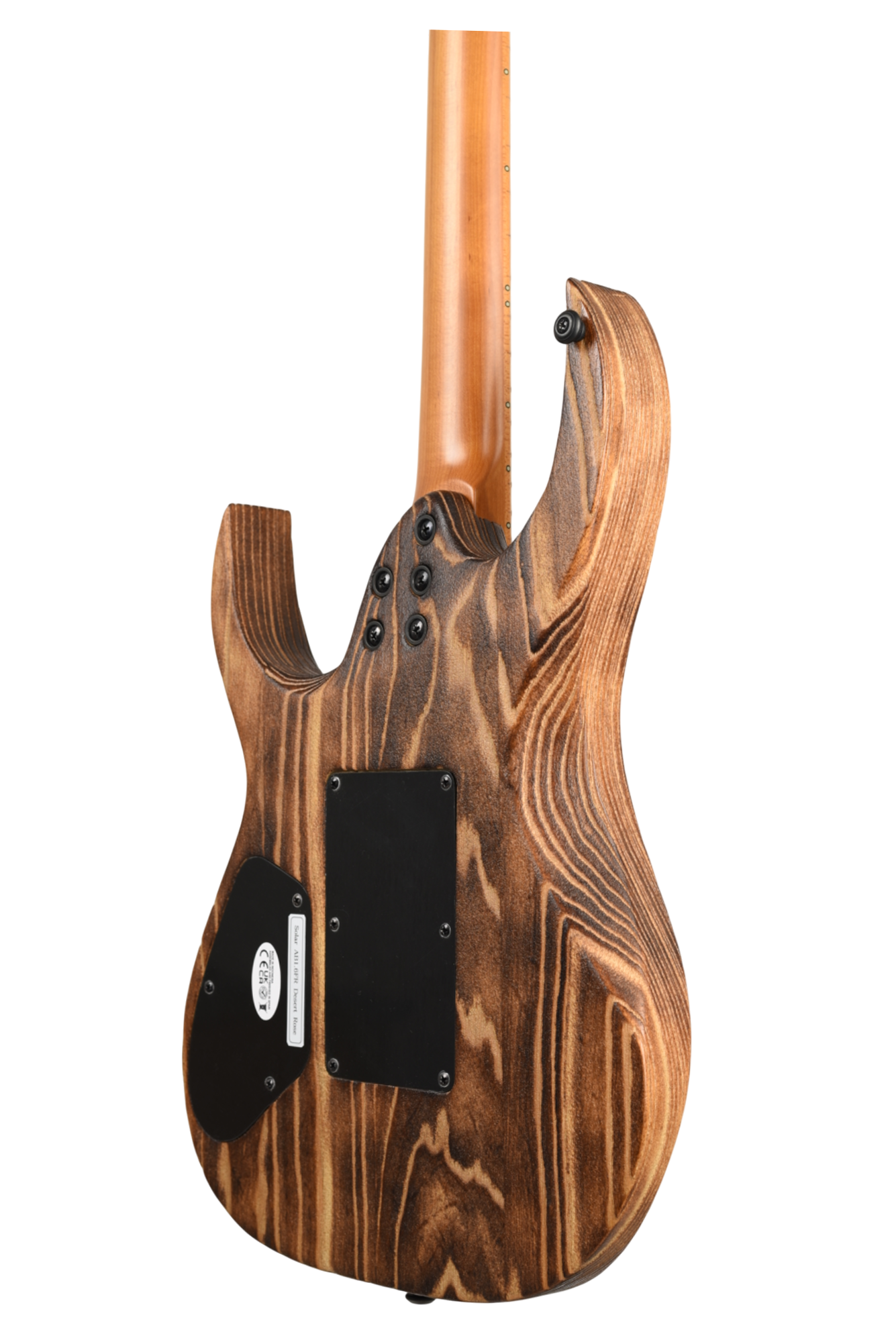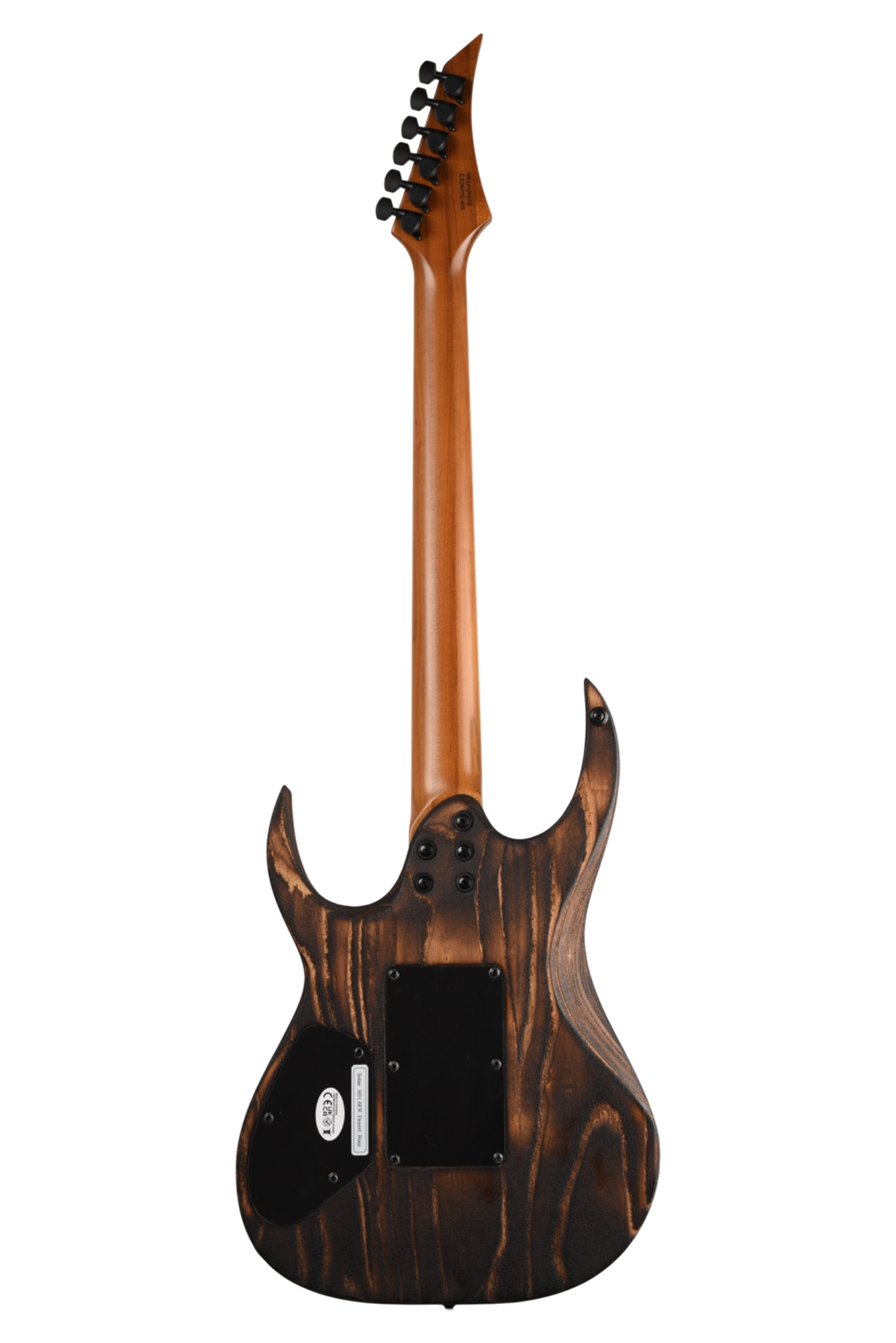 Your custom DESERT ROSE guitar starts with an AB1.6 Swamp Ash body and Roasted Maple neck. Similar like the PYRO, Torch Flame is applied so the natural heat deepens and burn into the grain lines of the body wood but with this model the body is completely burned and charred. From there it goes through a sanding step that leaves the wood with elements from the fire, but a texture that accentuates the grain and is inspired by the wind burned sand of a Desert Rose. It is a meticulous and lengthy process requiring much expertise and judgement. Sand and Fire impact grain and wood grain differently for every piece of wood, so each instrument is 100% completely unique. The headstock of the neck is then fire-branded with the Solar logo with edges burned to match the body, Afterwards the body is cleaned and poly sealer coats are applied. Once dry, assembly begins with the neck fitted with Solar locking tuners, Floyd Rose installation, pickups, electronics wiring, strings strung up and final set-up by our experienced luthiers to be ready for any level of professional stage or studio.
