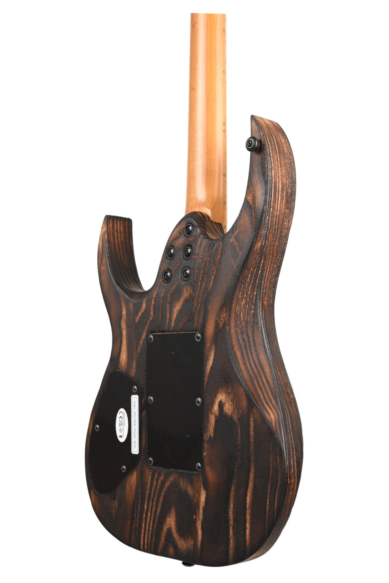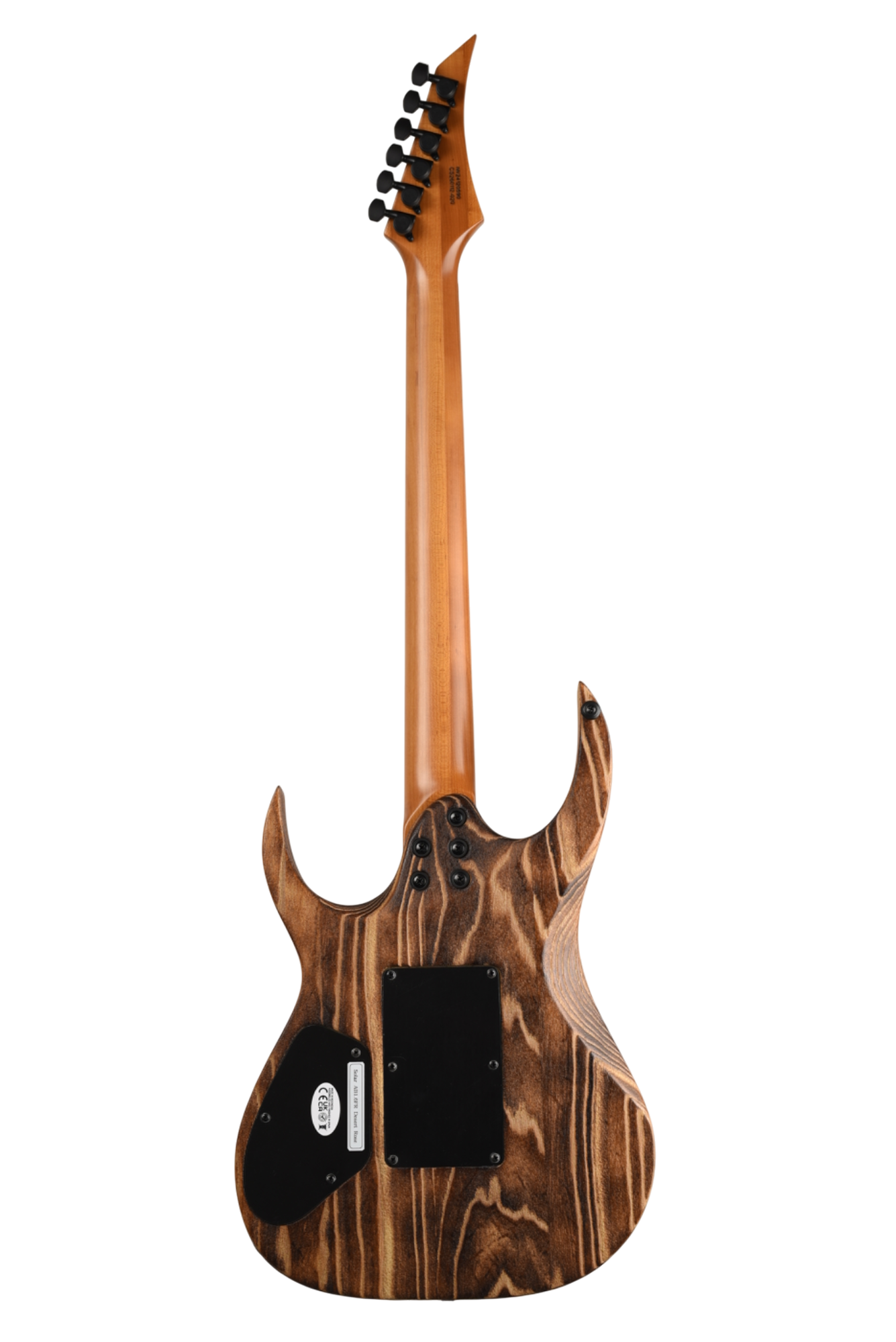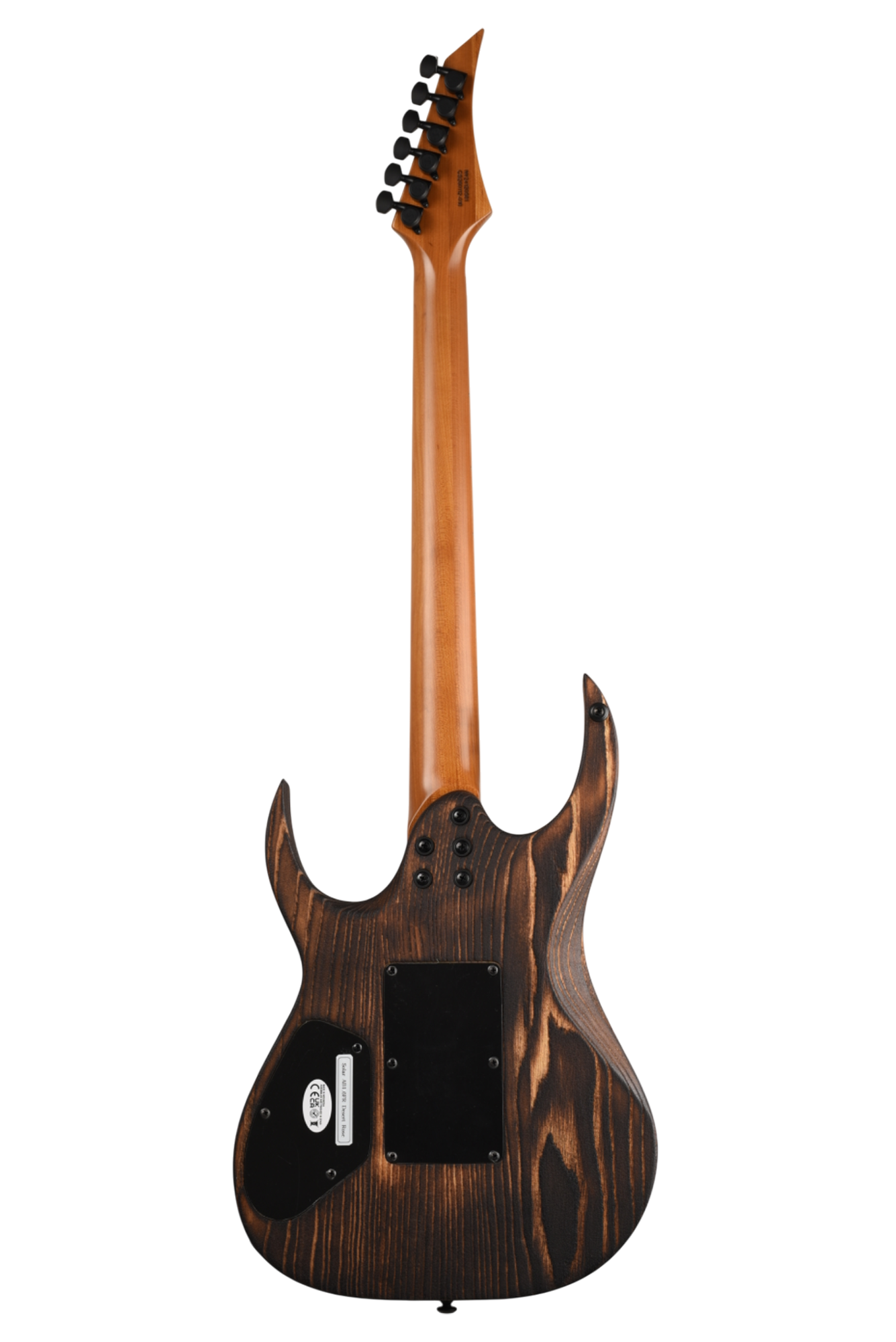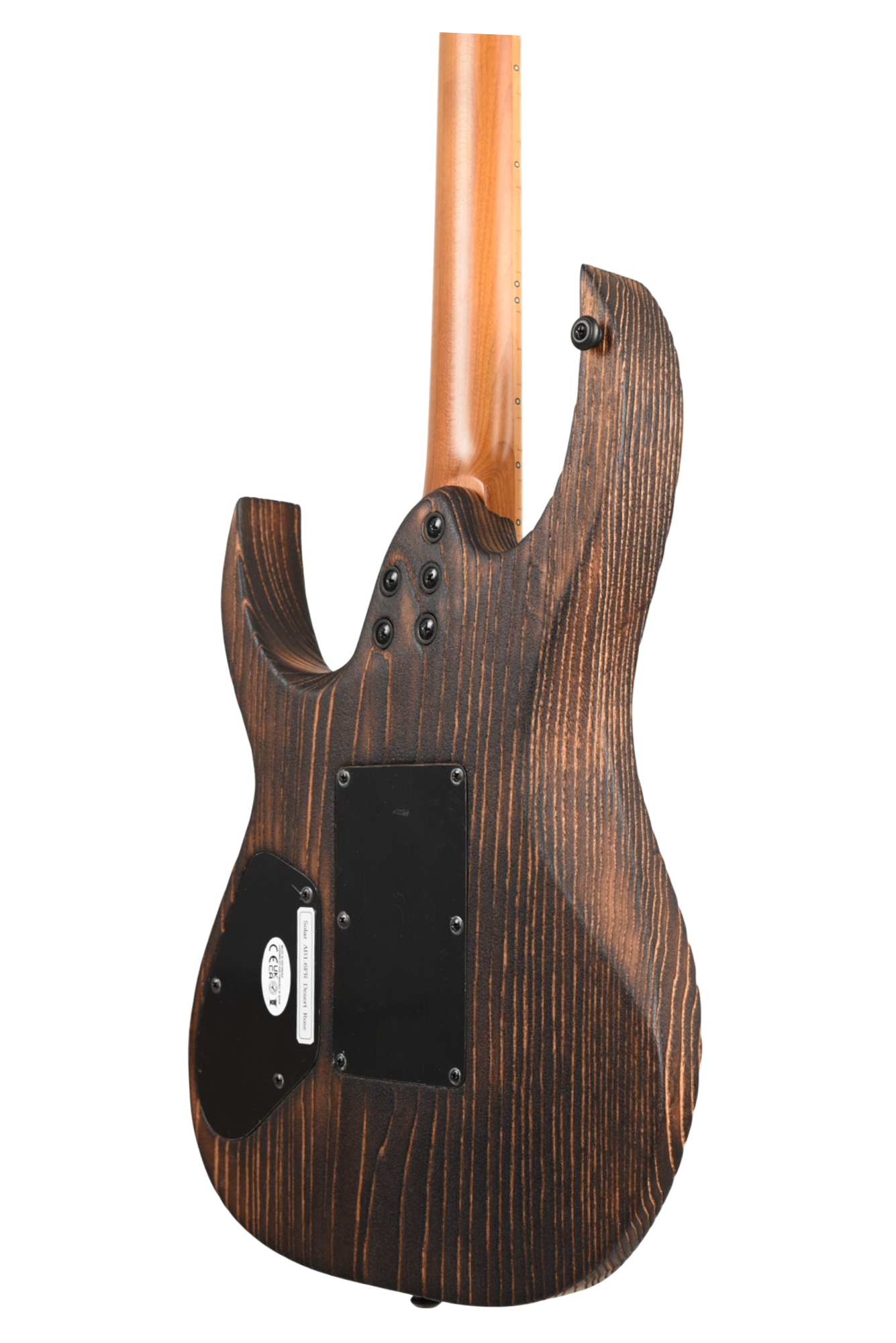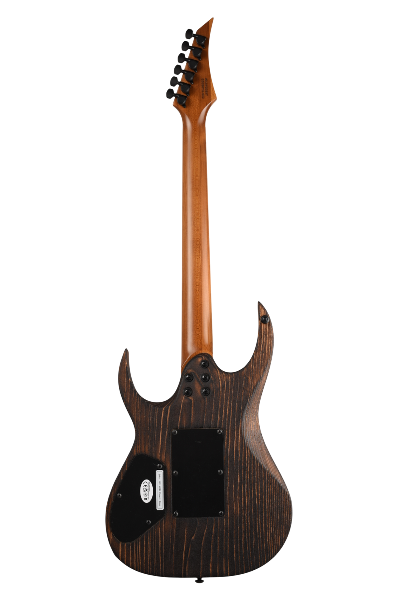 Your custom DESERT ROSE guitar starts with an AB1.6 Swamp Ash body and Roasted Maple neck. Similar like the PYRO, Torch Flame is applied so the natural heat deepens and burn into the grain lines of the body wood but with this model the body is completely burned and charred. From there it goes through a sanding step that leaves the wood with elements from the fire, but a texture that accentuates the grain and is inspired by the wind burned sand of a Desert Rose. It is a meticulous and lengthy process requiring much expertise and judgement. Sand and Fire impact grain and wood grain differently for every piece of wood, so each instrument is 100% completely unique. The headstock of the neck is then fire-branded with the Solar logo with edges burned to match the body, Afterwards the body is cleaned and poly sealer coats are applied. Once dry, assembly begins with the neck fitted with Solar locking tuners, Floyd Rose installation, pickups, electronics wiring, strings strung up and final set-up by our experienced luthiers to be ready for any level of professional stage or studio.