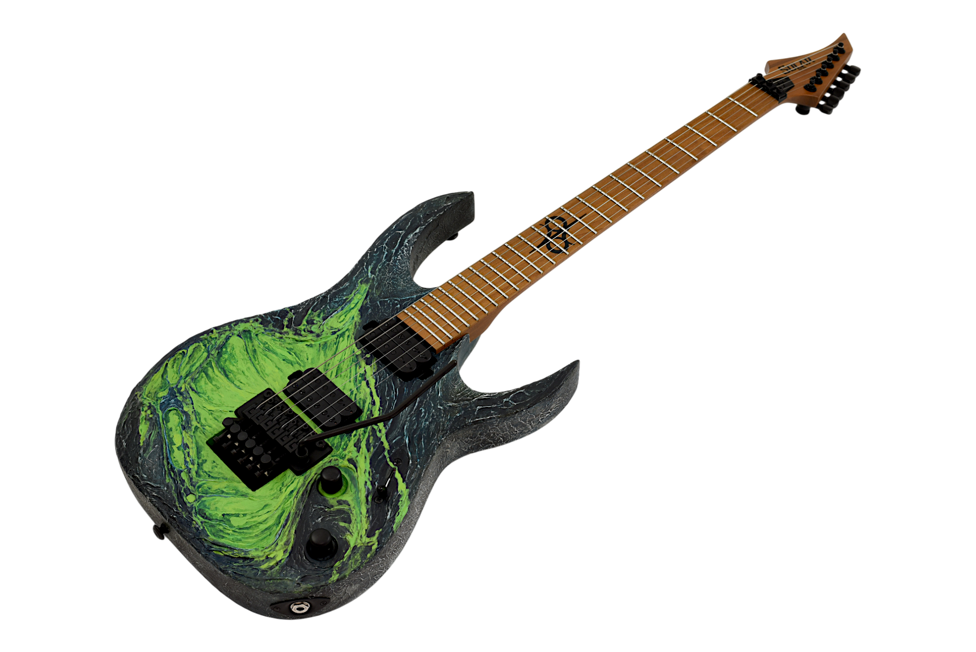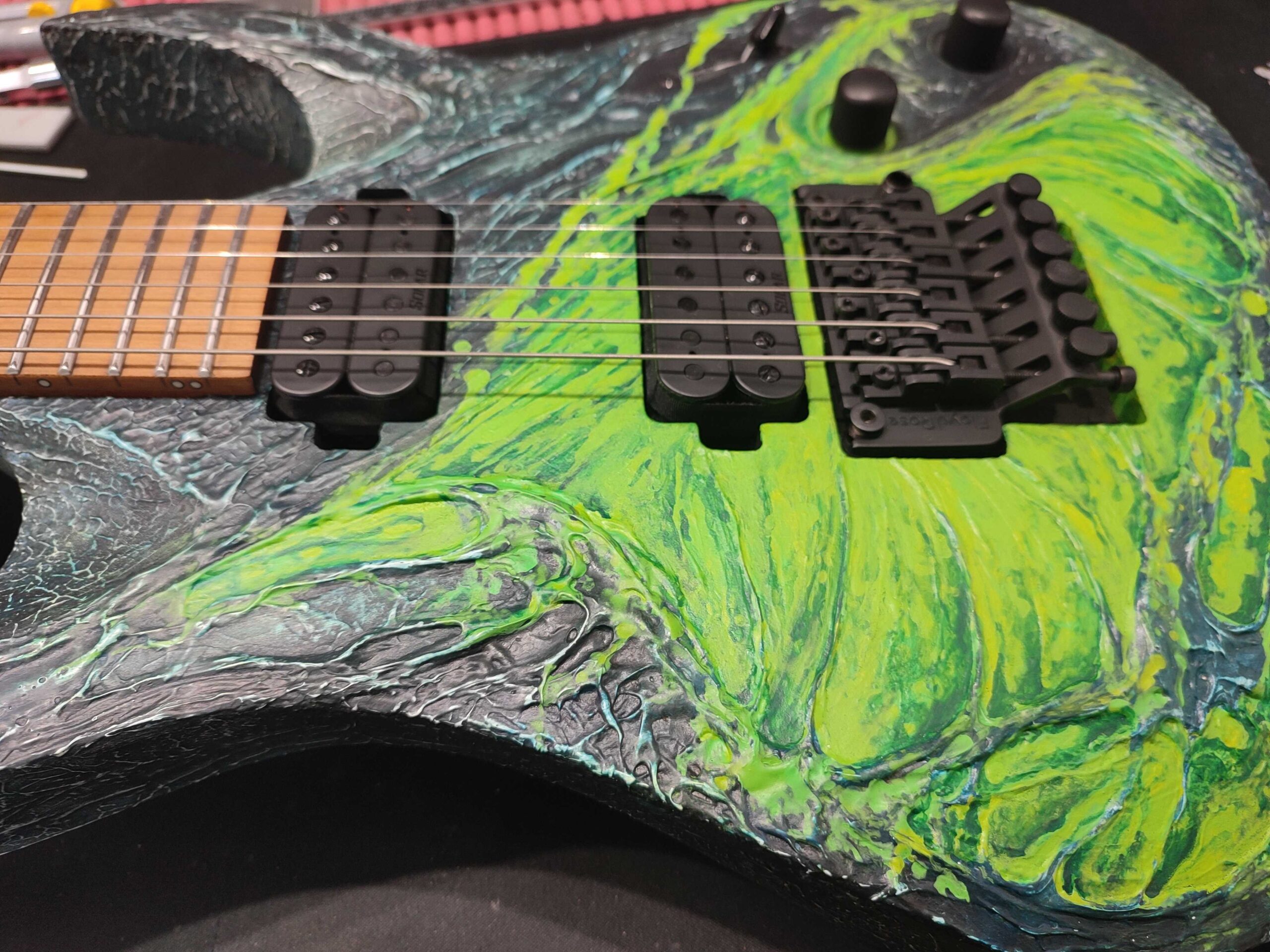 I was always a fan of good Sci Fi Horror and I always felt it is working hand in hand with great heavy metal music. The tension, the unknown, the darkness, the danger, the brutal force of alien predators, they shall all being one of the great sources of inspiration to write a very good riff. When I wanted to create a brutal riff for my band I was always going out in my mind for super intense scenes of great Sci Fi / Horror / Thrillers. Predator is probably in the top of the movie list so this way I come with the idea of bringing this character into metal music, under the form of a guitar handmade design. Knowing already Solar guitars and using their products for some years, I just knew my idea will fit the best with their brand. Because Solar has this unique beasty character, which simply works the best be covered in the flesh and (green) blood of most dangerous alien. The whole design is completely handmade, using exclusively acrylic paint and it depicts a brutal rendering of a wounded Predator’s body. Each copy is different, a unique piece of art. And this electric green blood is flying out from the core of this beast guitar, while you are shredding the horror! Enjoy!