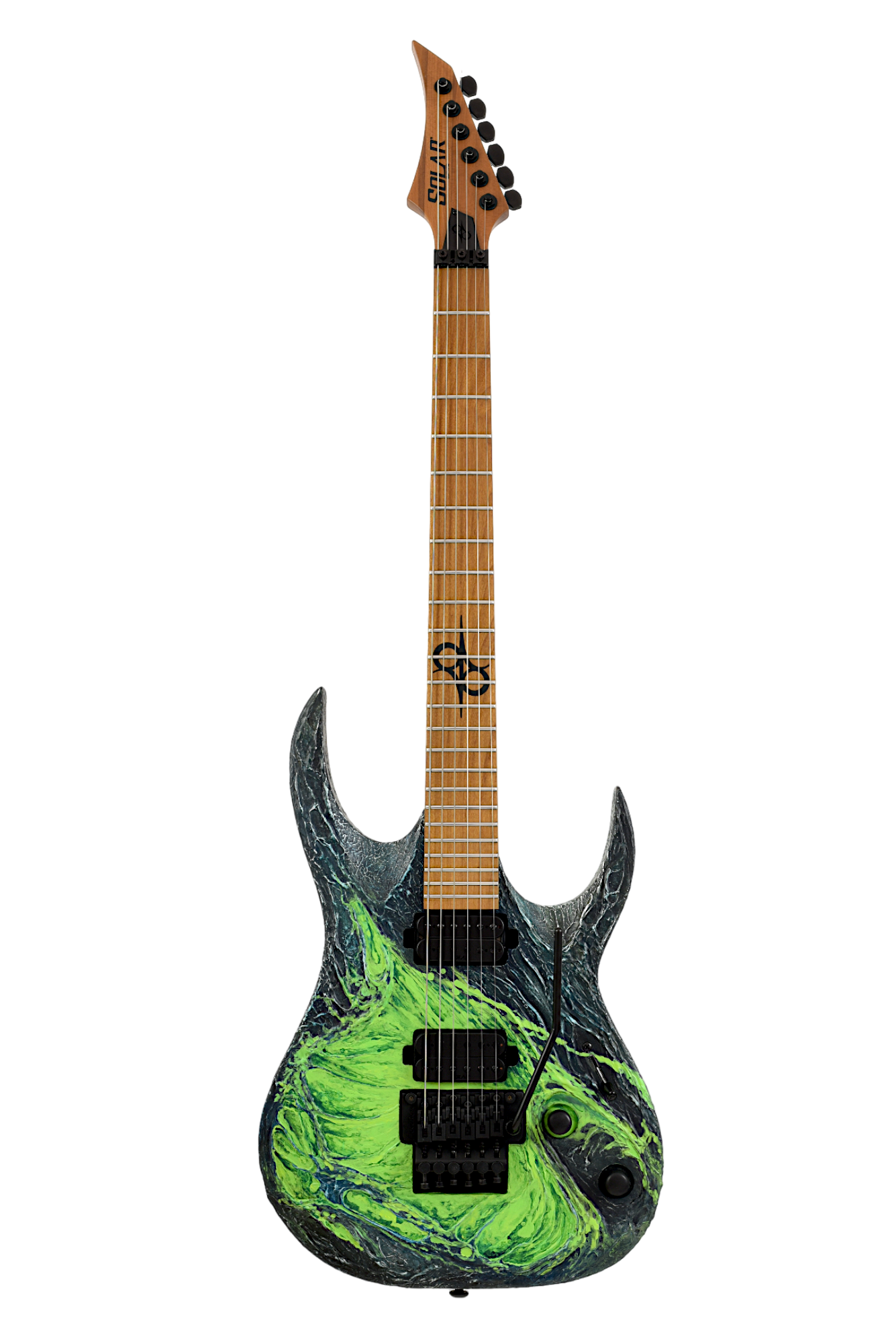 Once the hand-painted bodies arrive back in Spain, assembly commences with Solar locking tuners, Floyd Rose tremolo, Solar Modern Alnico-V humbuckers, electronics wiring, switchcraft jack and copper shielding before strings strung up with final set-up by our experienced luthiers to be ready for top level professional stage or studio use. MCAS Custom fitted ABS molded TSA flight-ready case is included along with a Certificate of Authenticity hand signed by Ola and the luthier that assembled each guitar.