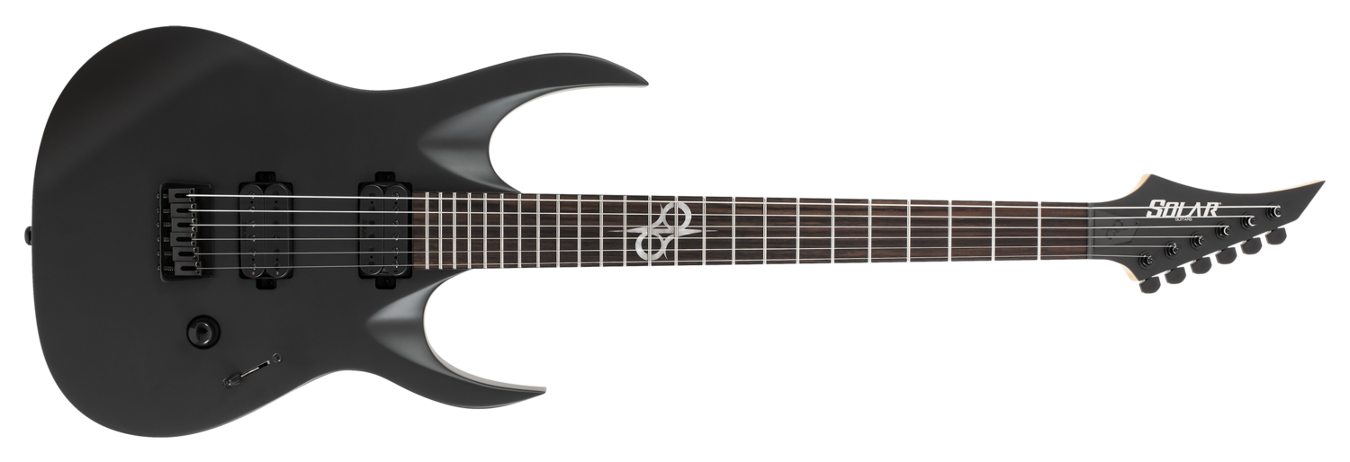 This Type AB2.6C six-string guitar boasts stealth looks, a distinctive cutaway scoop and a remarkable feature set, making it a precise, professional instrument suitable for both stage and studio work. It comes loaded with a reliable string-through-body hardtail , fixed bridge and a set of Solar Standard pickups provide classic Alnico tone. The Type AB2.6C is a bolt-on 25.5” scale instrument featuring a basswood body, comfortable maple neck and rosewood fingerboard with 24 super-jumbo frets. It also includes Solar locking tuners, Graphtech Nubone nut, black matte hardware, five-way blade pickup switching and full access neck. Available in carbon black matte finish.
