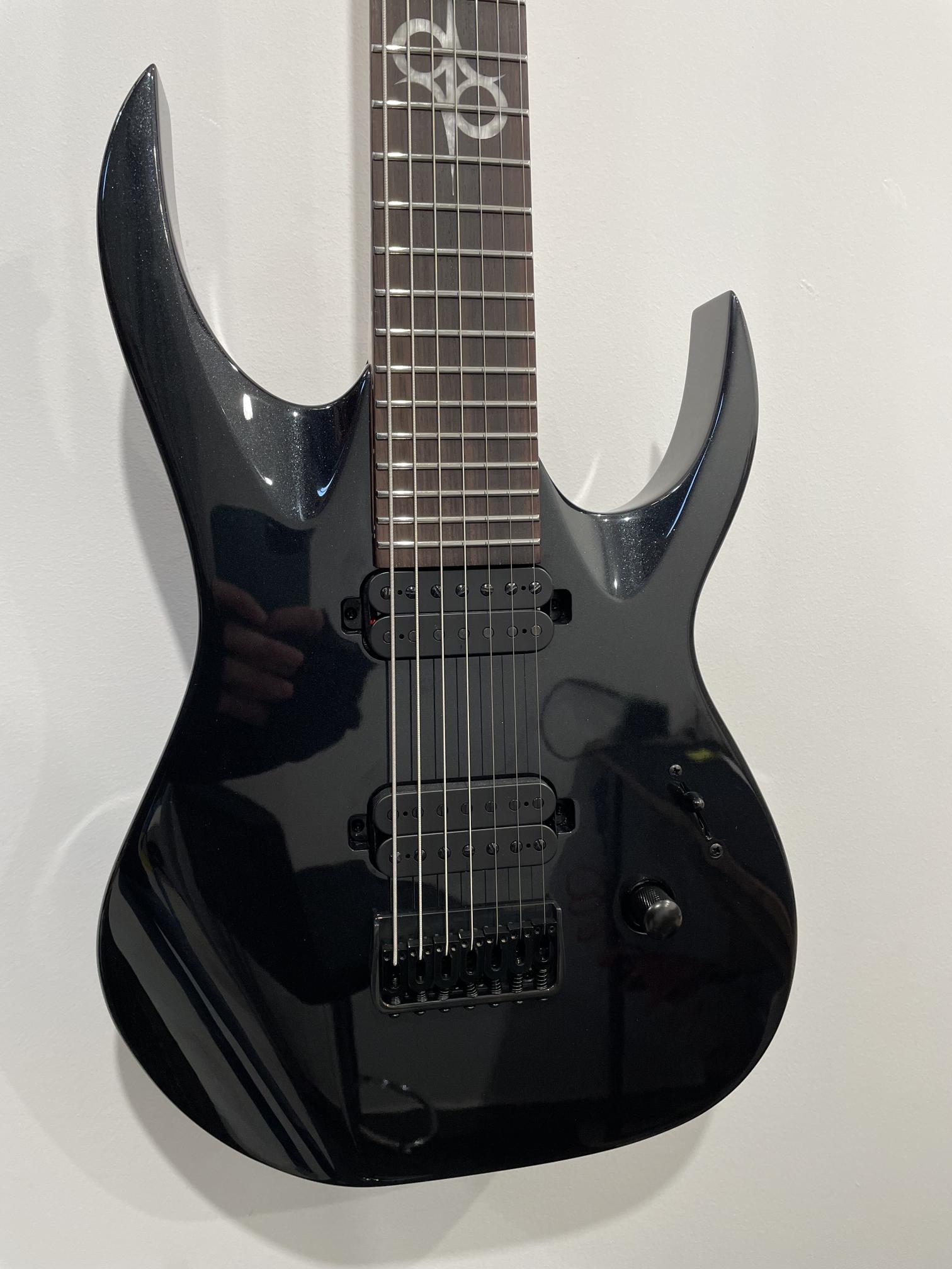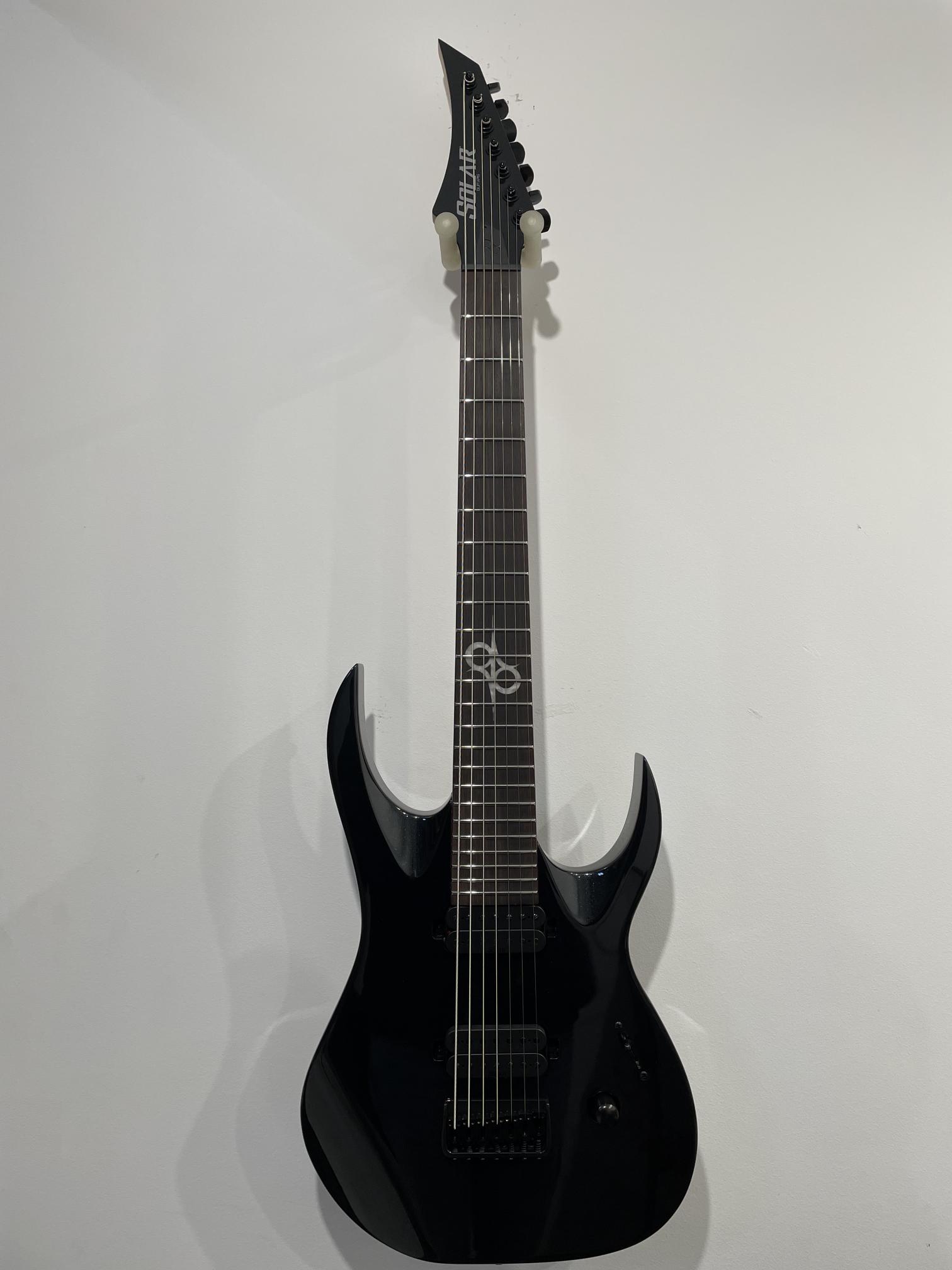 This Type AB2.7BSG six-string guitar boasts stealth looks, a distinctive cutaway scoop and a remarkable feature set, making it a precise, professional instrument suitable for both stage and studio work. It comes loaded with a reliable string-through-body hardtail bridge and a set of Solar Modern pickups provide classic Alnico tone. The Type AB2.7BSG is a bolt-on 25.5” scale instrument featuring a basswood body, comfortable maple neck and rosewood fingerboard with 24 super-jumbo frets. It also includes Solar locking tuners, Graphtech Nubone nut, black matte hardware, five-way blade pickup switching and full access neck. Available in black sparkle metallic gloss finish.