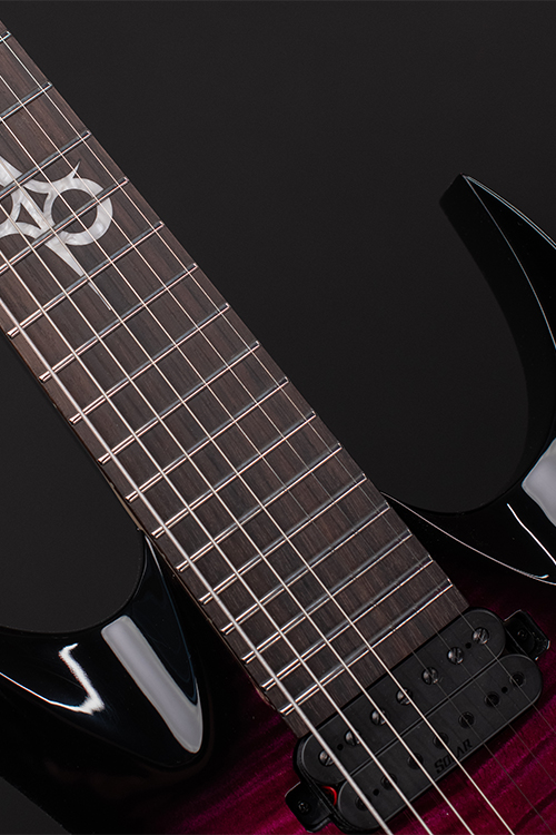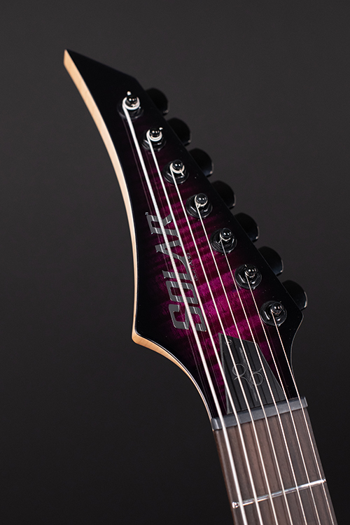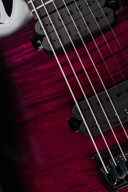This Type AB2.7FPBG six-string guitar boasts stealth looks, a distinctive cutaway scoop and a remarkable feature set, making it a precise, professional instrument suitable for both stage and studio work. It comes loaded with a reliable string-through-body hardtail bridge and a set of Solar Modern pickups provide classic Alnico tone. The Type AB2.7FPBG is a bolt-on 25.5” scale instrument featuring a basswood body, comfortable maple neck and rosewood fingerboard with 24 super-jumbo frets. It also includes Solar locking tuners, Graphtech Nubone nut, black matte hardware, five-way blade pickup switching and full access neck. Available in flame purple burst gloss finish.