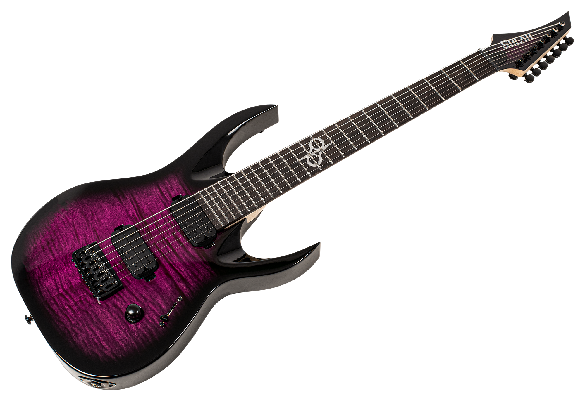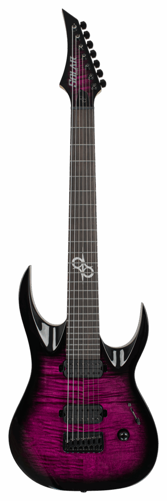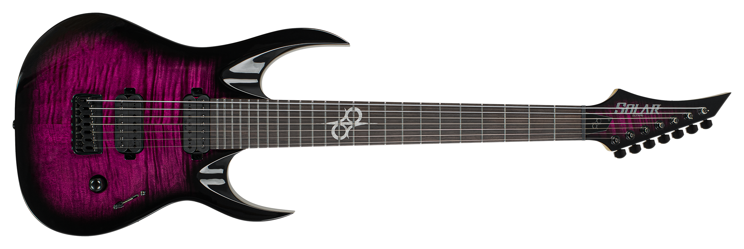 This Type AB2.7FPBG six-string guitar boasts stealth looks, a distinctive cutaway scoop and a remarkable feature set, making it a precise, professional instrument suitable for both stage and studio work. It comes loaded with a reliable string-through-body hardtail bridge and a set of Solar Modern pickups provide classic Alnico tone. The Type AB2.7FPBG is a bolt-on 25.5” scale instrument featuring a basswood body, comfortable maple neck and rosewood fingerboard with 24 super-jumbo frets. It also includes Solar locking tuners, Graphtech Nubone nut, black matte hardware, five-way blade pickup switching and full access neck. Available in flame purple burst gloss finish.