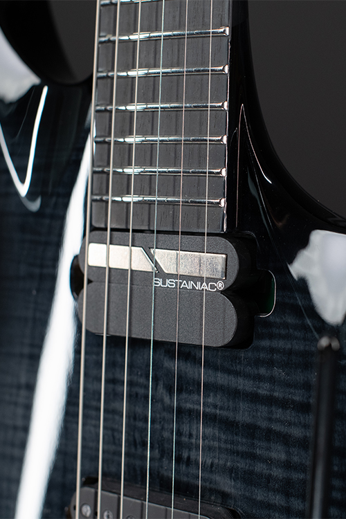 This Type AC1.6FRFBB Sustainiac+ carved top six-string guitar boasts stealth looks, a distinctive cutaway scoop and a remarkable feature set, making it the ultimate, precise and professional instrument suitable for both stage and studio work. This guitar features a “made in the USA” Hipshot bridge and is loaded with Duncan Solar pickups that provide a full spectrum of tonal options, from organic clean to heavily overdriven, all with fluid sustain and maximum clarity. The Type AC1.6FRFBB Sustainiac+ features a set-thru neck/body joint design with 25.5” scale, a swamp ash body, a fast, thin, comfortable maple neck, an ebony fingerboard with 24 super-jumbo stainless steel frets and Luminlay ‘glow in the dark’ side dots for easy stage use. Loaded with Solar 18:1 locking tuners, PPS nut, five-way blade pickup switching and full access neck. Available in flame black burst gloss finish.
