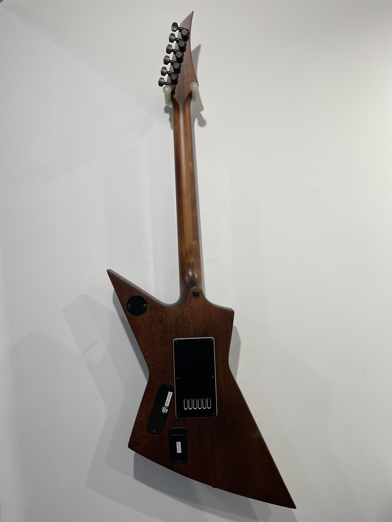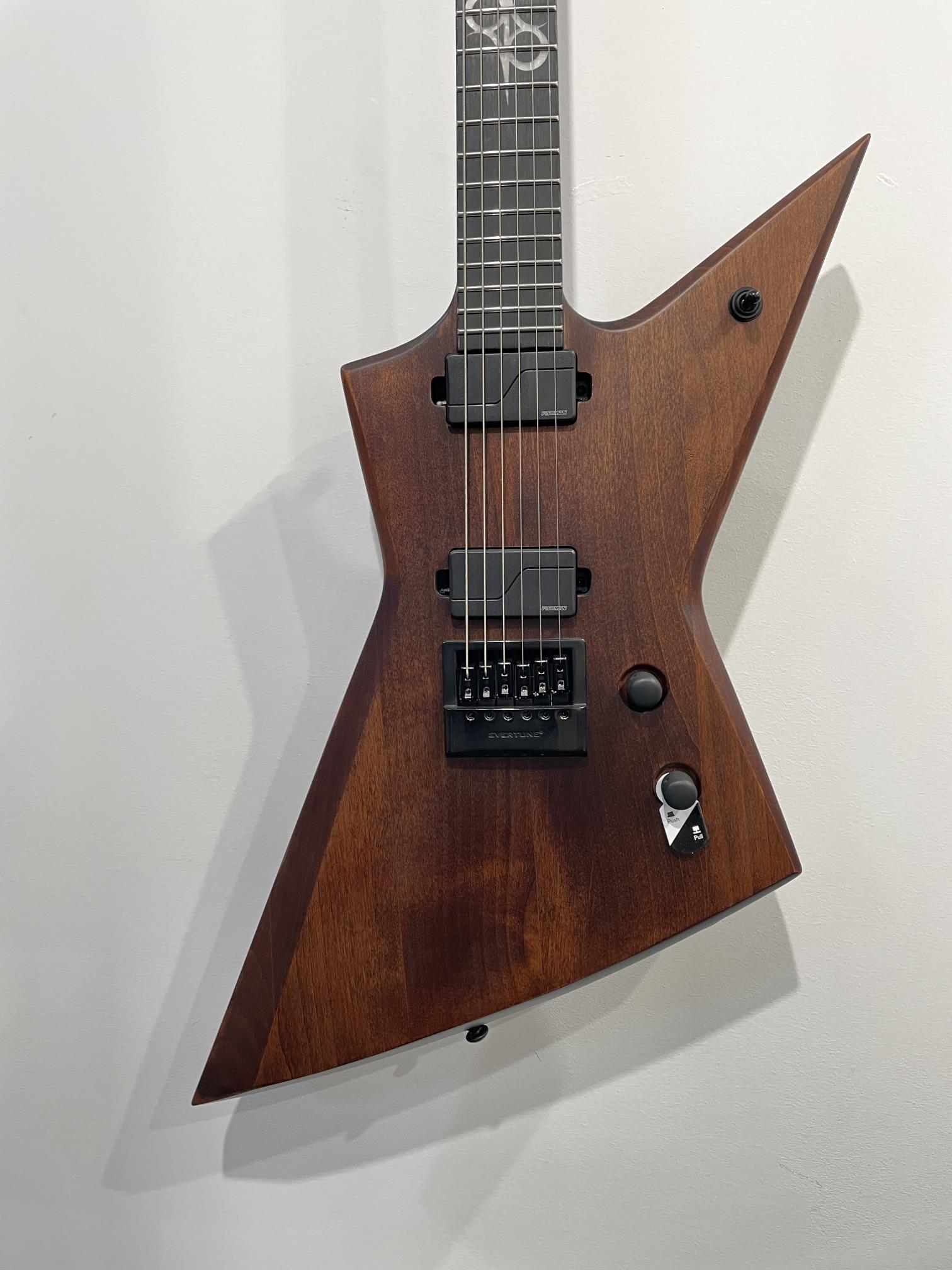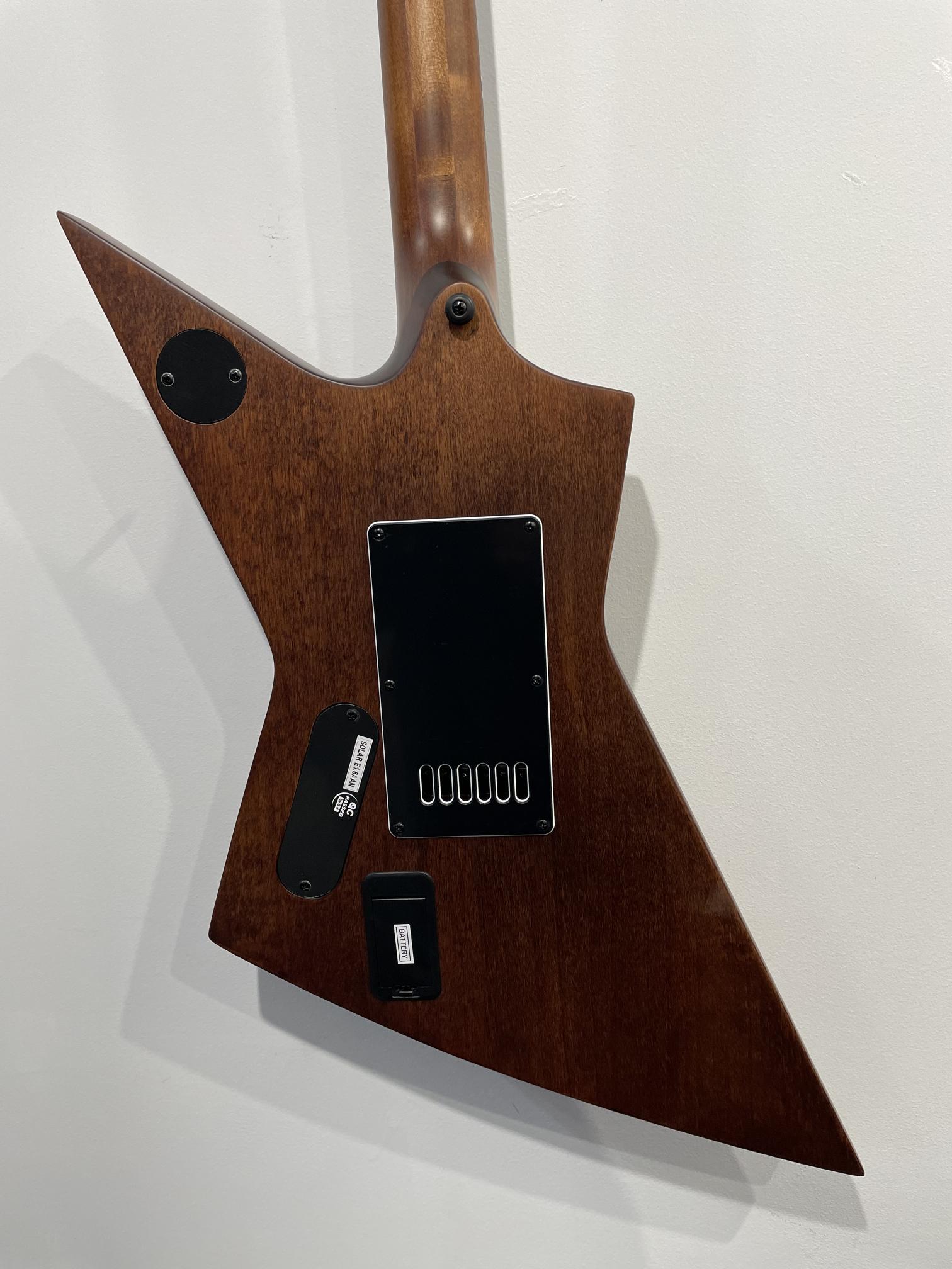 This Type E1.6AAN six-string metal weapon offers a comfortable, mean and sharp-looking armrest with a remarkable feature set, making it the ultimate, precise and professional guitar suitable for both stage and studio work. This guitar features the Evertune® constant-tension bridge—a reliable, fully-mechanical system that keeps the guitar in tune under any circumstances and is loaded with a pair of Fishman Fluence Modern active humbucker pickups revealing pure, uncorrupted and musical tone. The Type E1.6AAN features a set-thru neck/body joint design with 24.75” scale, aged natural matte alder body, a fast, thin, comfortable maple neck, an ebony fingerboard with 22 super-jumbo stainless steel frets and Luminlay ‘glow in the dark’ side dots for stage use. Loaded with Solar 18:1 locking tuners, PPS nut, 3-way toggle pickup switching with push-pull tone knob for voice selection and full access neck. Available in aged natural matte colour it also includes a Solar Type E deluxe gig bag. NOTE: Due to the aged wood finish guitars willingly feature wood streaks, small paint buildups, dings, discolouration, evident wood body joints, random wood tonality and finish imperfections. 9V battery is not included.