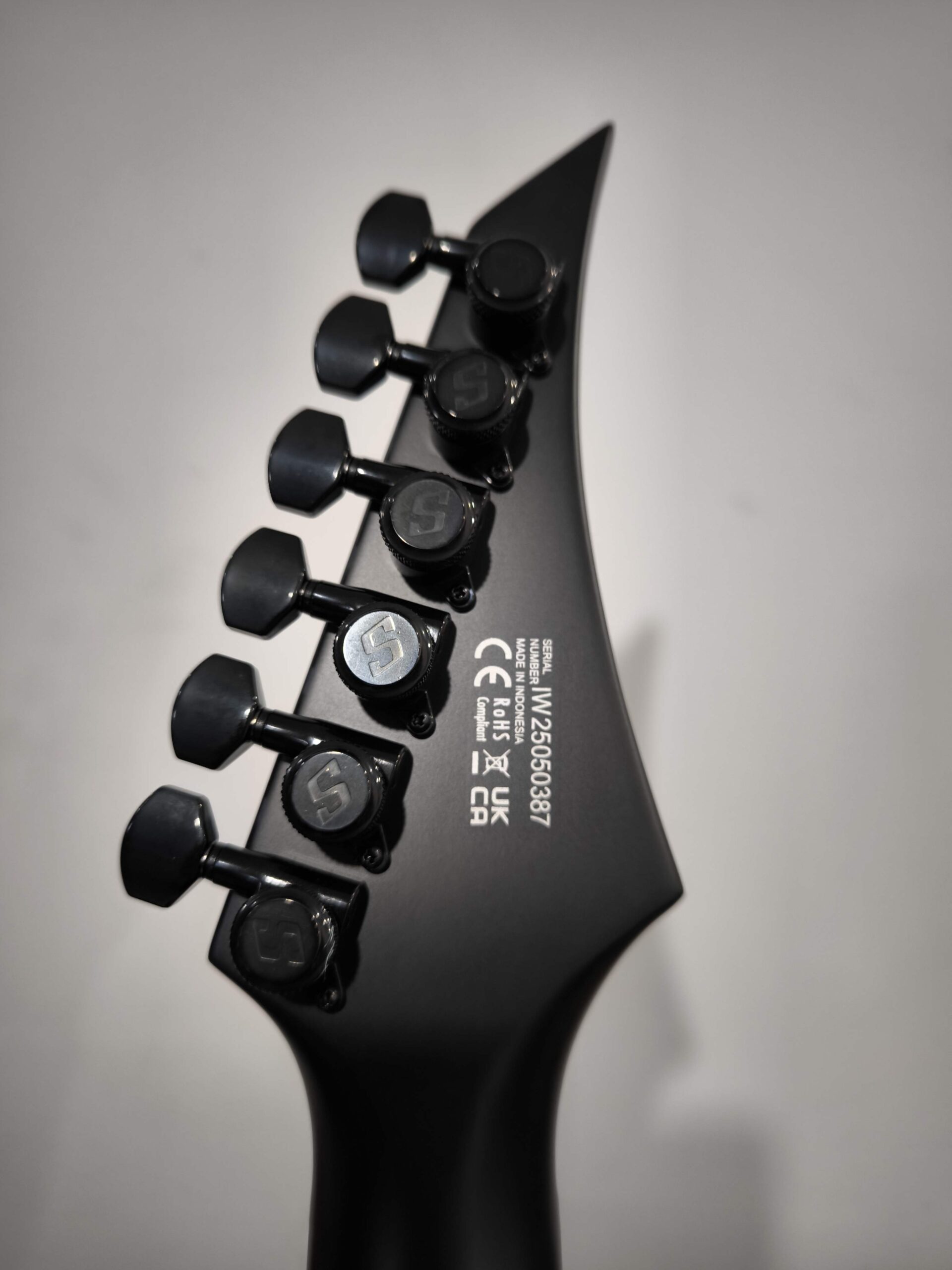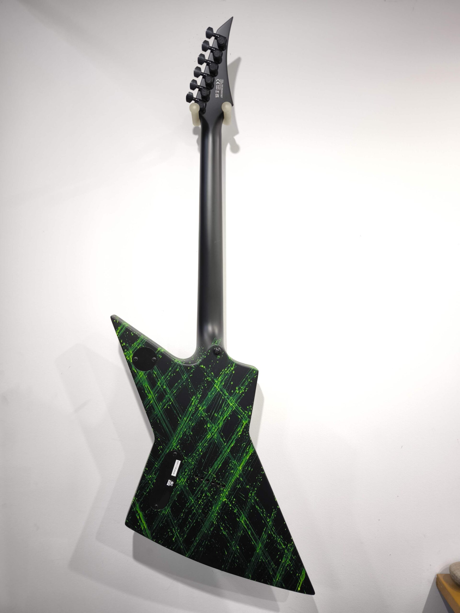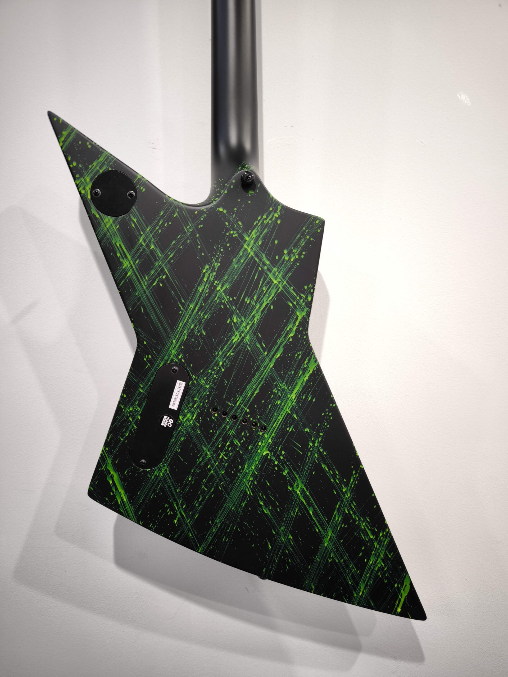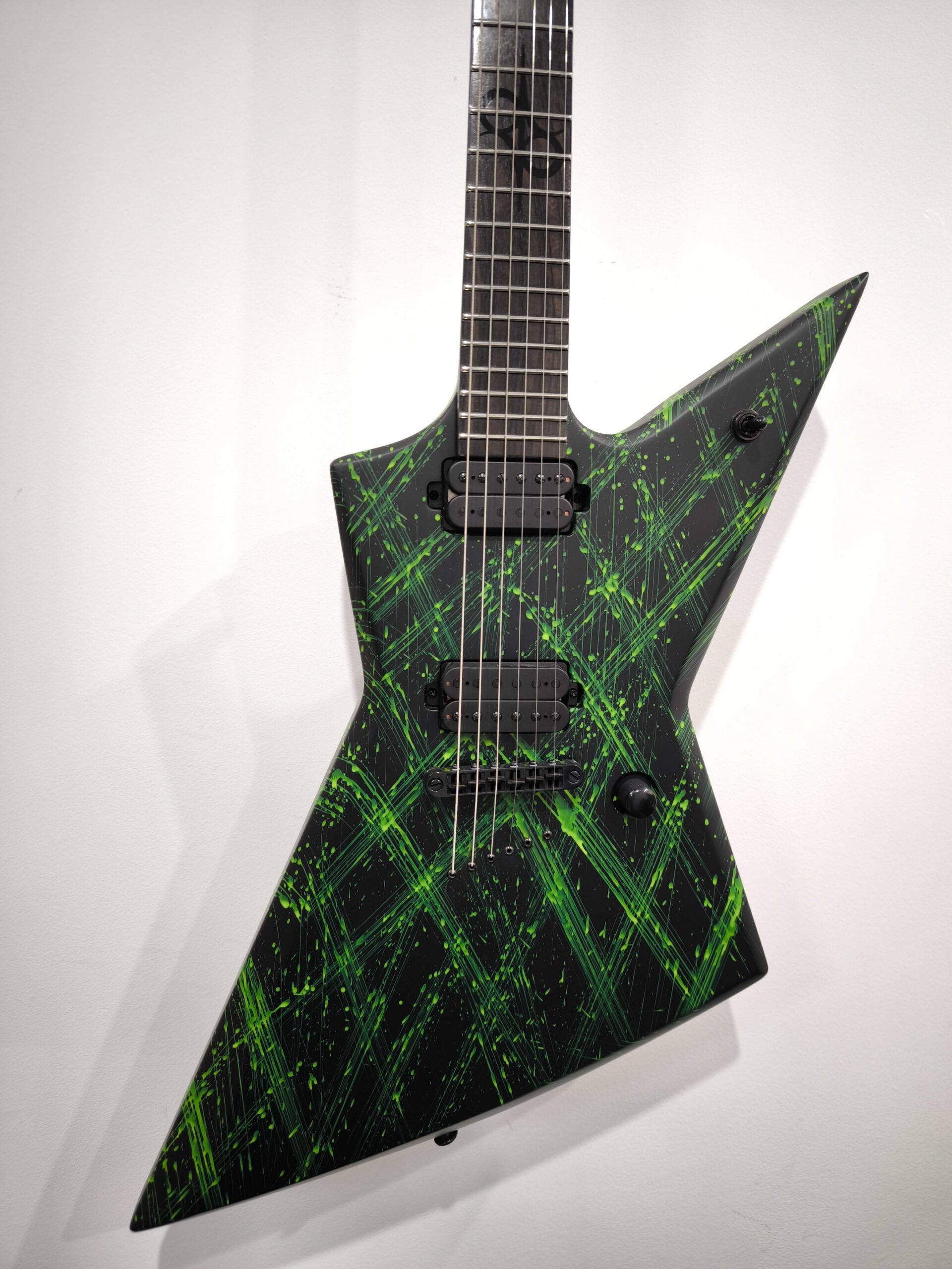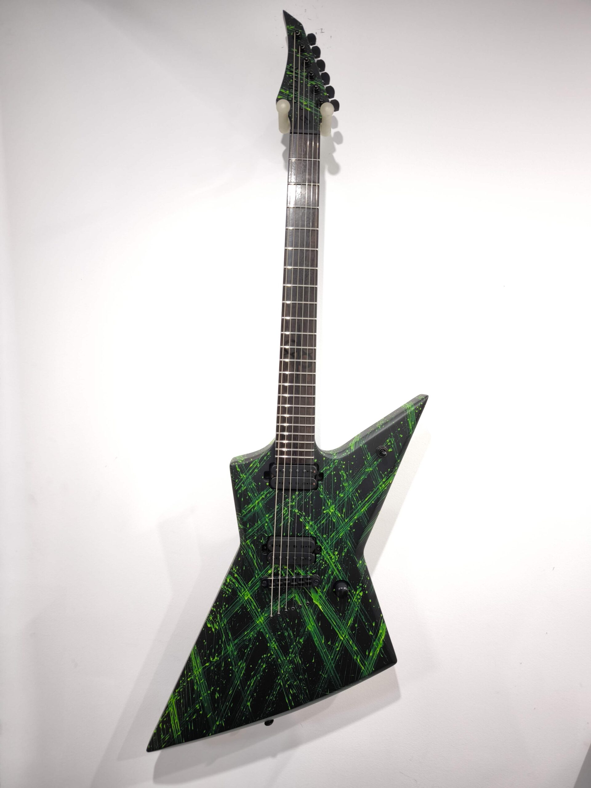 This Type E1.6TCLN Canibalismo six-string metal weapon offers a comfortable, mean and sharp-looking armrest with a remarkable feature set, making it the ultimate, precise and professional guitar suitable for both stage and studio work. This guitar features ta reliable Tonepros locking bridge. It also features Duncan Solar pickups that provide a full spectrum of tonal options, from organic clean to heavily overdriven, all with fluid sustain and maximum clarityThe Type E1.6TCLN Canibalismo features a set-thru neck/body joint design with 24.75” scale, alder body, a fast, thin, comfortable maple neck, an ebony fingerboard with 22 super-jumbo stainless steel frets and Luminlay ‘glow in the dark’ side dots for stage use. Loaded with Solar 18:1 locking tuners, PPS nut, 3-way toggle pickup switching and a single volume knob. Available in lemon neon splatter over carbon black, it also includes a Solar Type E deluxe gigbag.