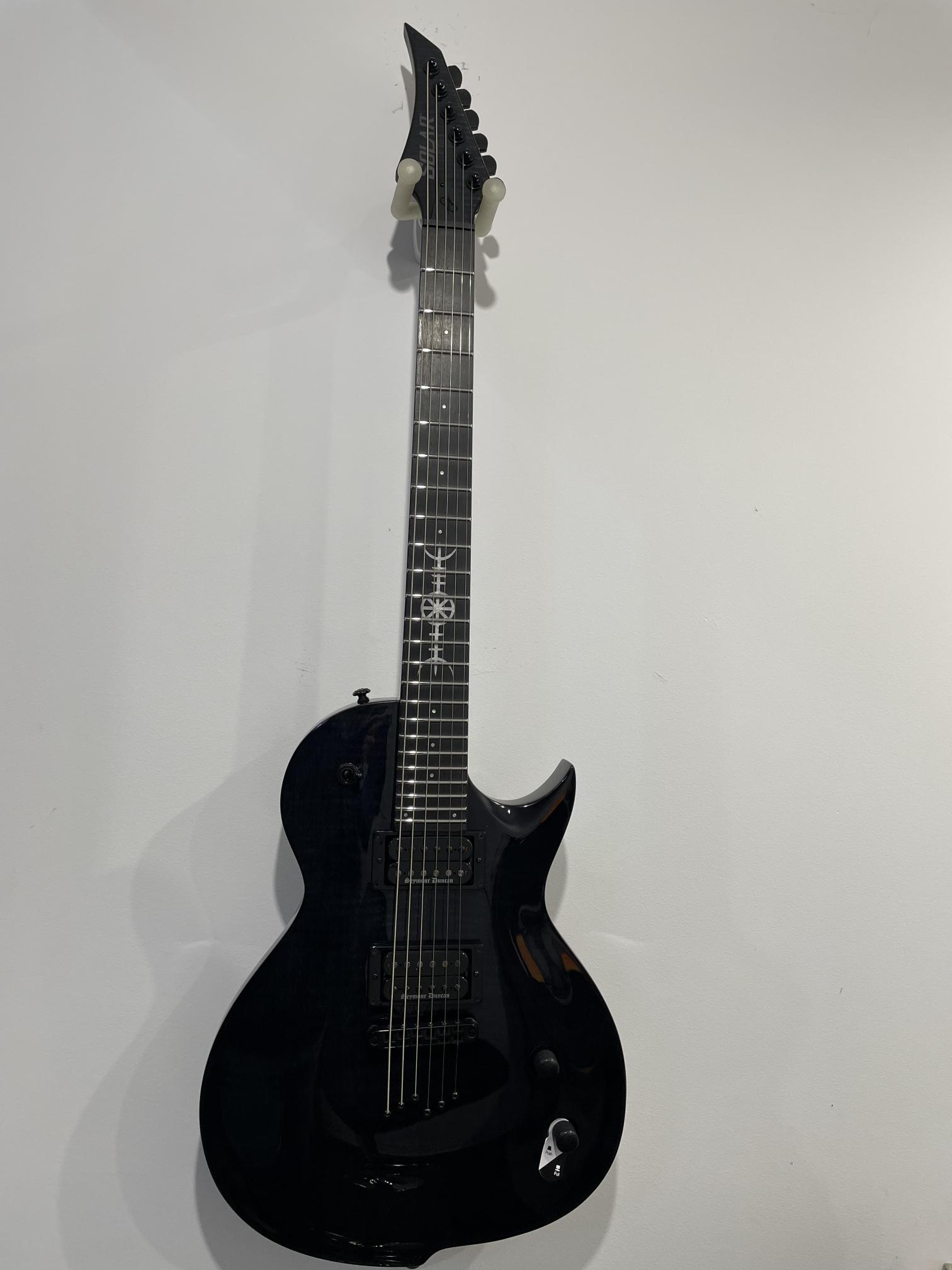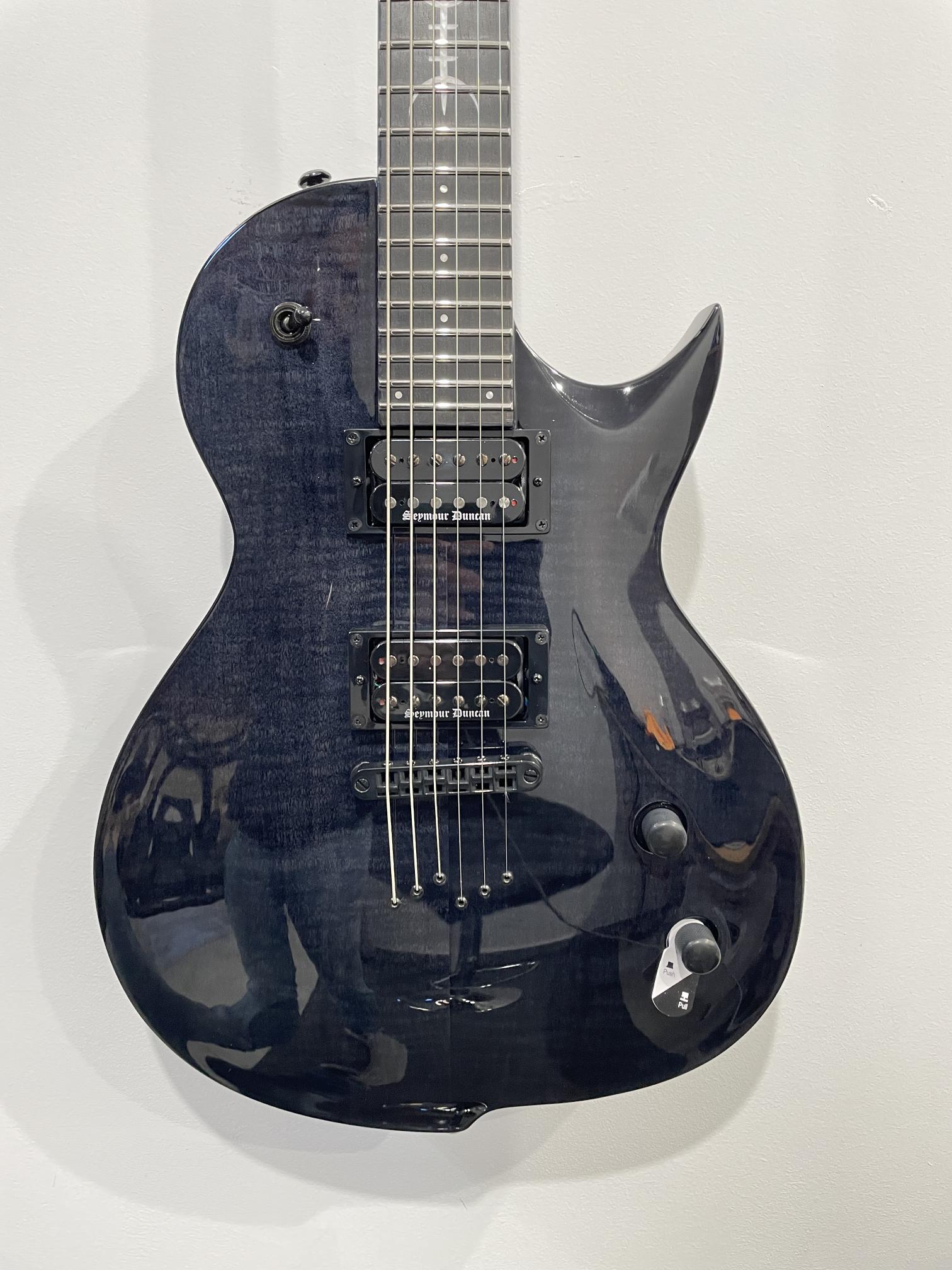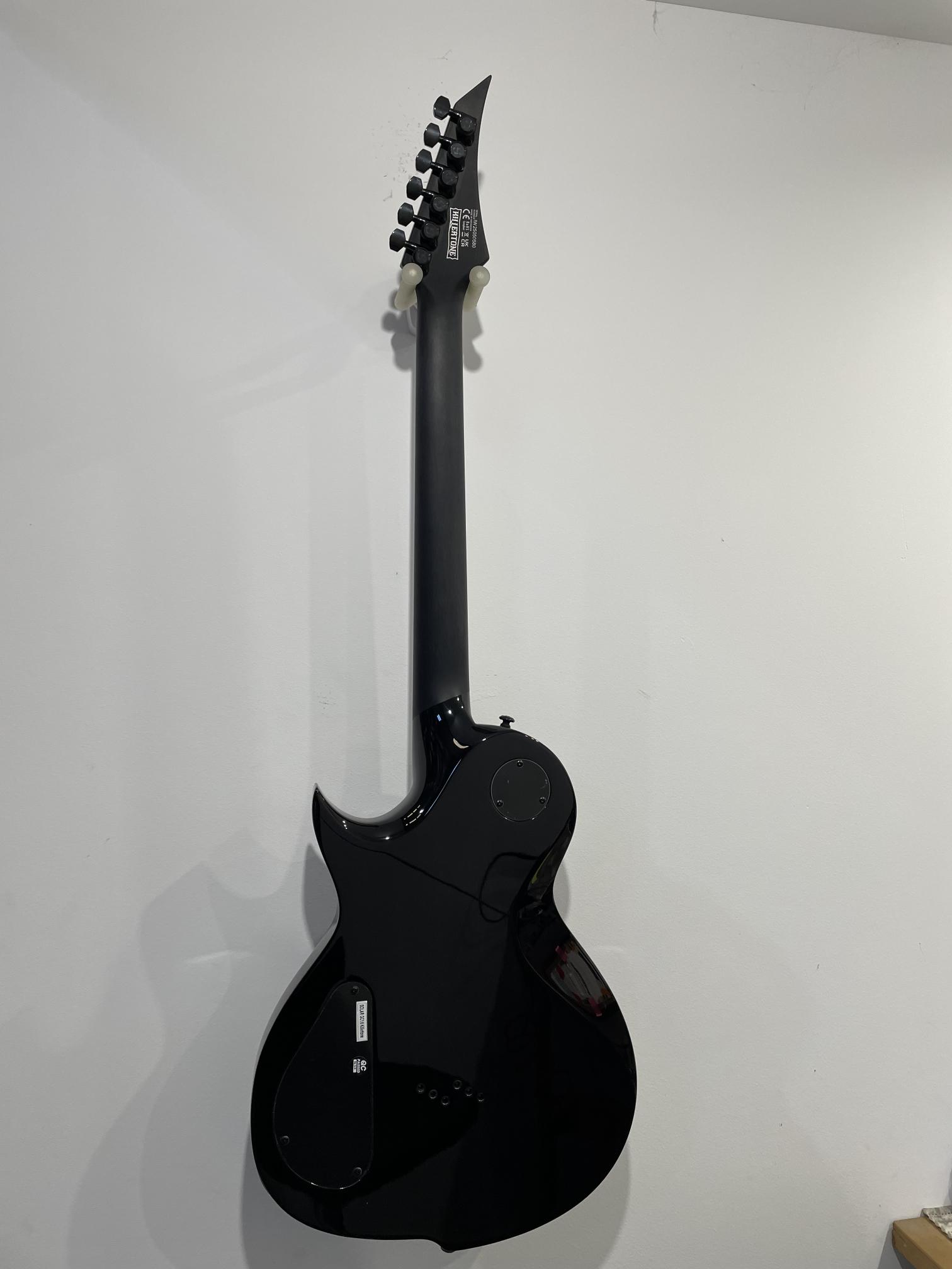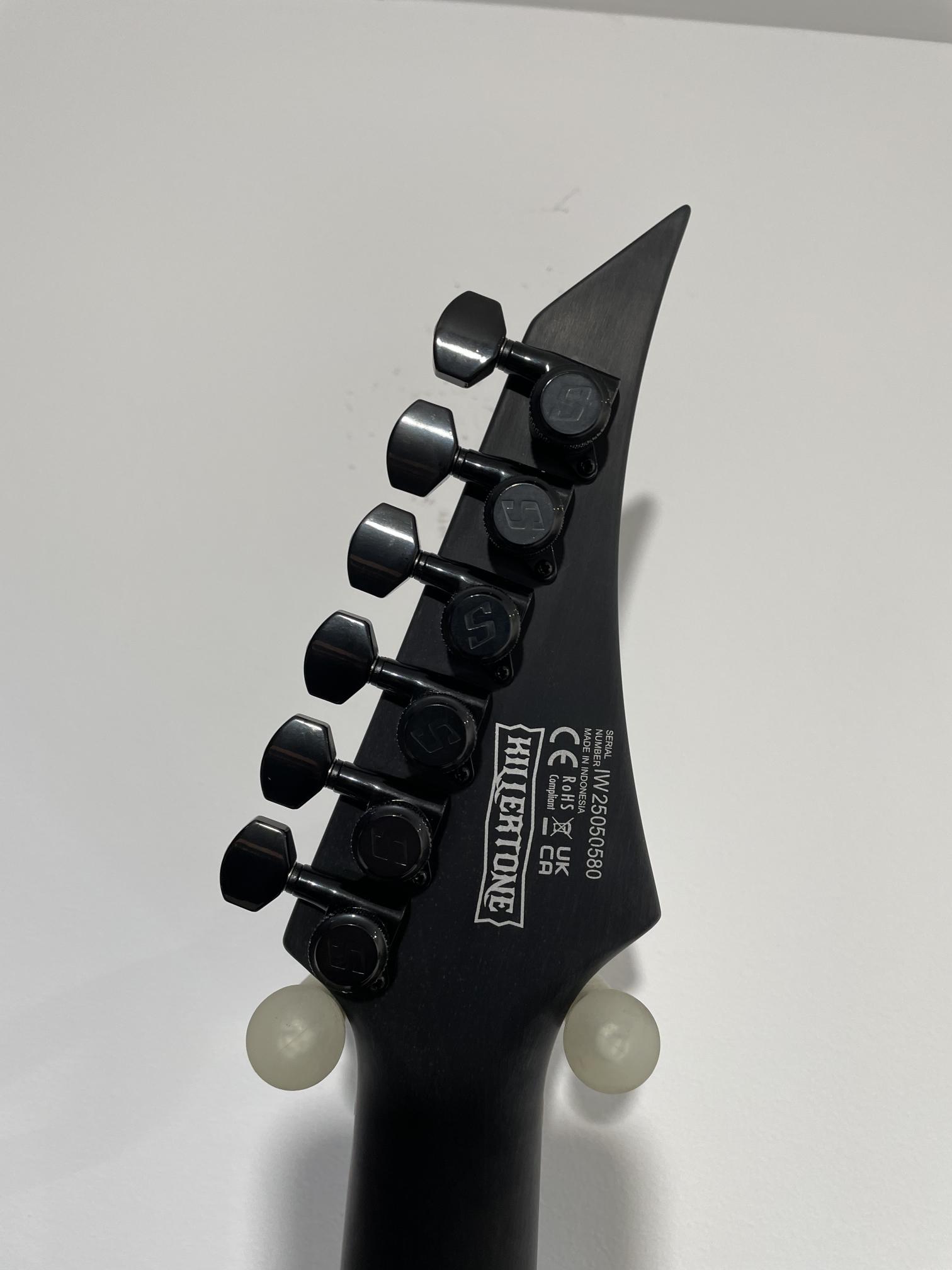 This Type G1 Killertone Artist Series guitar will set you apart from everybody else. With its distinctively arch top body shape and 6 inline pointy headstock this modern looking Type G single cutaway guitar has a remarkable, precise and professional feature set making it the ultimate choice for Jason Frankhouser’s stage and Killertone studio work. Loaded with a Tune-O-matic string thru bridge the GC1 Killertone offers Seymour Duncan Black Winter pickups that provide merciless high-output passive humbucker tone for most frigid Black Metal, Death Metal, or any other extreme style…as brutal as the Scandinavian Winter. It has a set-thru neck/body joint design with 24.75” scale, an mahogany body with flame veneer maple top, a fast, thin, comfortable mahogany neck with satin back of neck, an ebony fingerboard with 24 super-jumbo stainless steel frets and Luminlay ‘glow in the dark’ side dots for easy stage use. Loaded with Solar 18:1 locking tuners, PPS nut and full access neck, this guitar is available in flame black gloss finish.