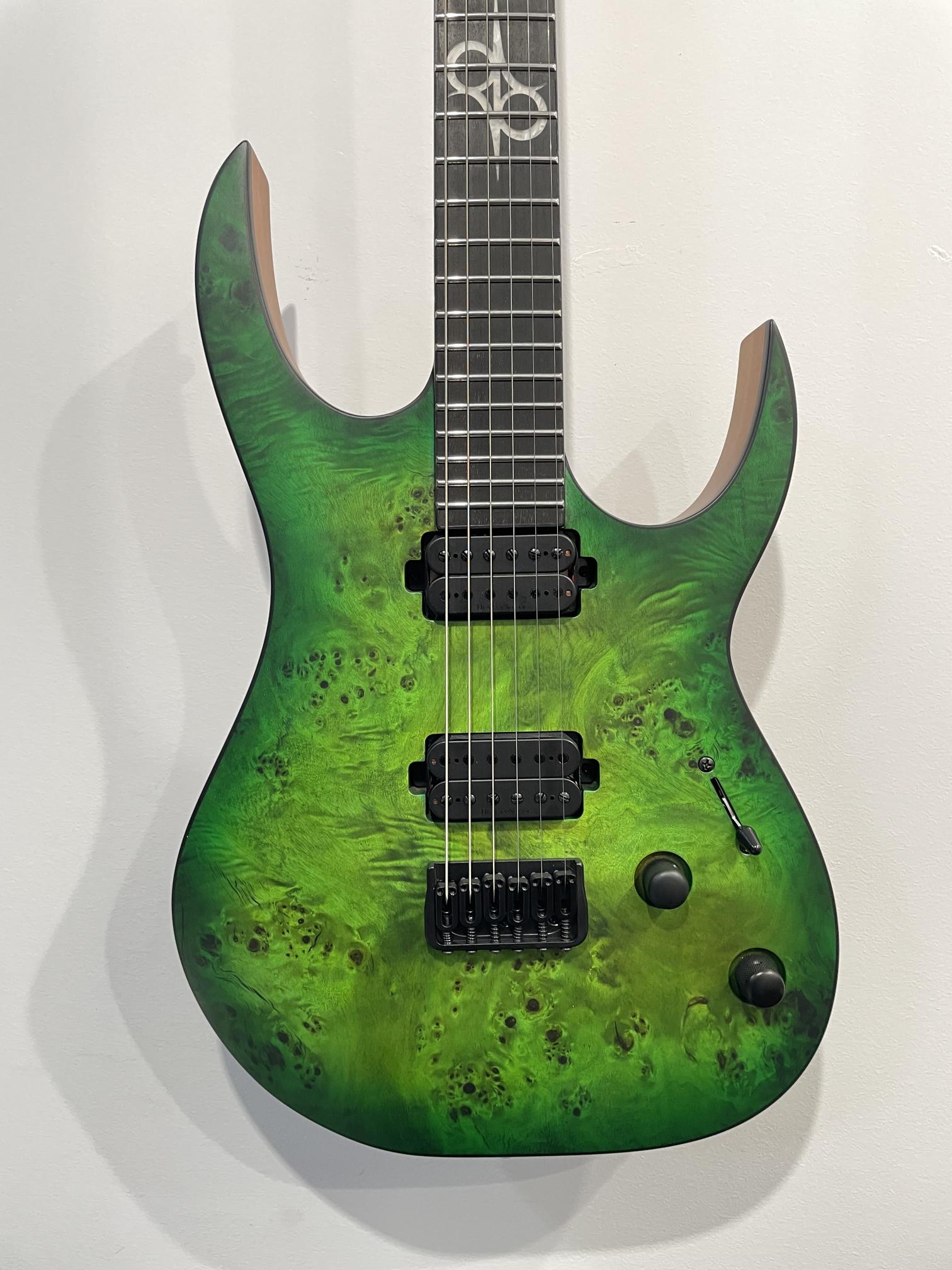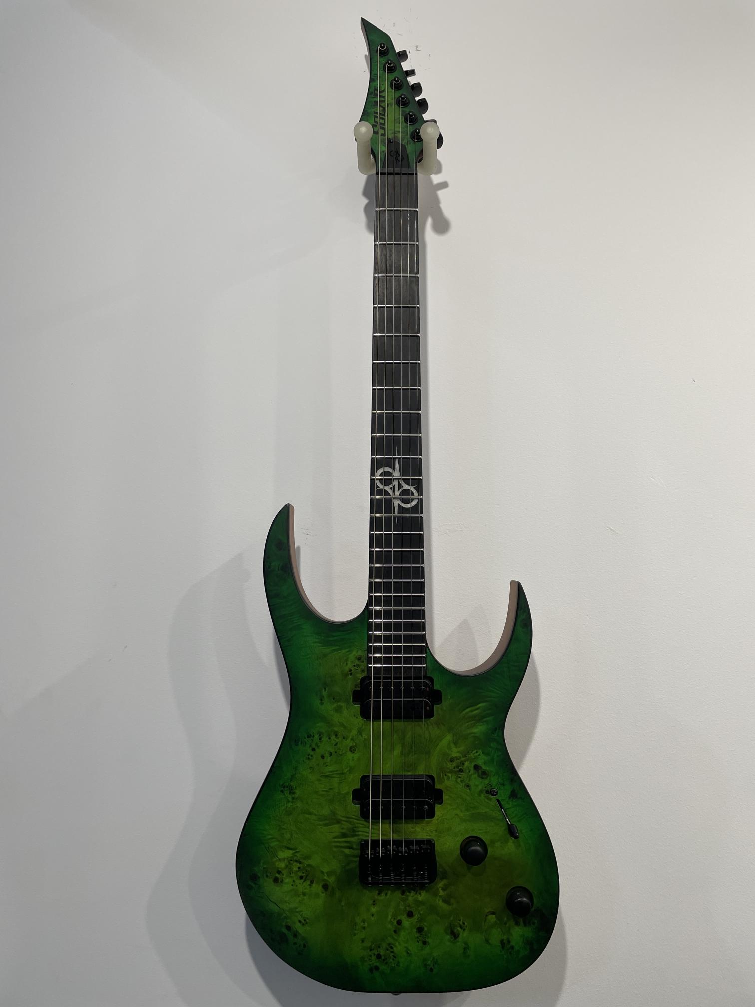This Type S1.6 Poplar Burl guitar combines our dedicated craftsmanship, skill and care for detail with a remarkable feature set, making it the ultimate, precise and professional instrument suitable for both stage and studio work. This S1.6 guitar features a made in the USA Hipshot bridge and is loaded with Duncan Solar pickups that provide a full spectrum of tonal options, from organic clean to heavily overdriven, all with fluid sustain and maximum clarity. The Type S1.6 guitar has a neck-through construction with 25.5” scale, a poplar burl veneer over mahogany body with black binding, a fast C-shaped thin 5-ply mahogany/jatoba neck, an ebony fingerboard with 24 super-jumbo stainless steel frets and Luminlay ‘glow in the dark’ side dots for easy stage use. It comes loaded with Solar 18:1 locking tuners, PPS nut, five-way blade pickup switching and full access neck. Available in lime burst matte finish.