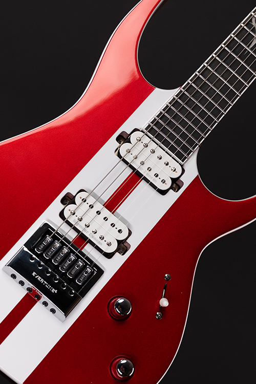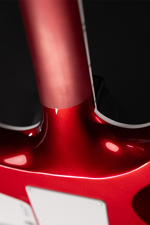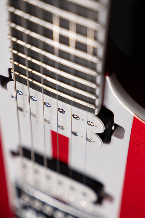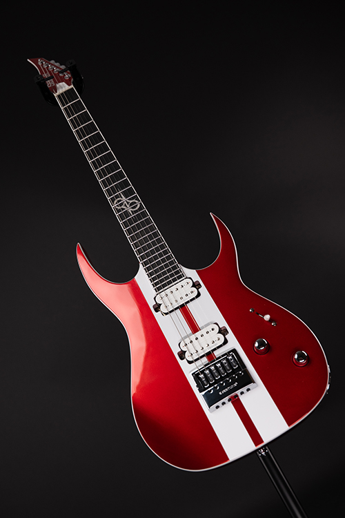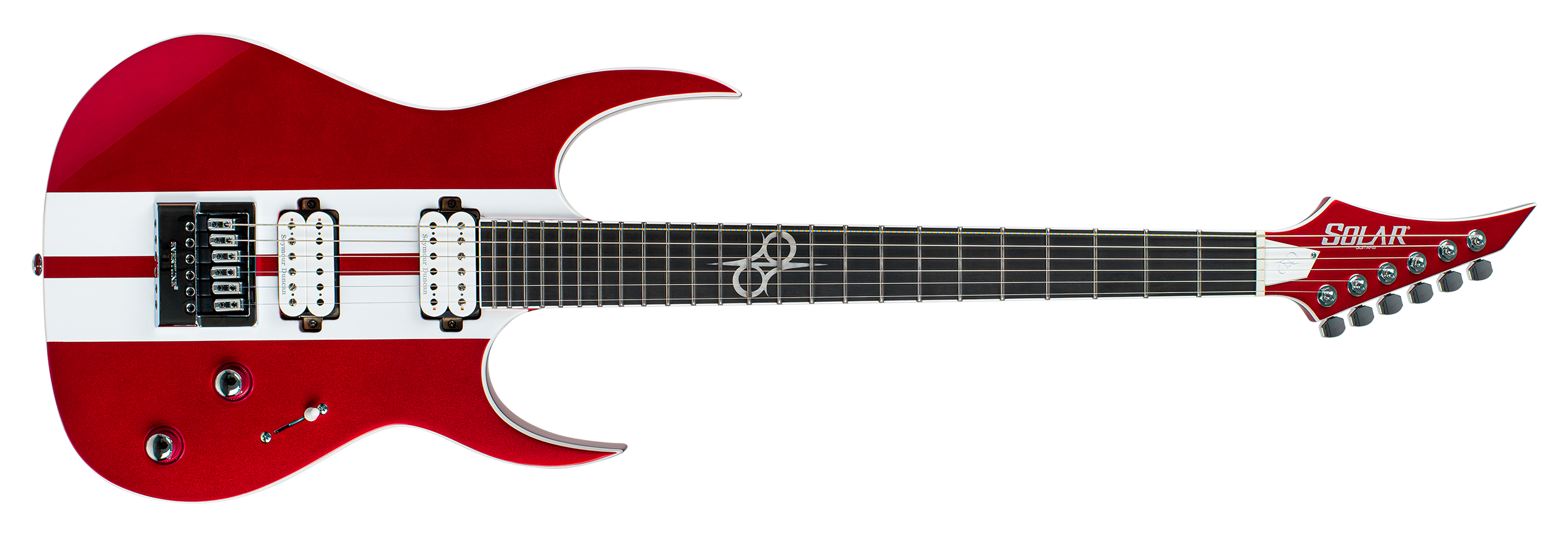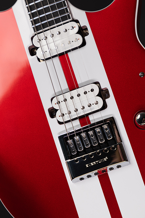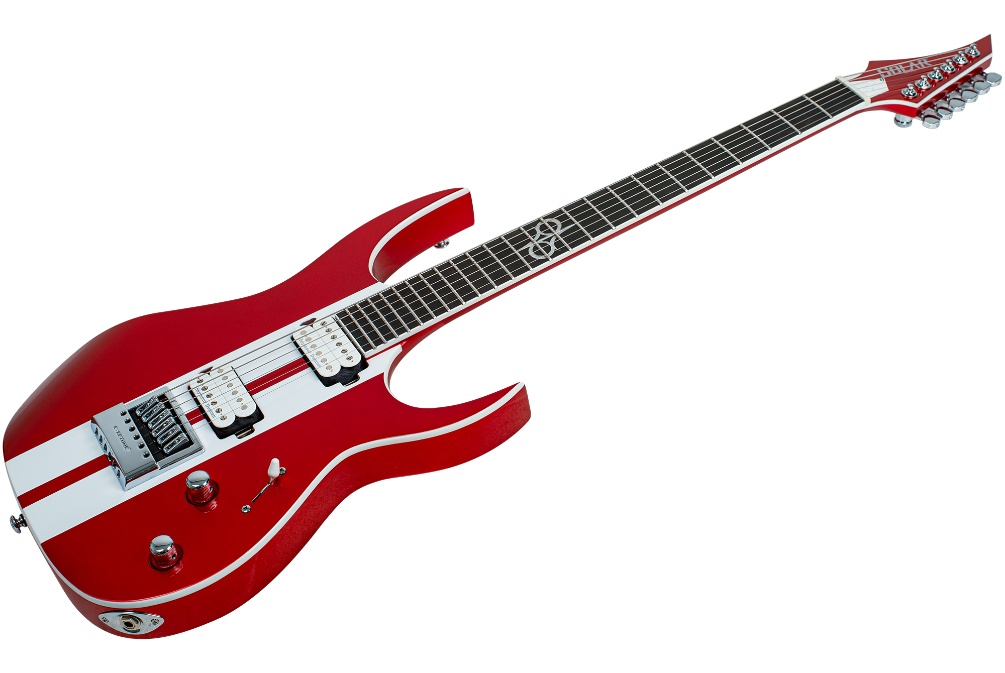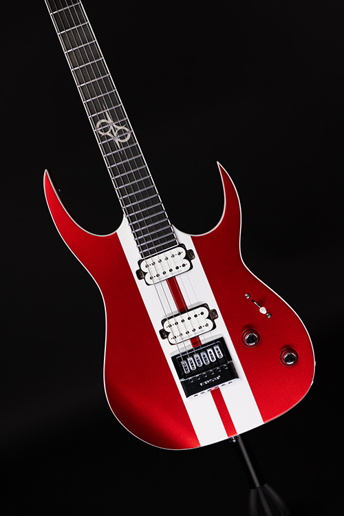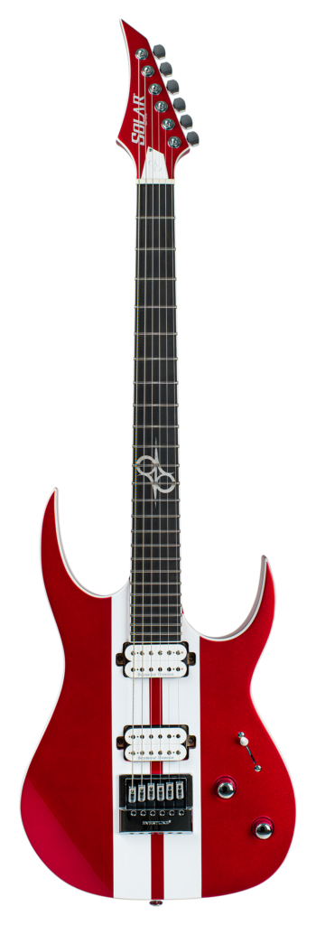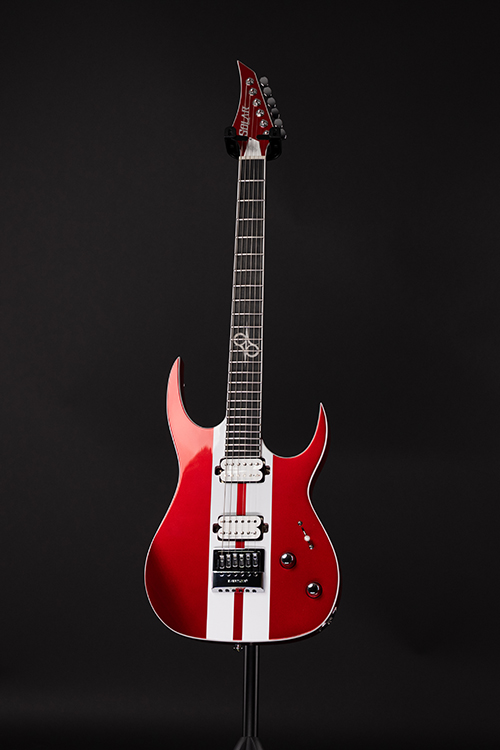 This Type S1.6RS CAR six-string guitar combines our dedicated craftsmanship, skill and care for detail with a remarkable feature set, making it the ultimate, precise and professional instrument suitable for both stage and studio work. The S1.6RS CAR features the Evertune® constant-tension bridge—a reliable, fully-mechanical system that keeps the guitar in tune under any circumstances. It also features a pair of Seymour Duncan USA Distortion pickups (SH6N / SH6B), for maximum crunch and attack . This Type S1.6RS CAR guitar has a set-through construction with 25.5” scale, chrome hardware, an alder body with white binding, a fast C-shaped 3 piece maple neck, an ebony fingerboard with 24 super-jumbo stainless steel frets and Luminlay ‘glow in the dark’ side dots for easy stage use. It comes loaded with Solar 18:1 locking tuners, Graphtech TUSQ XL nut, five-way blade pickup switching and full access neck. Available in candy apple red metallic gloss with white racing stripes finish.
