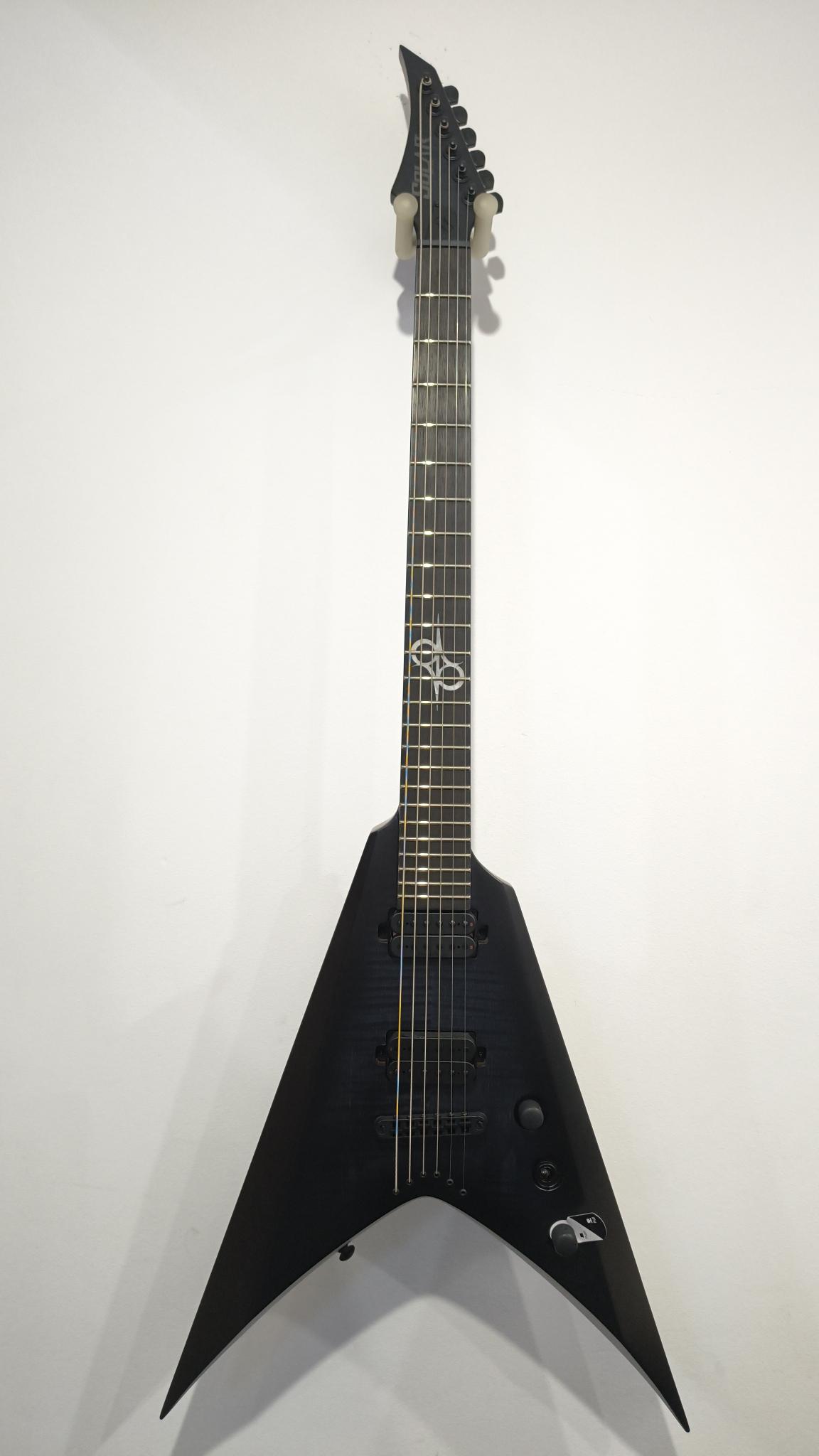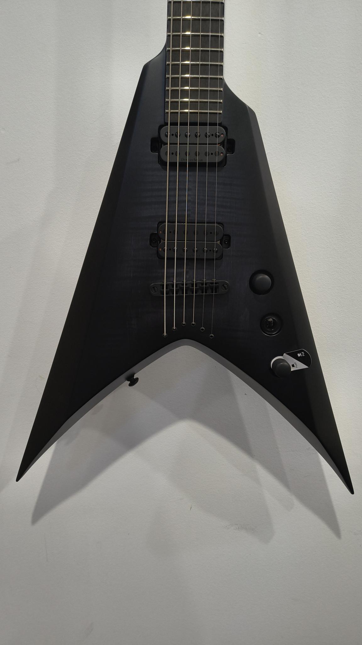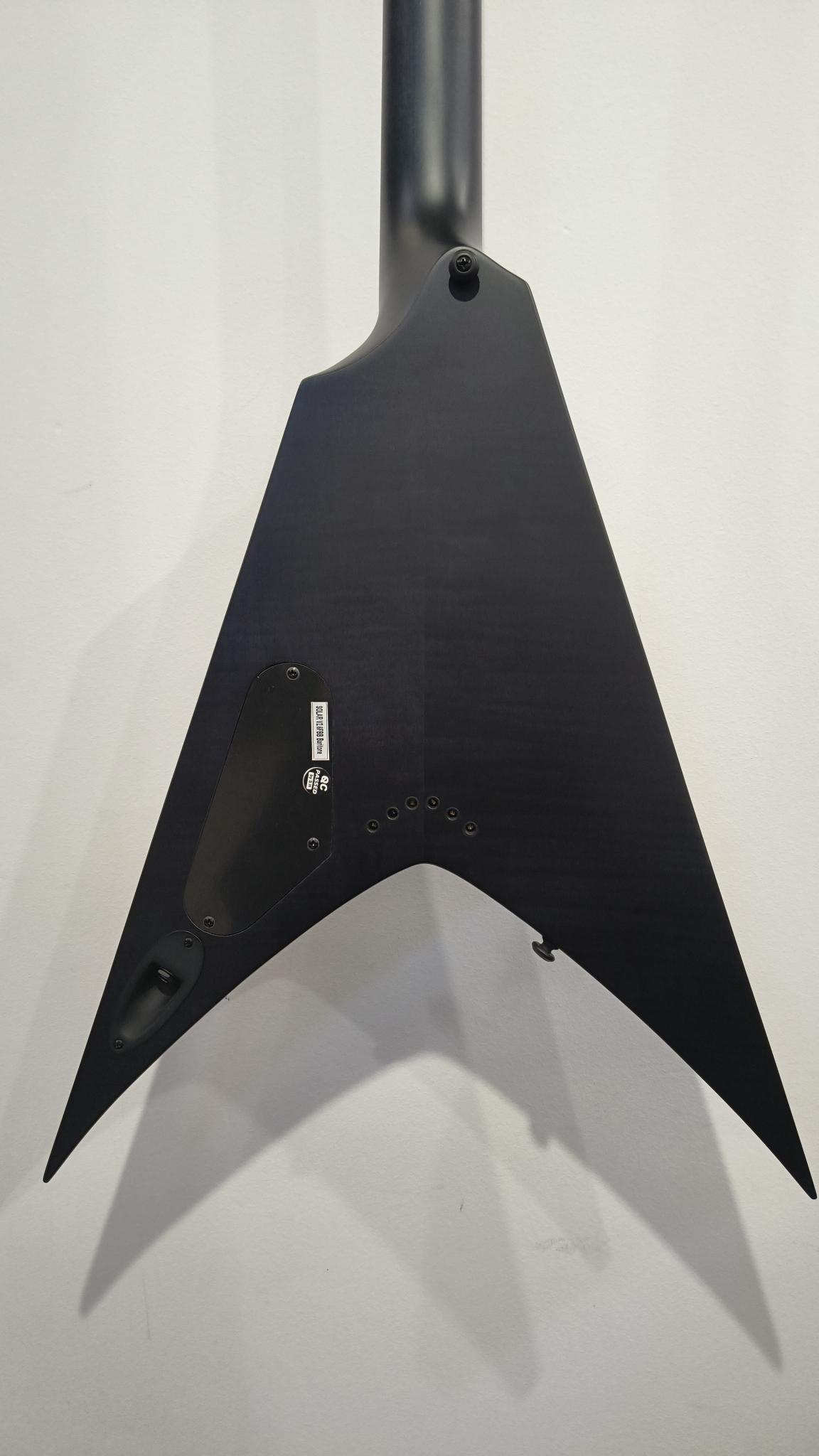 This Type V2.6FBB Baritone guitar will set you apart from everyone else. With its distinctive, stealth looks and feature set, this guitar is a precise, professional instrument suitable for both stage and studio work. Loaded with a reliable string-through-body hardtail bridge and Duncan Solar pickups that provide a full spectrum of tonal options, from organic clean to heavily overdriven, all with fluid sustain and maximum clarity. The Type V2.6FBB Baritone guitar features a set-thru neck/body joint design with 26.5” scale, a mahogany body, a fast, thin, comfortable maple neck, and an ebony fingerboard with 24 super-jumbo frets. It also includes Solar 18:1 tuners, black matte hardware, PPS nut, 3-way toggle pickup switching with push-pull and a full access neck. Shipping in a Solar Type V deluxe gig bag, this guitar is available in Flame Black Burst Matte finish.