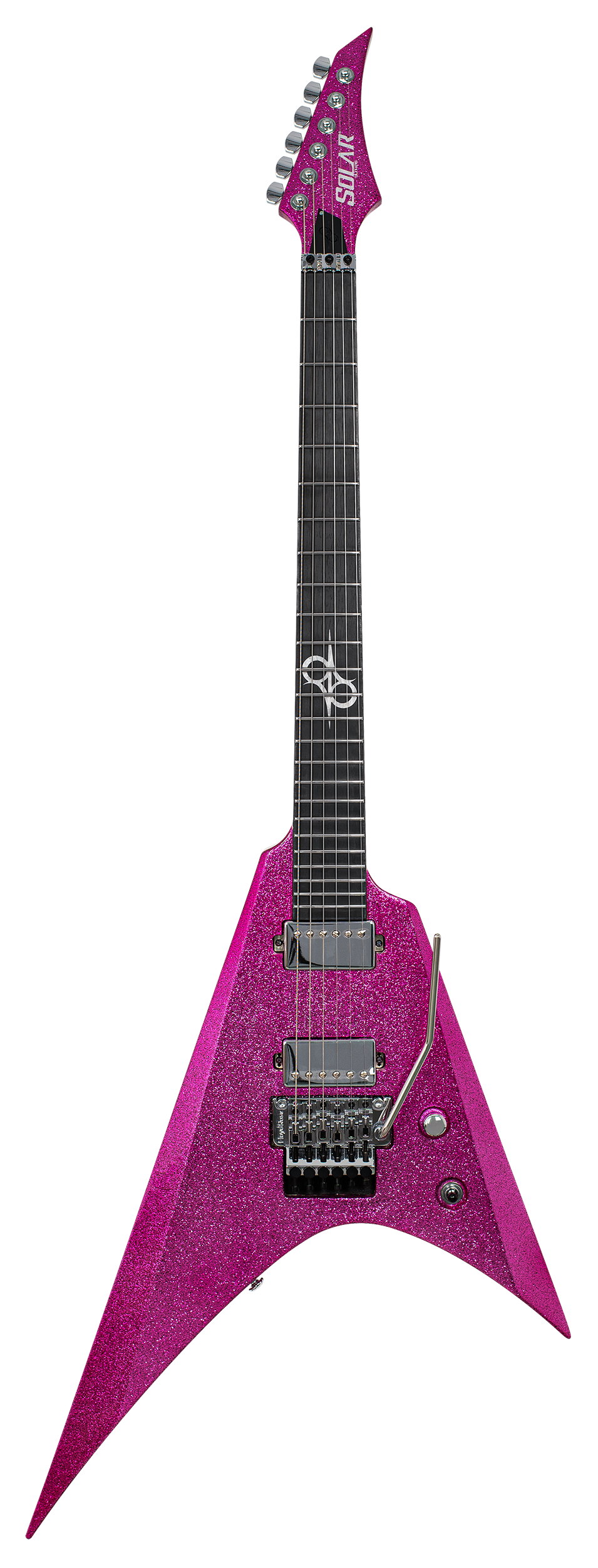 This Type VAR1.6FRPS six-string guitar will set you apart from everyone else. With its distinctive, stealth looks and feature set, this guitar is a precise, professional instrument suitable for both stage and studio work. The reliable Floyd Rose 1000, made of hardened steel combined with an oversized block, offers increased sustain and resonance while all tremolo springs are mechanically muted.It also features a pair of Seymour Duncan USA Distortion pickups (SH6N / TB6B), for maximum crunch and attack .The Type VAR1.6FRPS features a set-thru neck/body joint design with 25.5” scale, alder body, a fast, thin, comfortable maple neck, an ebony fingerboard with 24 super-jumbo stainless steel frets and Luminlay ‘glow in the dark’ side dots for stage use. Loaded with Solar 18:1 locking tuners, 3-way toggle pickup switching and full access neck. Available in pink sparkle gloss with chrome hardware, it also includes a Solar Type VAR Deluxe hardcase.